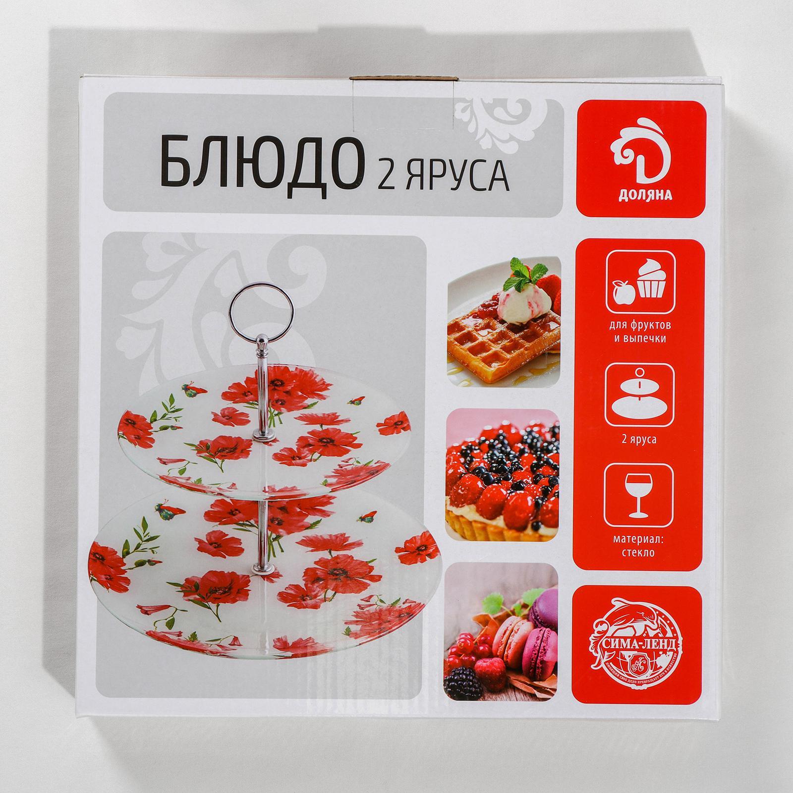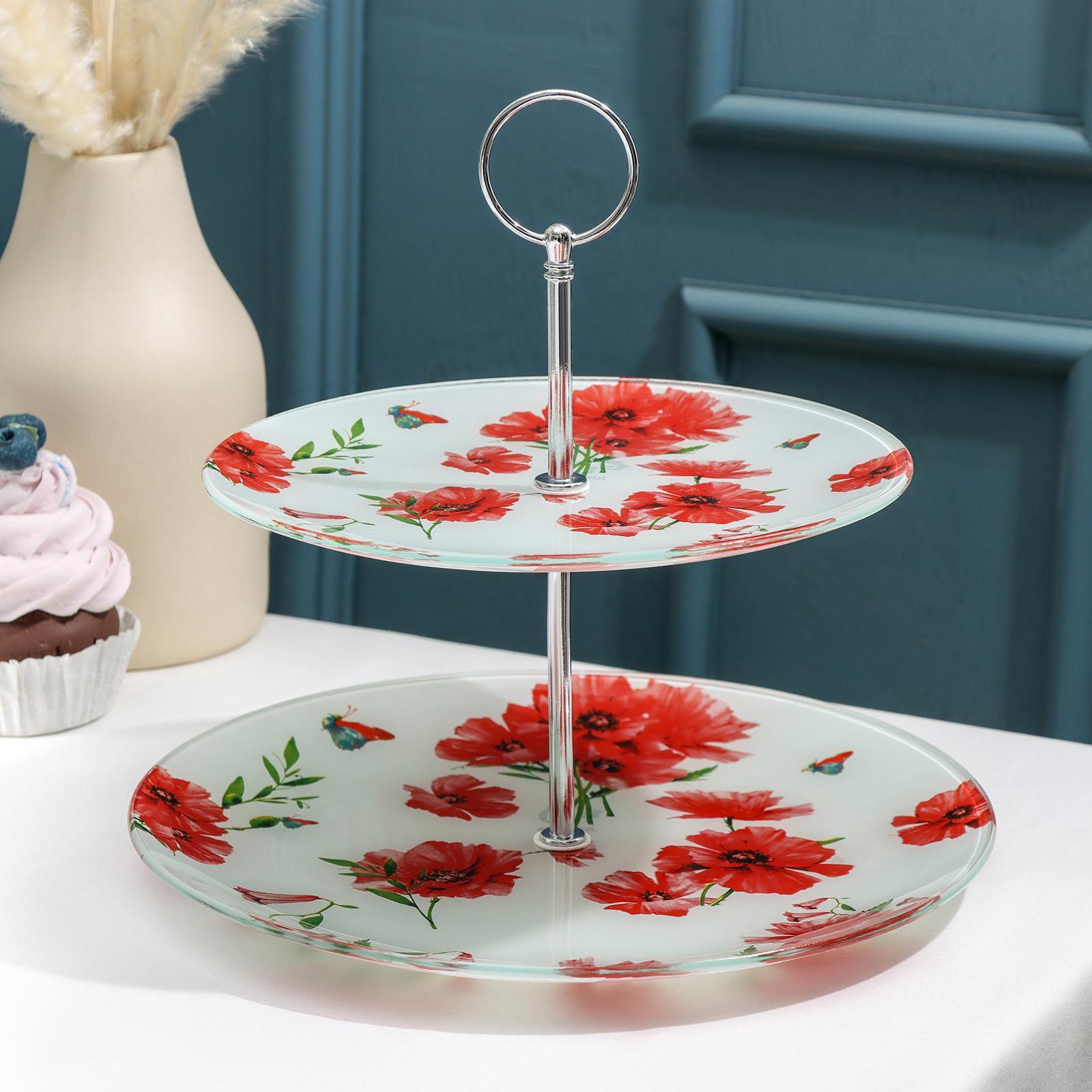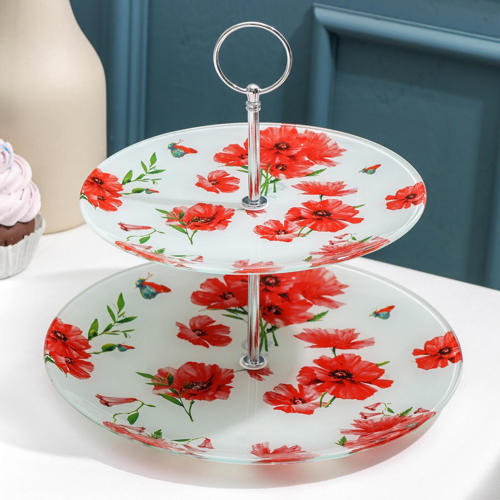 Фруктовница стеклянная двухъярусная круглая доляна «красные маки», D=25/20 см