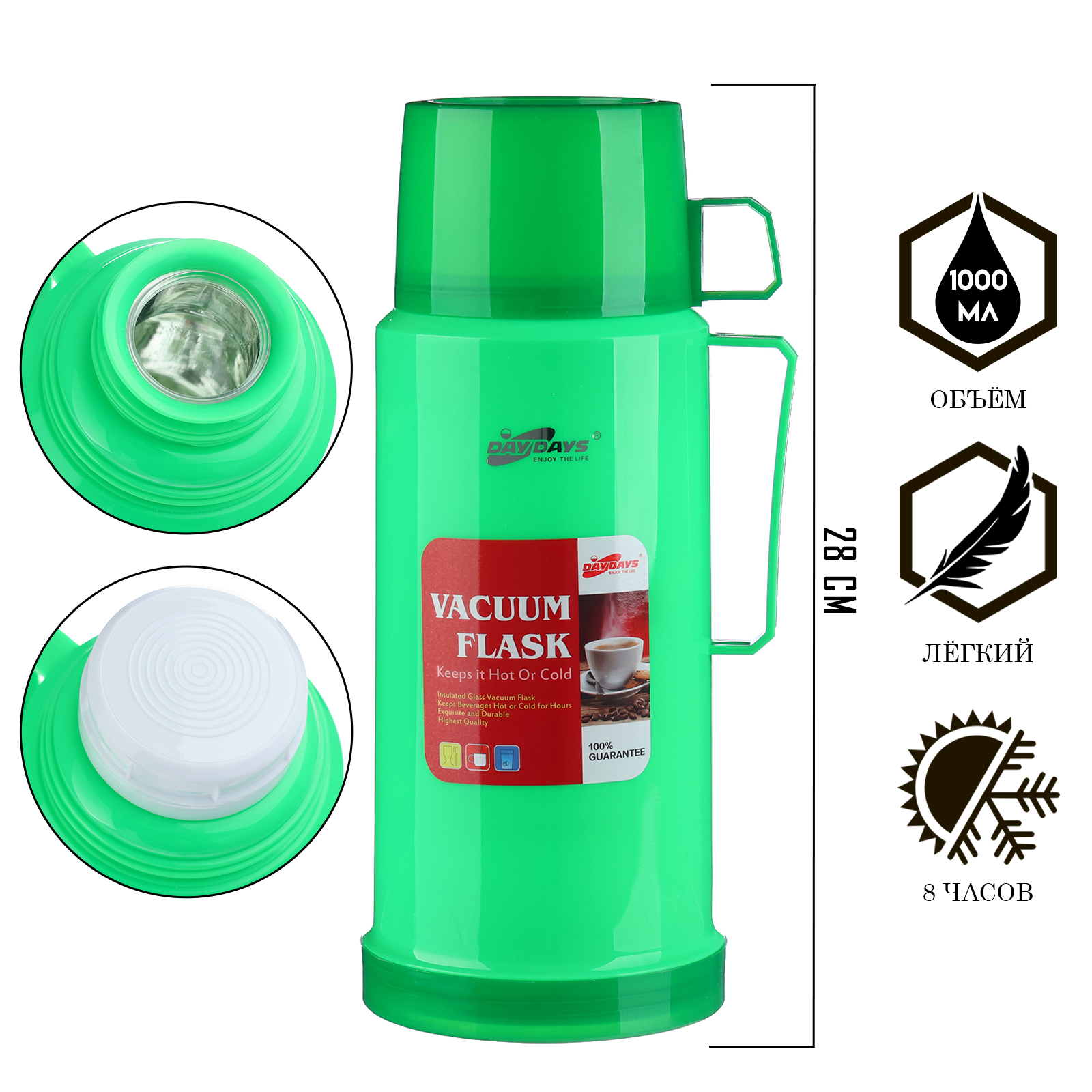 Термос 1 л, со стеклянной колбой, сохраняет тепло 8 ч, 13 х 28 см, зеленый