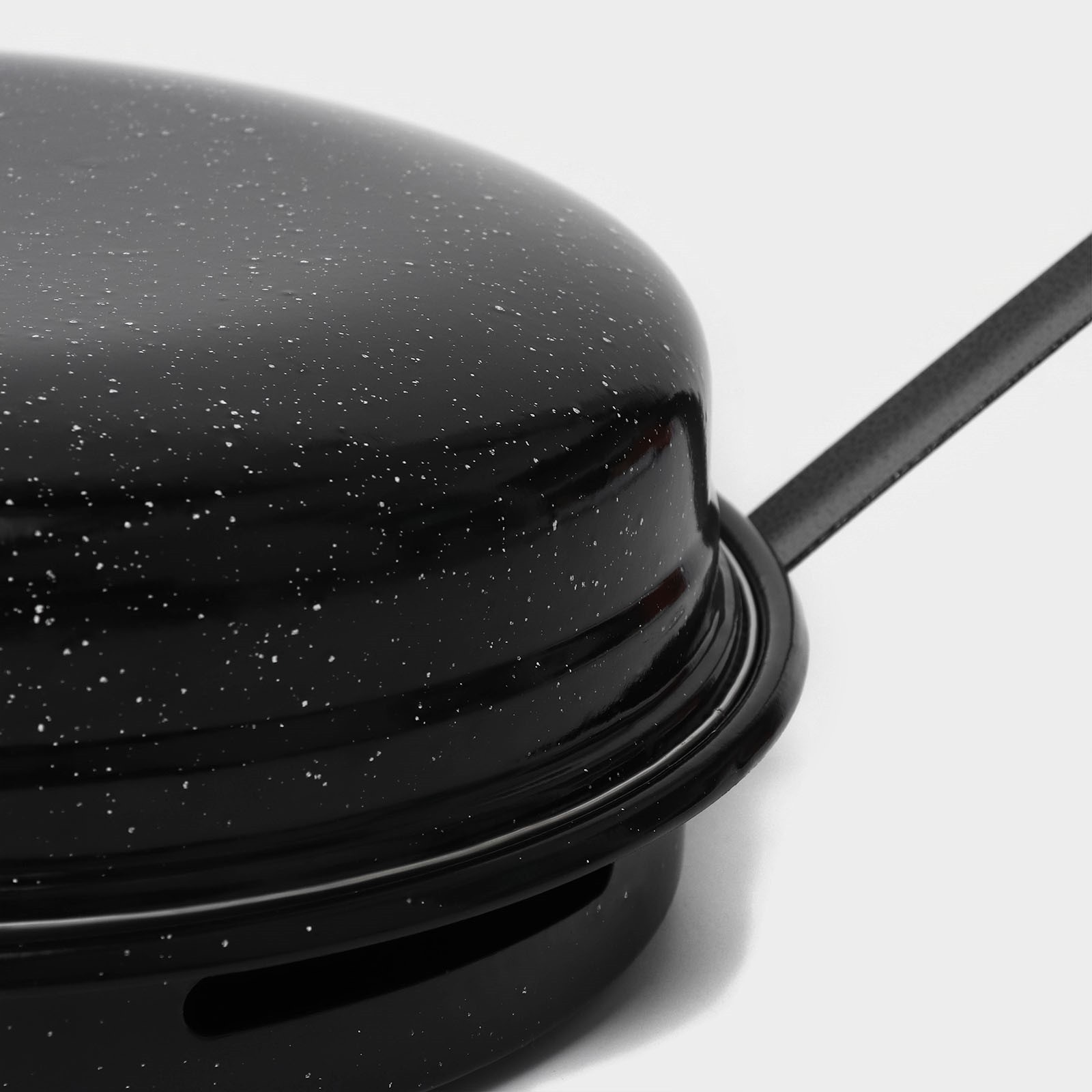 Сковорода- гриль healthy grill, d=33 см, эмалированное покрытие, цвет чёрный. Принцип работы сковороды-гриль для газа основан на конвекции горячего воздуха, как в мангале. Здесь нет дыма и вредных канцерогенов, не нужно добавлять масло или жир. Еда получается более полезной и натуральной. За счёт специальной формы посуды внутренняя часть нагревается, а в ёмкости образуется очень горячий воздух, который циркулирует естественным путём. Раскалённые пары всё время поднимаются наверх, вытесняя более холодный воздух. Как готовить Поставьте нижний поддон с отверстием на газовую конфорку так, чтобы отверстие оказалось над горелкой. Налейте на дно немного воды, чтобы капающий с продуктов жир не пригорал к посуде, а продукты во время готовки не пересыхали. Если не хотите, чтобы внутри образовывался влажный воздух, воду не наливайте, а застелите дно фольгой. Установите решётку. Можно немного смочить изделие маслом с помощью салфетки. Зажгите конфорку и прикрутите до среднего уровня. Не используйте сковороду на сильном пламени. Разложите на решётке продукты — маринованное мясо, кусочки рыбы, шашлык на шпажках, целые или фаршированные шляпки грибов. Овощи можно запекать на фольге, чтобы сохранить их сочность. Не заходите за край решётки, а между продуктами оставляйте небольшие промежутки для воздуха. Можно готовить одновременно мясо и овощи, но не смешивайте продукты с противоположными вкусами и ароматами. Накройте поддон крышкой и готовьте на среднем огне. Овощам достаточно 10–15 минут, рыбе — 25–30 минут, мясу — 35–50 минут. Время приготовления зависит от размеров, маринада и вида мяса. Крышку можно открыть и проверить готовность блюда, если требуется, переверните куски. Будьте аккуратны — внутри очень горячий воздух. Цвет: Чёрный Форма: Круглая Диаметр, см: 33 Крышка: Да Материал крышки: Углеродистая сталь Материал: Углеродистая сталь Съёмная ручка: Нет Тип покрытия: Эмалированное Тип плиты: Для газовой плиты Капсульное дно: Нет Вид сковороды: Сковорода-гриль Можно мыть в посудомоечной машине: Нет Форма: Круг, шар, цилиндр  развернуть описание ▼
