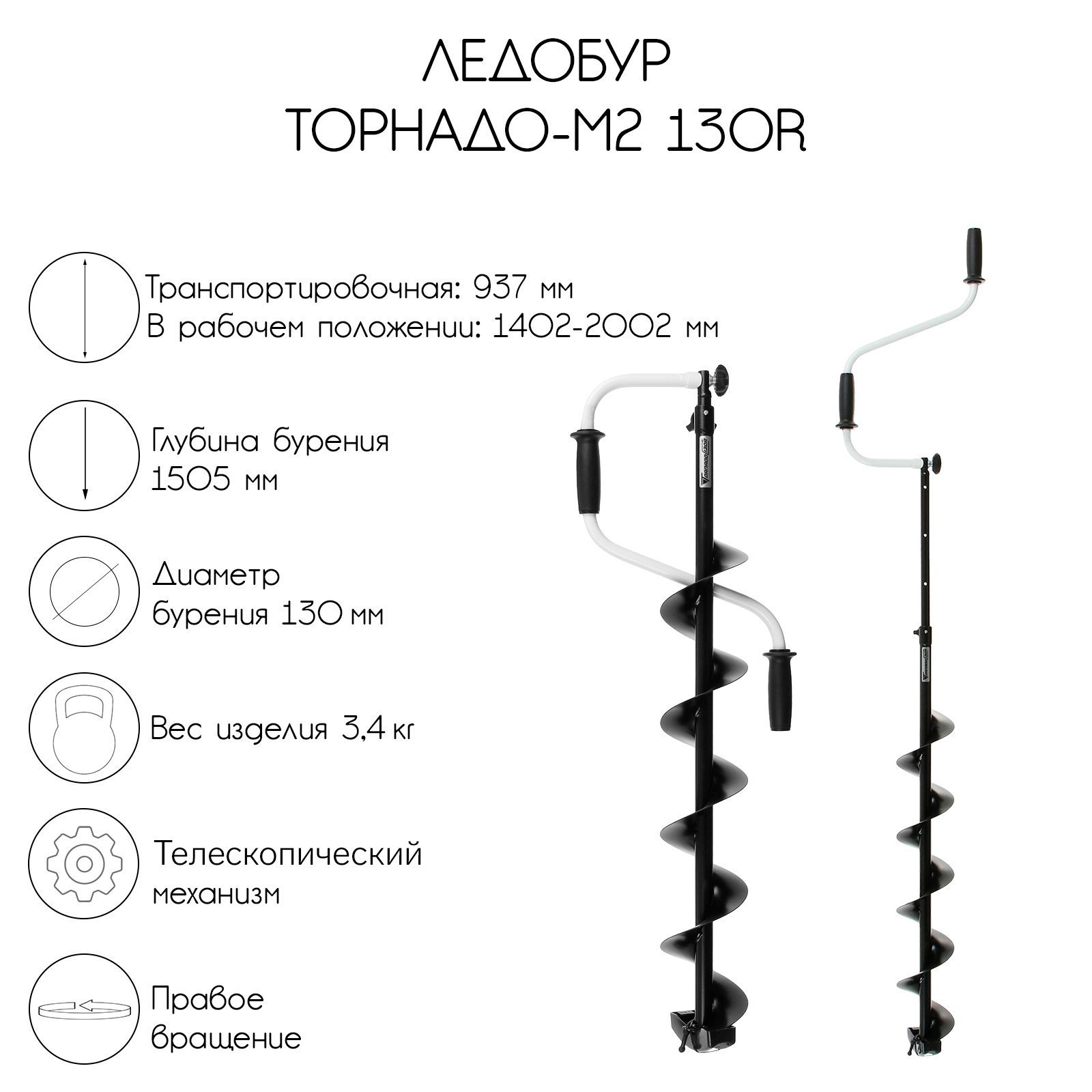 Ледобур торнадо-м2 130r, правое вращение, без чехла, lt-130r-1. Ледобур «ТОРНАДО-М2 130R» с правым вращением. Надёжный и удобный в эксплуатации ледобур с телескопической штангой-удлинителем легко справится с бурением льда толщиной до 1, 5 м. Усиленный винт-барашек с измененным шагом резьбы на деталях замка, что позволило решить проблему с самопроизвольным откручиванием барашка и ослаблением замка. Запатентованный замок «ласточкин хвост» надёжно фиксирует ручку в разложенном состоянии, не давая люфта. Верхняя рукоятка ледобура смещена относительно оси ледобура на 101 мм, а нижняя на 169 мм. Такое расположение рукояток позволяет вращать ледобур одновременно двумя руками, тем самым увеличивая скорость бурения лунок во льду. Телескопическая вставка-удлинитель позволяет комфортно бурить лёд, подстраивая ледобур под рост рыболова. Возможно ступенчато увеличивать глубину бурения до полутора метров. Для использования при бурении шуруповёрта необходимо доукомплектовать шнек адаптером АШ-02. Для более глубокого льда шнек можно нарастить удлинителем адаптера под шуруповерт УА-800. Штанга-удлинитель «ТОРНАДО-М2» и шнек покрашены полимерной порошковой краской. Ручки изготовлены из жёсткой пластмассы, остающейся тёплой на ощупь даже при сильных морозах. По сравнению с классическими моделями ледобуров, шаг витков шнека этой модели увеличен на 10%, что обеспечивает более быстрое освобождение лунки от шуги, снижает усилие бурения, а также предотвращает заклинивание шнека. Ледобур покрыт полимерной порошковой краской, обладающей высокими показателями стойкости. Чехол в комплект не входит. Технические характеристики Правое вращение. Диаметр бурения: 130 мм. Глубина бурения: до 1505 мм. Длина в рабочем положении: 1402 – 2002 мм. Длина в сложенном положении: 937 мм. Комплект поставки Ледобур в сборе: 1 шт. Ножи: 2 шт. Винт М6х12 ГОСТ 17475-80: 4 шт. Футляр защитный: 1 шт. Паспорт: 1 шт. Диаметр, мм: 130 parts count: 0 Глубина бурения, м: 1.5 Вес, кг: 3.4 Транспортная длина, см: 93.5 Температурное ограничение: Нет Тип: Ледобур Вид ледобура: Телескопический Вид ледобура: Двуручный Направление вращения: Правое (по часовой стрелке)  развернуть описание ▼