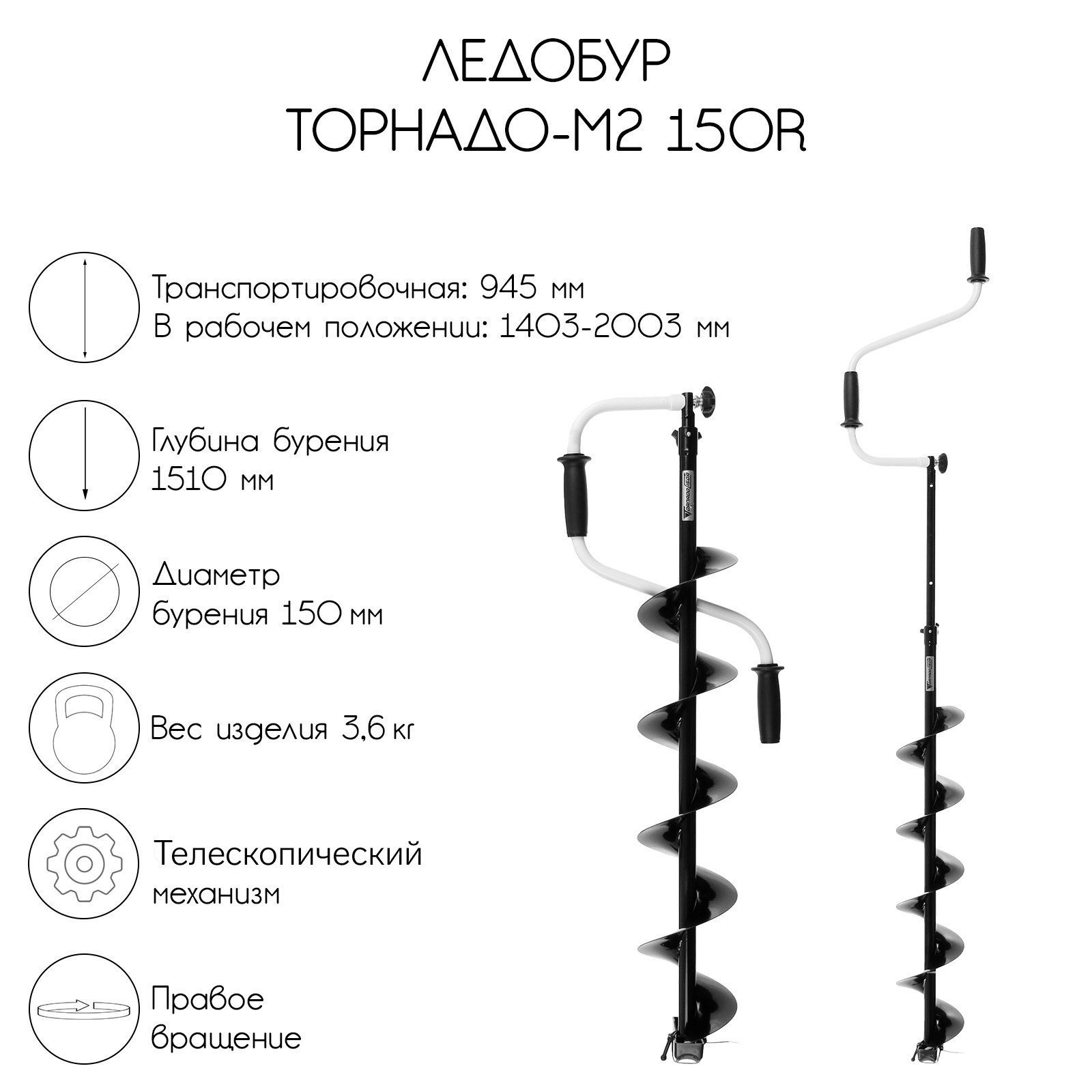 Ледобур торнадо-м2 150r, правое вращение, без чехла, lt-150r-1. Ледобур «ТОРНАДО-М2 150(R)» с правым вращением и телескопической штангой-удлинителем легко справится с бурением льда толщиной до 1, 5 м. Усиленный винт-барашек с измененным шагом резьбы на деталях замка позволил решить проблему с самопроизвольным откручиванием барашка и ослаблением замка. Запатентованный замок «ласточкин хвост» надёжно фиксирует ручку в разложенном состоянии, не давая люфта. Верхняя рукоятка ледобура смещена относительно оси ледобура на 101 мм, а нижняя на 169 мм. Такое расположение рукояток позволяет вращать ледобур одновременно двумя руками, тем самым увеличивая скорость бурения лунок во льду. Телескопическая вставка-удлинитель позволяет комфортно бурить лед, подстраивая ледобур под рост рыболова. Возможно ступенчато увеличивать глубину бурения до полутора метров. Для использования при бурении шуруповёрта необходимо доукомплектовать шнек адаптером АШ-02 или АШ-03. Мотобур с диаметром входного вала 22 мм подсоединяется через удлинитель шнека УШМ-250 или УШМ-400. Для бурения более глубокого льда шнек можно нарастить удлинителем адаптера под шуруповёрт УА-800. Штанга-удлинитель «ТОРНАДО-М2» и шнек покрашены полимерной порошковой краской. Ручки изготовлены из жёсткой пластмассы, остающейся тёплой на ощупь даже при сильных морозах. По сравнению с классическими моделями ледобуров, шаг витков шнека этой модели увеличен на 10%, что обеспечивает более быстрое освобождение лунки от шуги, снижает усилие бурения, а также предотвращает заклинивание шнека. Технические характеристики Правое вращение. Диаметр бурения: 150 мм. Глубина бурения: до 1510 мм. Длина в рабочем положении: 1403 - 2003 мм. Длина в сложенном положении: 945 мм. Масса без чехла: 3, 6±0, 2 кг. Комплект поставки Ледобур в сборе: 1 шт. Ножи: 2 шт. Винт М6х12 ГОСТ 17475-80: 4 шт. Футляр защитный: 1 шт. Паспорт: 1 шт. Диаметр, мм: 150 parts count: 0 Глубина бурения, м: 1.51 Вес, кг: 3.6 Транспортная длина, см: 93.5 Температурное ограничение: Нет Тип: Ледобур Вид ледобура: Телескопический Вид ледобура: Двуручный Направление вращения: Правое (по часовой стрелке)  развернуть описание ▼
