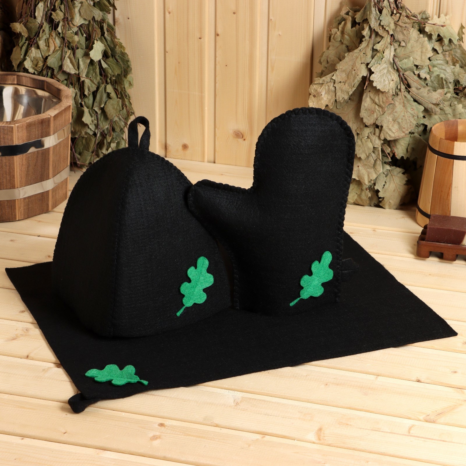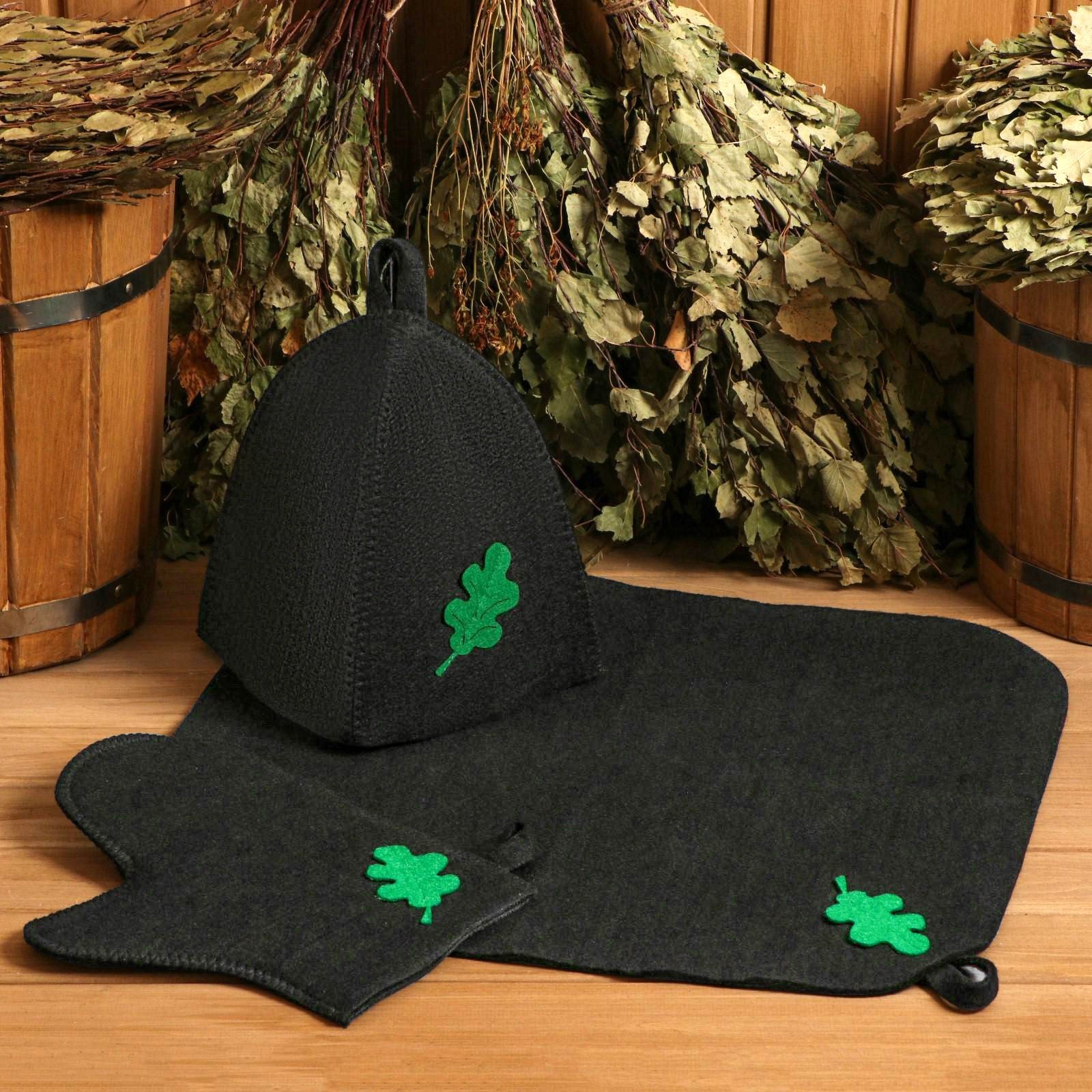 Набор для бани с аппликацией «дубовый лист», 3 предмета: шапка, коврик, рукавица, войлок, тёмный. Для комфортного отдыха в парной возьмите с собой набор банных принадлежностей. Предметы из этого комплекта предохраняют тело от перегрева и являются средствами индивидуального пользования. Влажные изделия рекомендуется сушить в расправленном виде на горизонтальной поверхности. Принадлежности из войлока и фетра стирайте вручную при температуре воды 30 °C. В наборе, шт.:3|Возраст:Взрослый|Материал:Экофетр|Содержание шерсти:0%|Составляющие набора:Рукавица|Составляющие набора:Шапка|Составляющие набора:Коврик|Страна:Россия  развернуть описание ▼