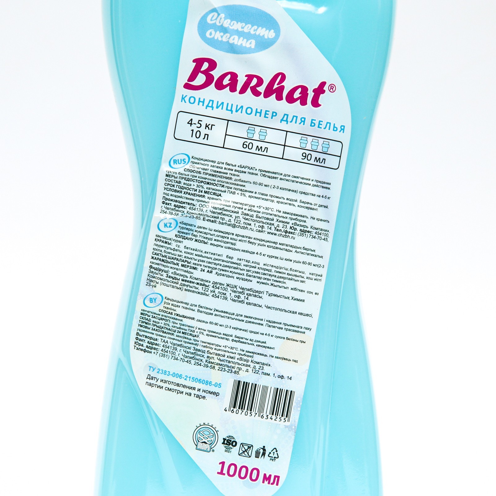 Кондиционер для белья "бархат" свежесть океана, 1000 мл.   Кондиционер для белья Бархат, "Свежесть океана", 1000 мл. Гарантируют мягкость, нежность и долговечность тканей любых видов. Обладают антистатическим эффектом. Защищают ткань, препятствует скатыванию ворсинок. Придают свежесть и приятный, легкий аромат вещам.  Состав: вода >30%, катионный ПАВ <5%, ароматизатор, краситель, консервант.  Объём, л: 1 Аромат: Океанская свежесть Назначение: Для всех видов тканей : 0 Особенности средства: Антистатический эффект  развернуть описание ▼