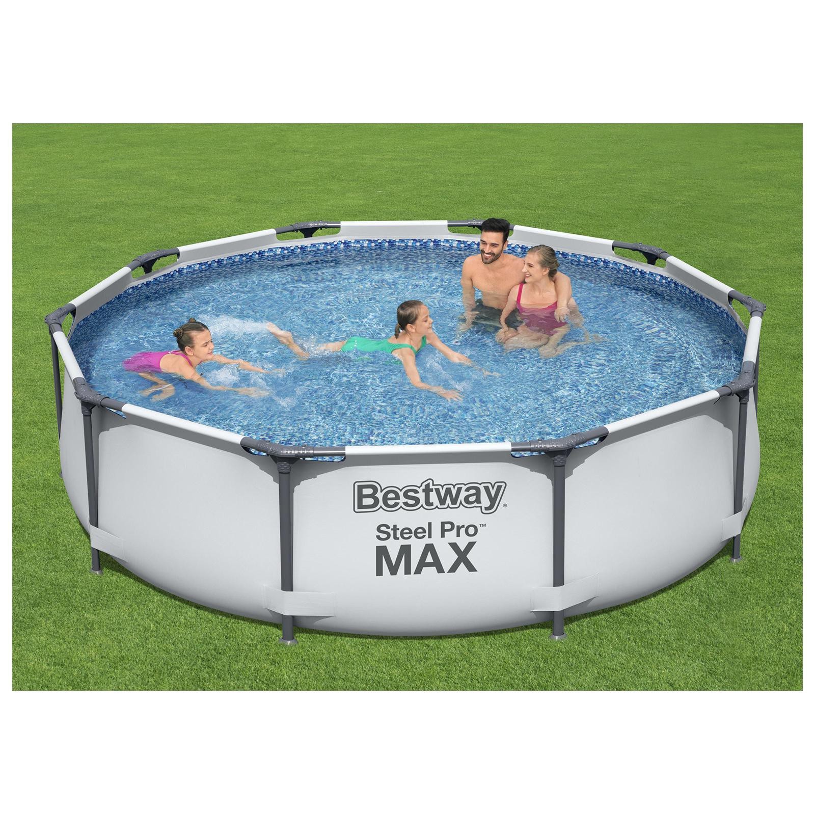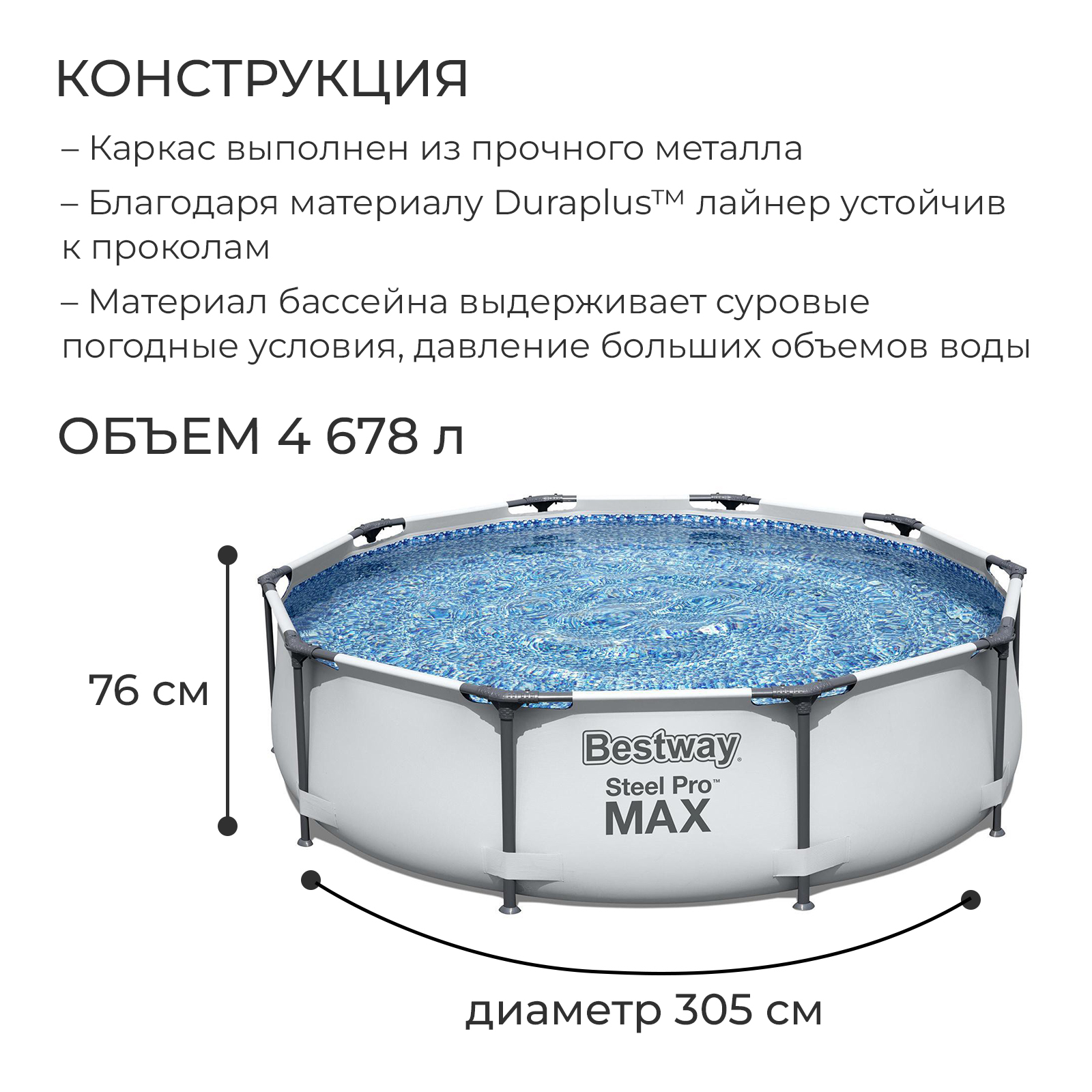 Бассейн каркасный steel pro max, 305 х 76 см, с фильтр-насосом, 56408 bestway. Бассейн быстро устанавливается благодаря простой системе сборки труб. Никаких дополнительных инструментов не требуется. Металлическая трубчатая конструкция удерживает давление воды в бассейне, сохраняя его устойчивость и стабильность во время использования. Бассейн необходимо установить на ровную поверхность, удалив предметы, которые могут повредить дно. Благодаря материалу Duraplus™ лайнер устойчив к проколам. Два слоя 3-слойного армированного ПВХ с полиэстеровой сеткой в центре повышают долговечность, устойчивость к ультрафиолетовым лучам. Высокая прочность материала и соединение швов выдерживают большие нагрузки. Технология Framelink System™ обеспечивает противокоррозионное действие между соединениями. Это уменьшает образование ржавчины. В комплекте к бассейну входит: фильтр-насос с картриджем. Конструкция Лайнер: изготовлен из Dura-plus™Боковые опорные ленты: изготовлены из Dura-plus™Дно: изготовлено из ПВХ Форма: Круглая Диаметр, см: 305 Длина, см: 305 Ширина, см: 305 Высота, см: 76 Наличие насоса: Да Тип фильтра для насоса: Фильтр-картридж Количество слоёв: 3 Производительность, л/ч: 1249 Объём, л: 4678 Тент: Нет Подстилка: Нет Лестница: Нет : 0 Диспенсер: Нет Наличие фильтр-насоса: Да  развернуть описание ▼