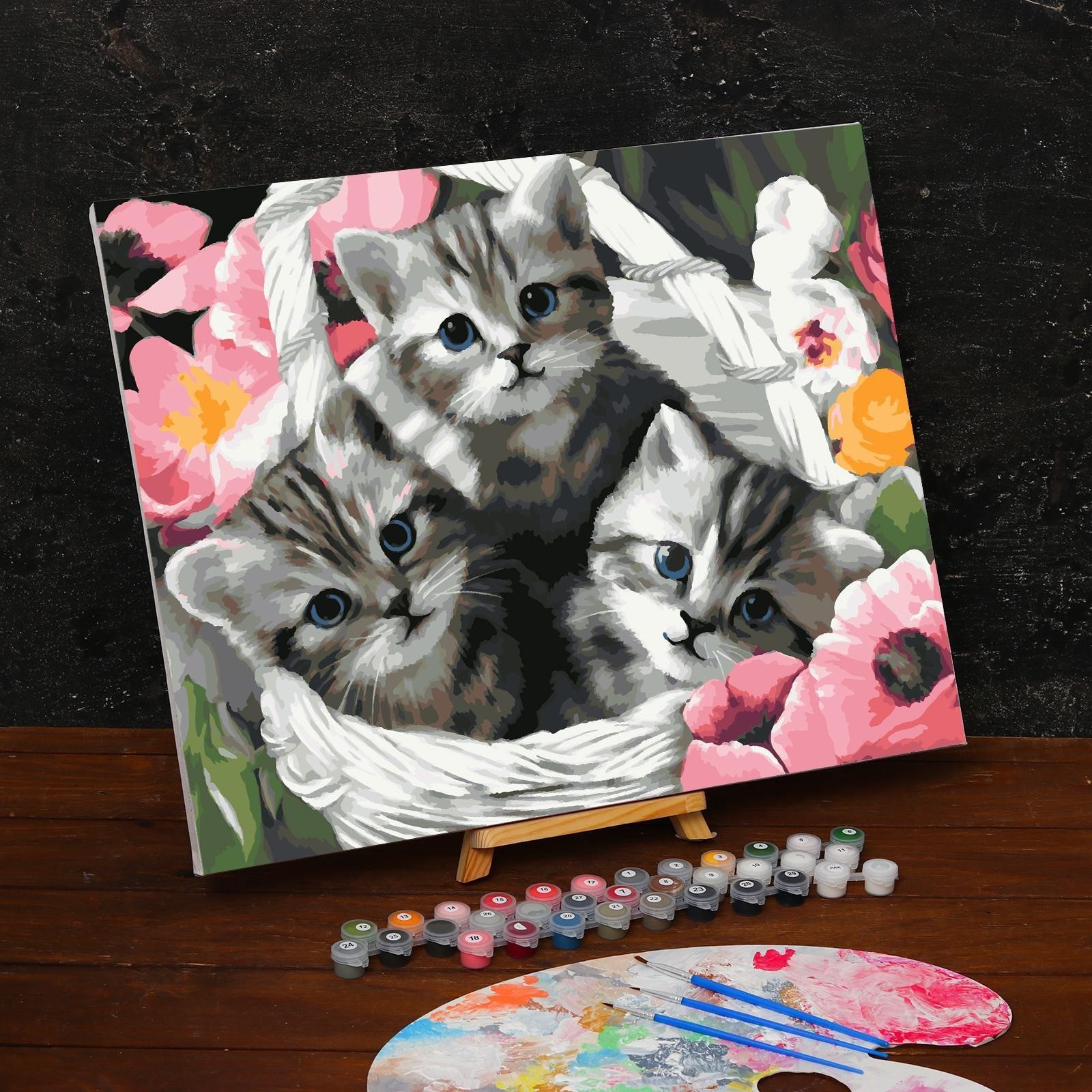 Картина по номерам на холсте с подрамником «котята», 40 х 50 см. Набор для рисования станет находкой для людей, которые хотят творить! Специально разработанная уникальная серия росписи по номерам станет верным помощником начинающим художникам, с помощью которой они будут создавать настоящие шедевры изобразительного искусства! Написанная своими руками картина украсит интерьер или станет прекрасным подарком для родных и близких людей. Картина по номерам на холсте с подрамником «Котята», 40 х 50 см понравится и детям, и взрослым. Холст разделён на множество мелких фрагментов, на каждом из которых указано число, соответствующее цвету, которым нужно закрасить данный участок. В набор входят все необходимые оттенки красок, каждый из которых пронумерован. Поначалу, когда вы только возьмёте холст в руки, будет сложно представить, что за чудесная картина получится в итоге! Но уверяем вас, результат превзойдёт все ожидания. Полотно с множеством оттенков, теней и красок будет выглядеть так, словно оно из музея. Раскрашивание по номерам покорило сердца миллионов людей по всему миру, ведь с ним каждый может создать шедевр! Присоединяйтесь к этому увлекательному занятию, творите и наслаждайтесь результатами. Количество цветов:24|Для кого:Унисекс|Размер, см:40 х 50|Возраст:Для взрослых|Тематика:Животный мир|Символ года:Нет|Ориентация изображения:Горизонтально|Вид:Холст под роспись|Темпер. ограничение НЕ НИЖЕ :-50|Уровень сложности:Сложный|Комплектация набора:С кисточками|Комплектация набора:С красками|Страна:Россия  развернуть описание ▼