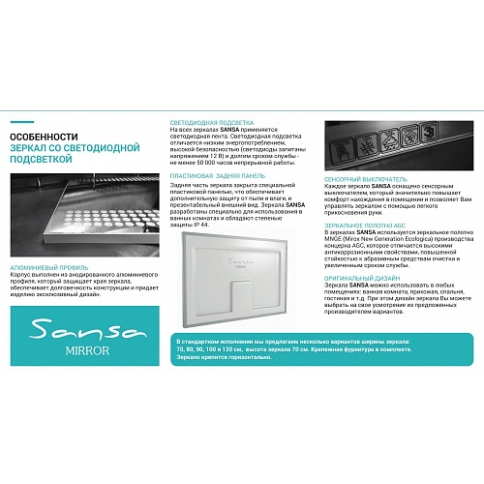 Зеркало sansa dream 100 alum, с подсветкой. Зеркало Dream - это стильное и функциональное решение для интерьера. Зеркало Dream выполнено из прочного и влагостойкого материала - полотна с амальгамой на основе серебра. Это обеспечивает долговечность и надежность изделия. Особенностью зеркала является его подсветка. В комплект входит источник питания, который стабилизирует напряжение (трансформатор), что позволяет подключить изделие к сети 220В. Выключатель сенсорный многорежимный позволяет регулировать интенсивность светодиодной подсветки, создавая комфортную атмосферу в помещении. Зеркало имеет прямоугольную форму и серебристый цвет рамы, которая выполнена из металла. Фацет на зеркале добавляет изысканности и стиля. Зеркало поставляется в собранном виде и готово к подключению к сети 220В. Форма: Прямоугольная Ширина, мм: 1000 Глубина, мм: 30 Высота, мм: 700 Мощность, Вт: 12 Материал корпуса: Стекло Подсветка: Да Вид зеркала: Настенное Особенность зеркала: С подсветкой С полочкой: Нет Форма: Прямоугольник  развернуть описание ▼