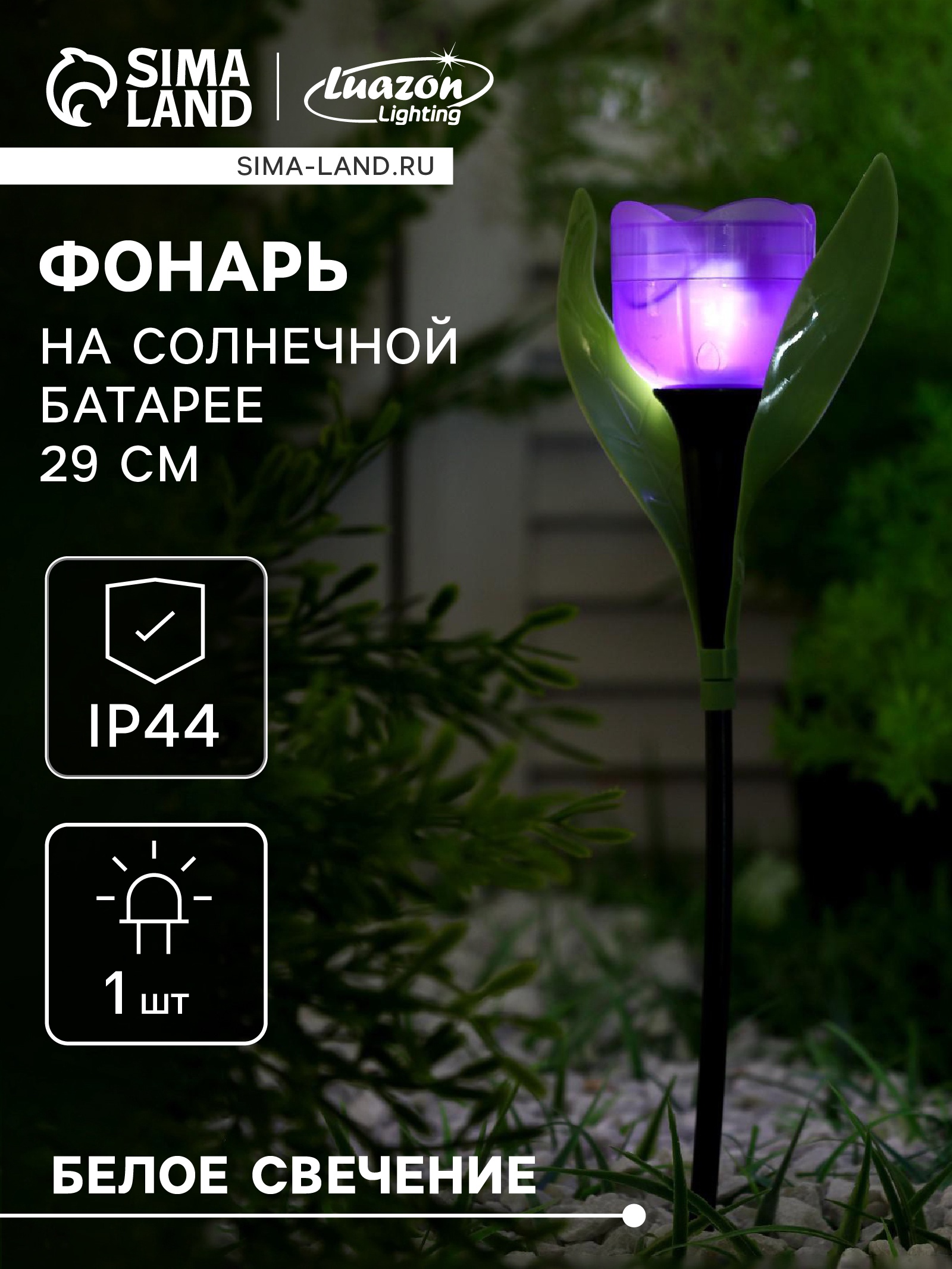 Садовый светильник «тюльпан фиолетовый», уличный, на солнечной батарее, 4.5 29 4.5 см, 1 led, свечение белое. Цвет свечения:Белый|Количество ламп:1|Цоколь:Встроенные LED|Высота, см:29|Гарантийный срок, мес.:6|Степень защиты:IP44|Материал основания:Пластик|Цвет корпуса:Фиолетовый|Температурный режим:от -10 до +35 °С|Страна:Китай  развернуть описание ▼