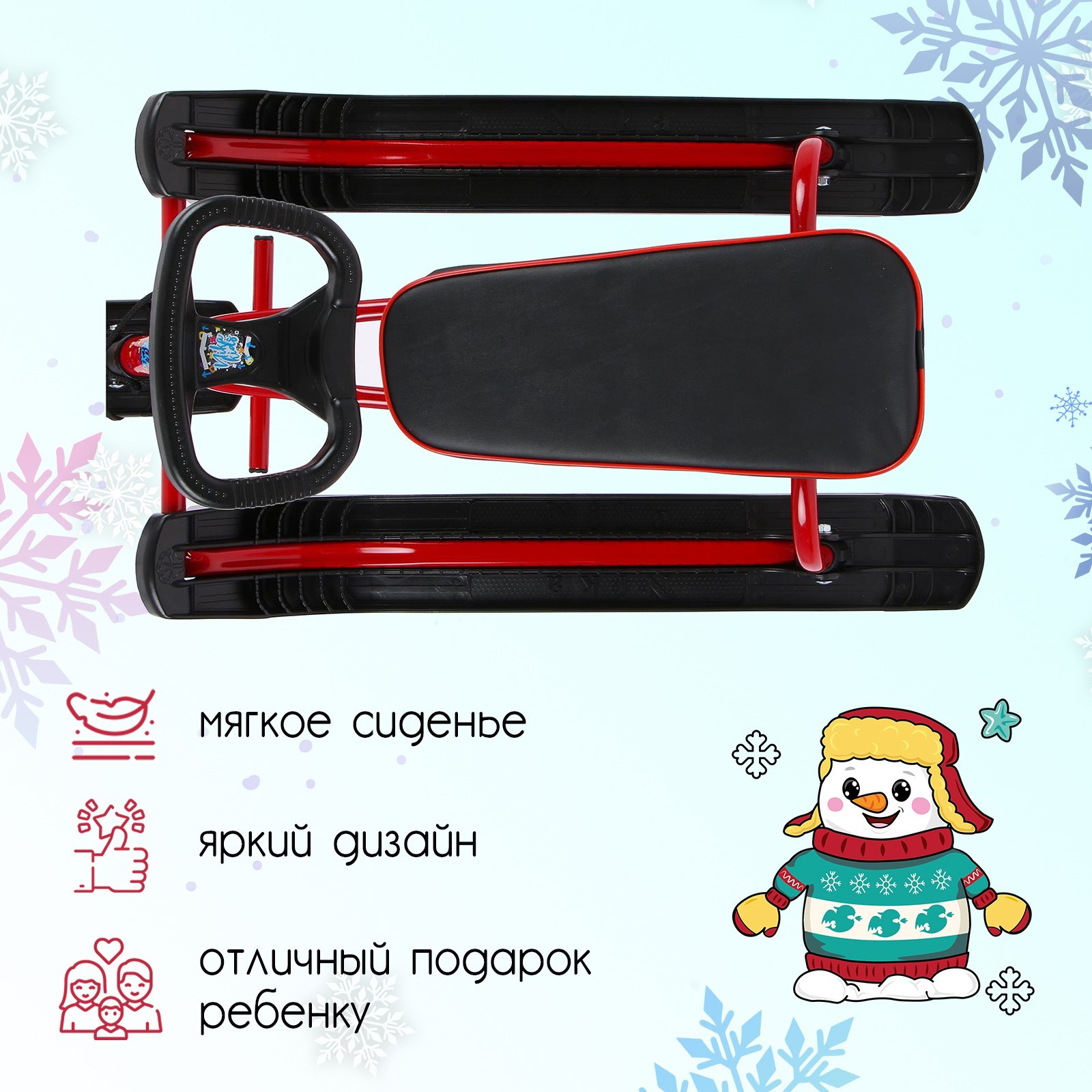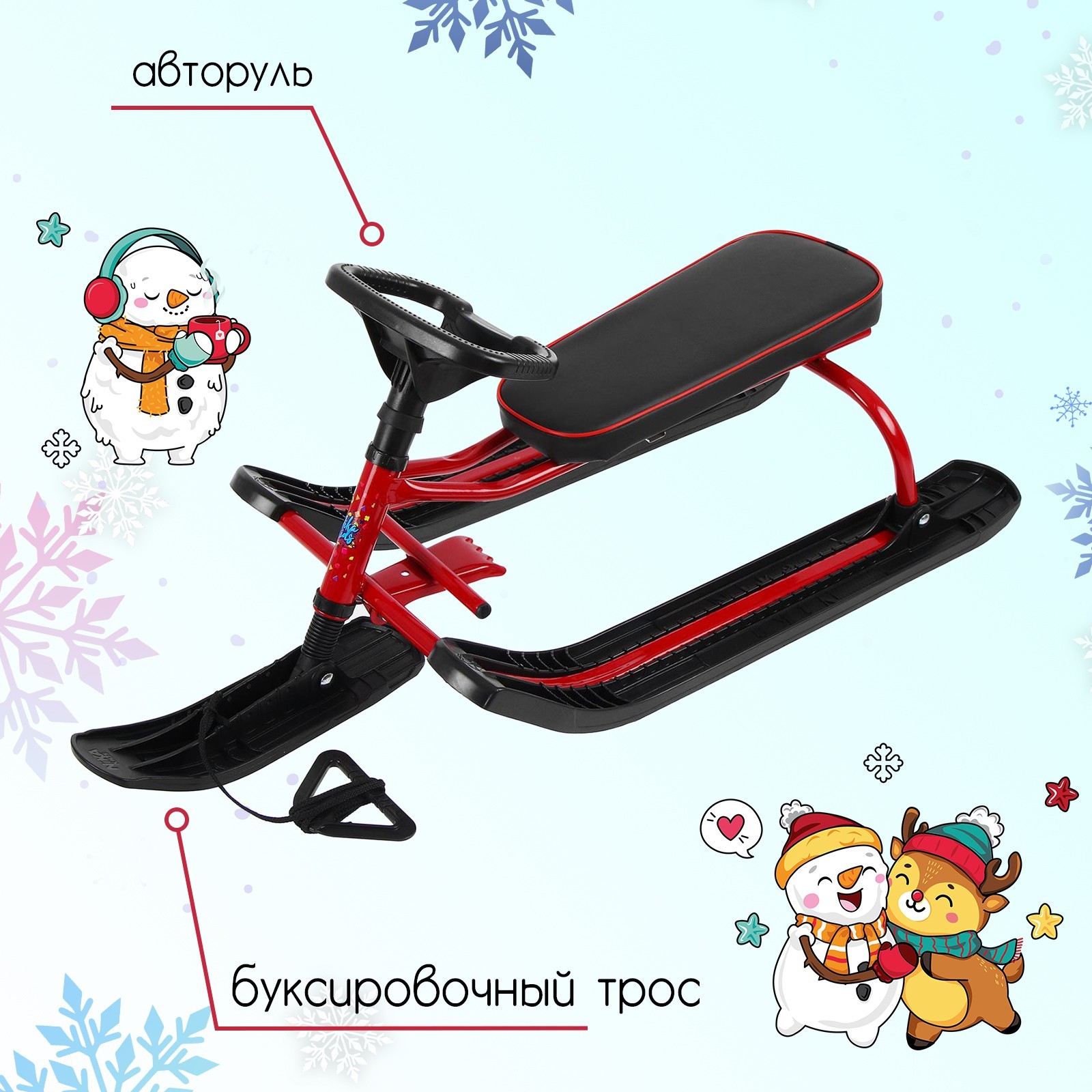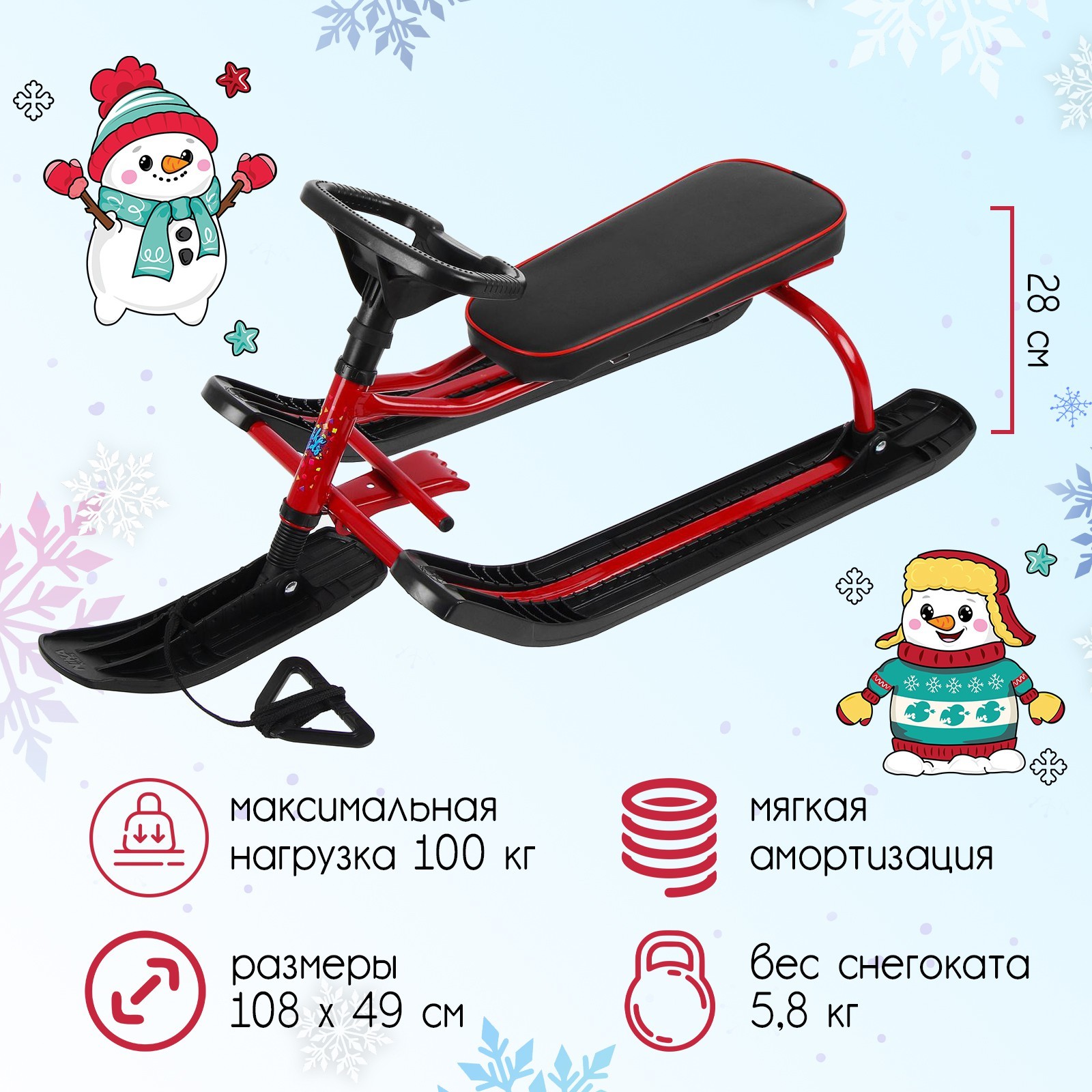 Снегокат «тимка спорт», тсл/к2, цвет красный/чёрный. Снегокат предназначен для перевозки детей по плотному снегу или льду, катанию с горок. Имеет сварную конструкцию из стальных труб, пластиковых элементов и мягкое сиденье, обтянутое искусственной кожей. Оснащён буксировочным тросом. Тормоз эффективен на обледенелой поверхности. Характеристики АвторульБуксировочный тросШирина сиденья: 20 смДлина сиденья: 44, 5 смВысота по руль: 41 смВысота по сиденью: 28 смМаксимальная нагрузка: 100 кгМасса: 7, 2 кг Цвет: Красный Цвет: Чёрный Возраст: От 3 лет Высота до сиденья, см: 28 Maксимальная нагрузка, кг: 100 Ручка для родителей: Нет Ремень безопасности: Нет Наличие спинки: Нет Тип руля: Авторуль Буксировочный трос: Веревка Регулировка посадочных мест: Нет Температурное ограничение: Нет Амортизатор: Да  развернуть описание ▼