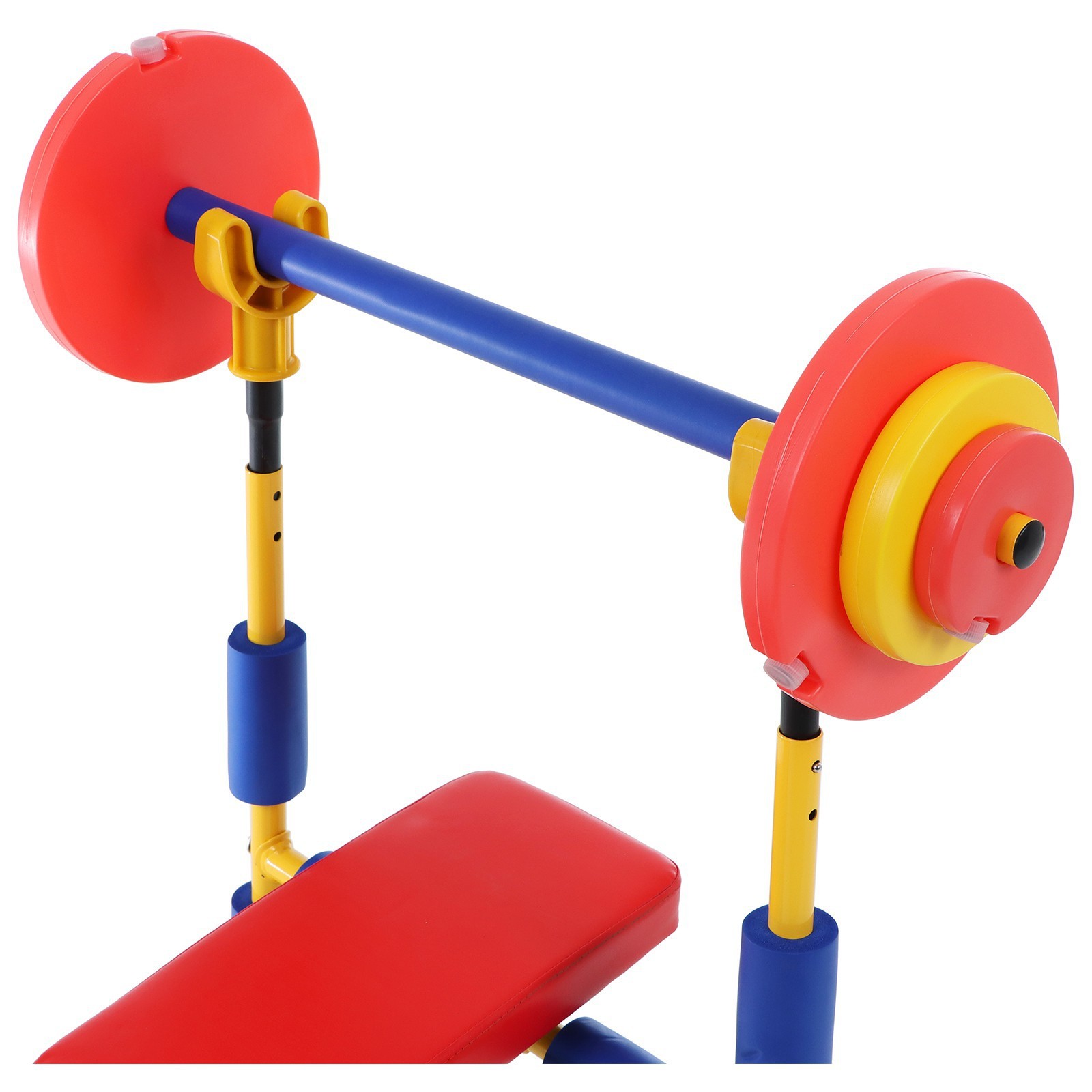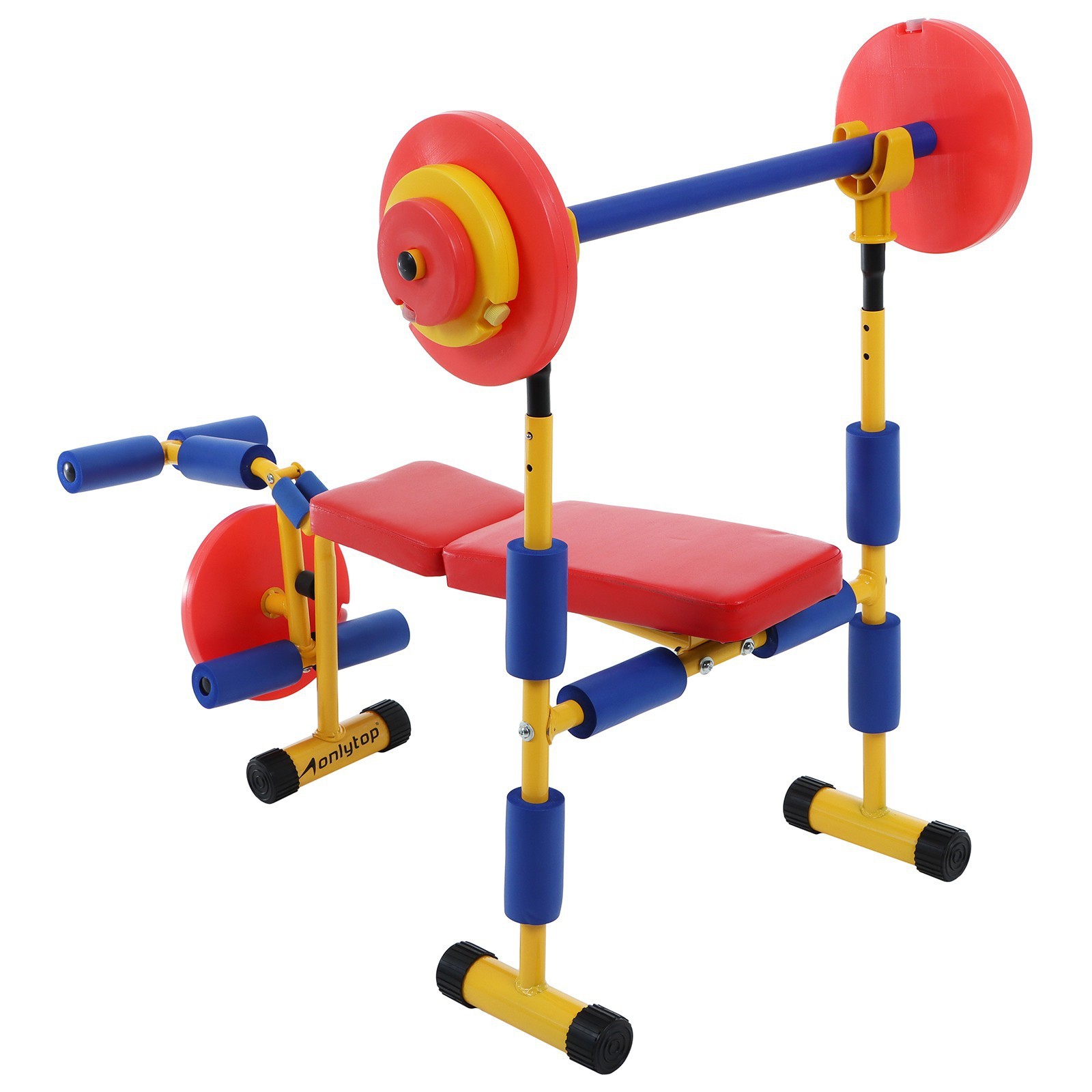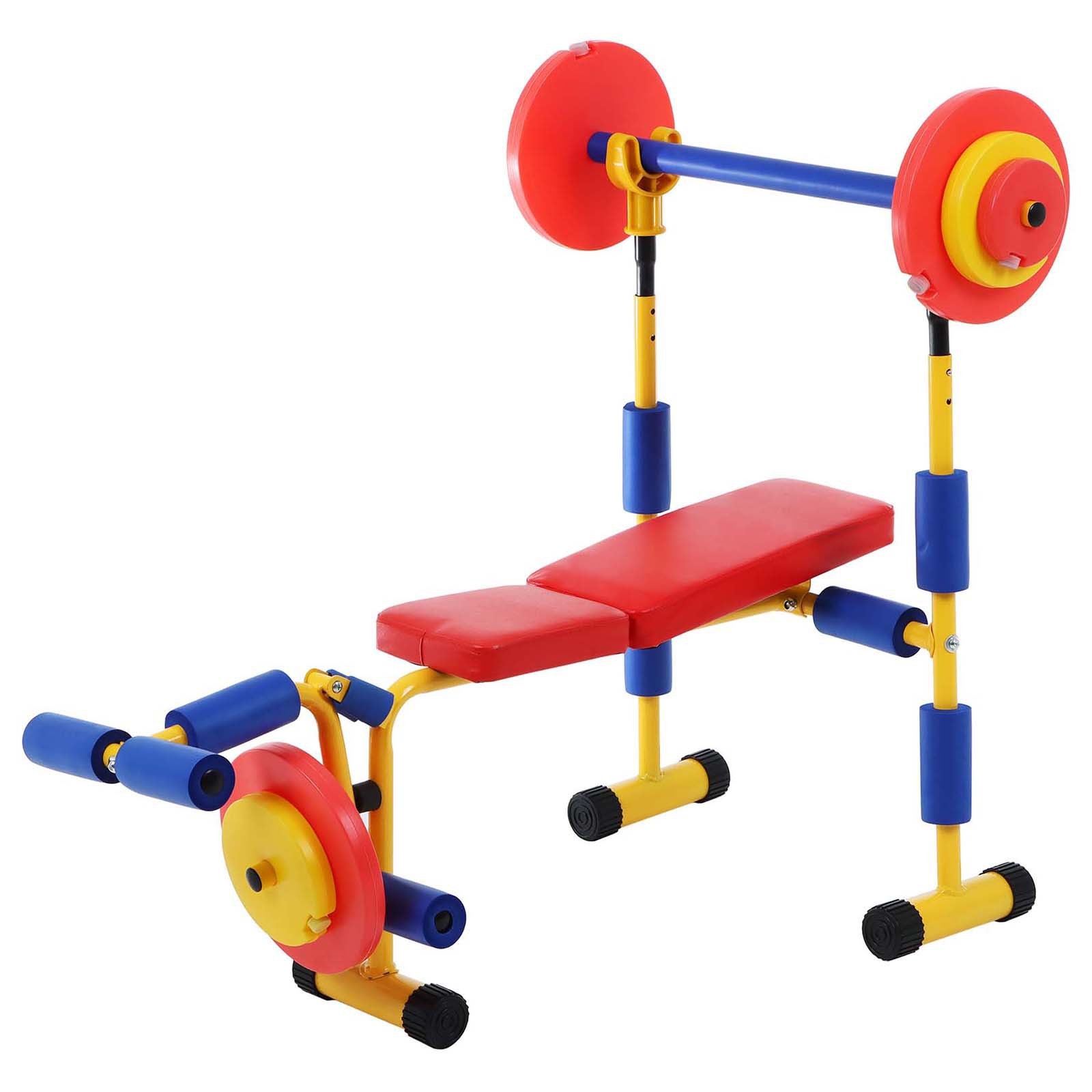 Детская скамья для жима со штангой onlytop. Бенч детский совсем, как настоящий, только маленький. Его трубы для безопасности покрыты мягким материалом. Тренажёр предназначен для детей от 4 до 8 лет. Максимальный вес пользователя: 60 кг. На силовом тренажёре можно делать упражнения на тренировку различных групп мышц рук, ног, спины и брюшного пресса. Характеристики: Размер: 114 х 68, 5 х 92 см. Материал: металл, полиуретан. Вес грифа: 0, 907 кг. Вес большого блина: 0, 283 кг. Вес среднего блина: 0, 142 кг. Вес маленького блина: 0, 057 кг. Вес грифа со всеми блинами: 1, 814 кг. Варианты занятий на детском бенче: 1 вариант Ребёнок ложится на спину, ставит ступни на подставку для ног. Берёт штангу прямым хватом на расстоянии чуть шире плеч, опустив локти, и поднимает её над собой, выпрямляя руки. Отягощение: начиная с маленького груза с каждой стороны и заканчивая всеми тремя. 2 вариант (для детей 5-8 лет) Ребёнок ложится на скамью на живот, ступни - под упором тренажёра. Поднимать ноги с отягощением, начиная с маленького груза и заканчивая двумя. Длительность - от 3 до 5 минут, через каждую минуту детям предлагается отдых в течение 30 - 40 секунд. Тренажёр может применяться в любых детских учреждениях, комнатах отдыха и в домашних условиях. Перед использованием тренажёра проконсультируйтесь с врачом–педиатром. Возраст: От 4 лет Maксимальная нагрузка, кг: 60  развернуть описание ▼