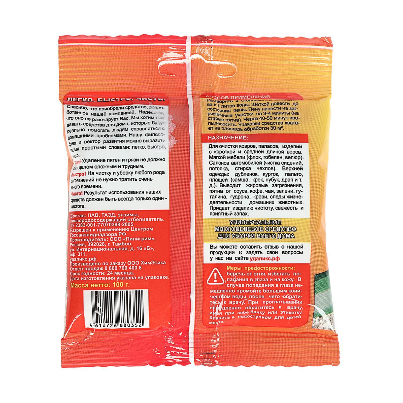 Пятновыводитель udalix ultra, порошок, для чистки ковров, 100 г. Мощное средство для чистки ковров, паласов, изделий с короткой и средней длиной ворса. Подходит для мягкой мебели (фолк, гобелен, велюр), для салона автомобиля (чистка сидений, потолка, стирка чехлов), для верхней одежды: дублёнок, курток, пальто, плащей (замша, креп, нубук, драп и т. д. ). Выводит жировые загрязнения, пятна от соуса, кофе, чая, зелени, гуталина, следы жизнедеятельности животных. Придаёт изделию чистоту, свежесть и приятный запах. Экономичное - одного пакетика хватает на чистку 30 кв. м. Вес, г/Объём, мл: 100 Форма выпуска: Порошок Назначение: Для шерсти и деликатных тканей Температурное ограничение: Нет  развернуть описание ▼