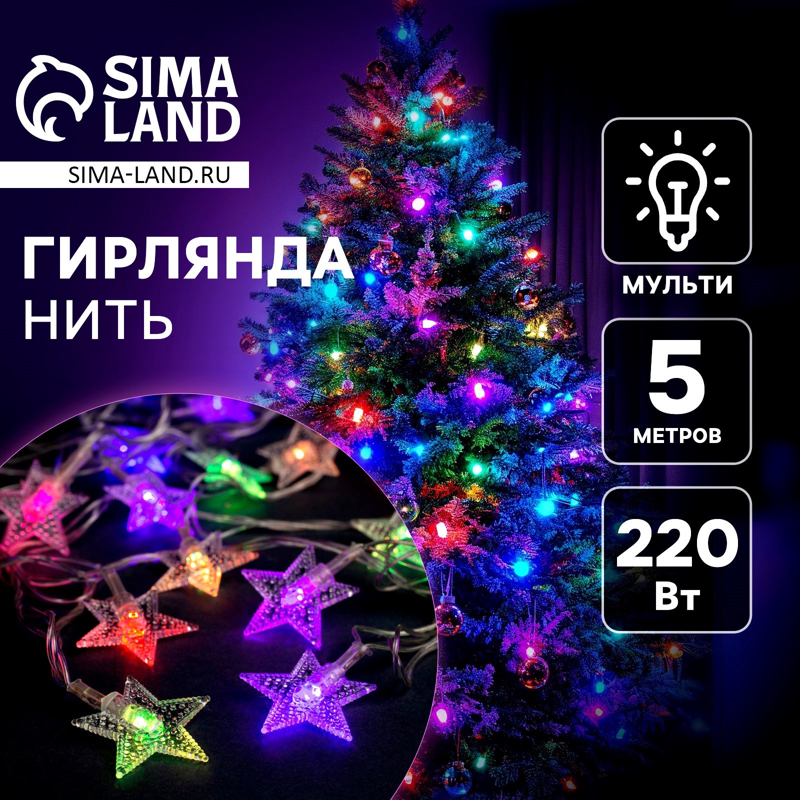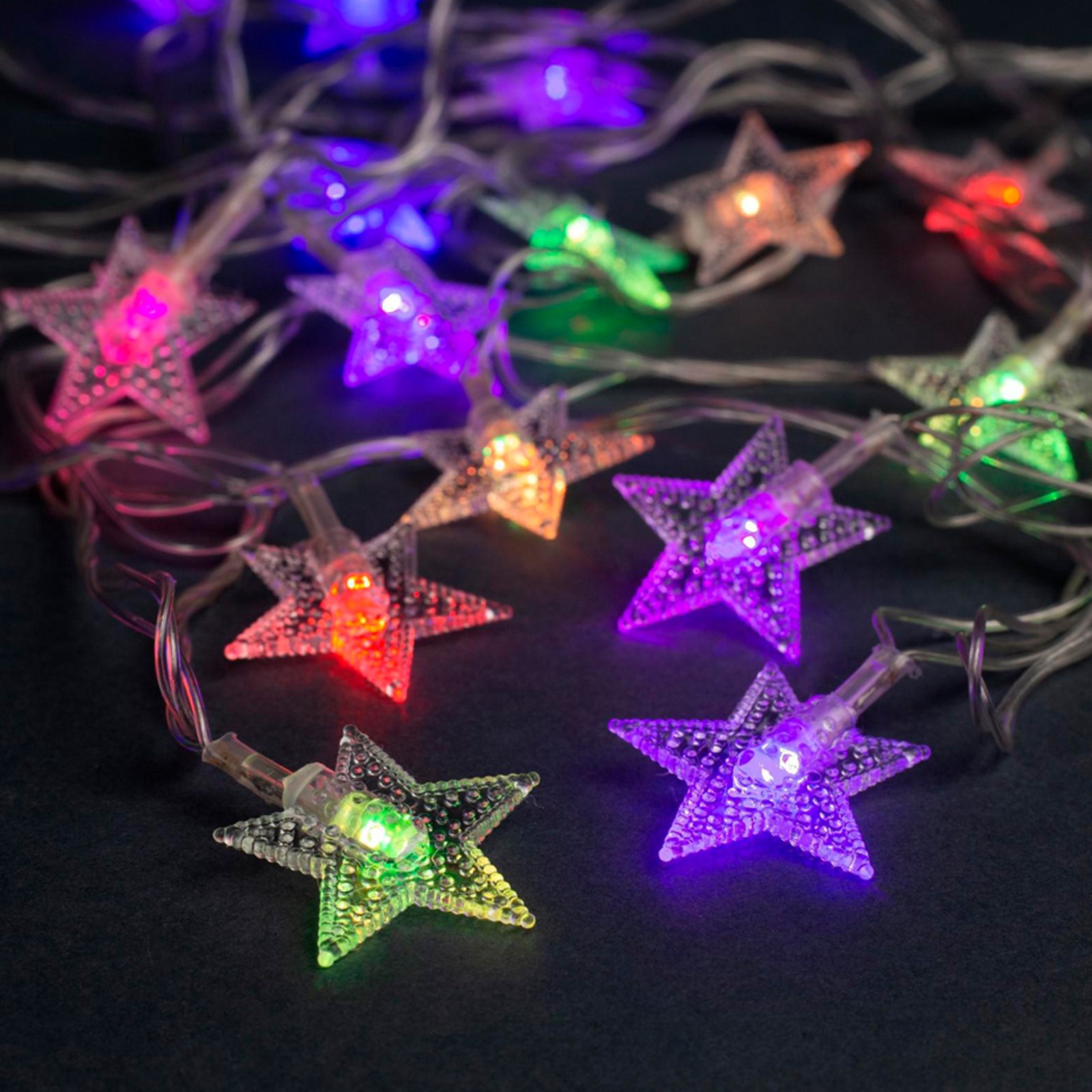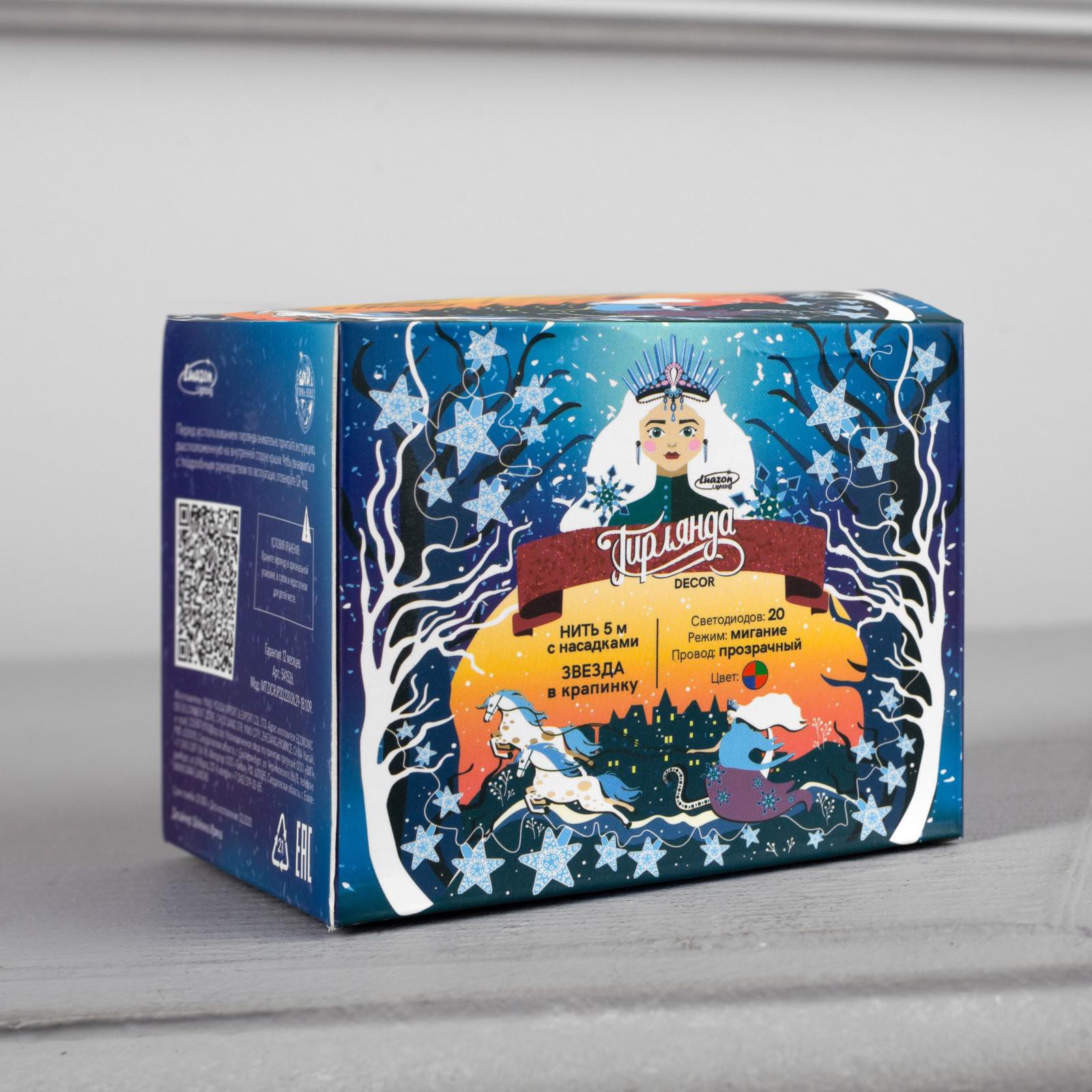 Гирлянда «нить» 5 м с насадками «звезда в крапинку», Ip20, прозрачная нить, 20 Led, свечение мульти (rg/rb), мигание, 220 в