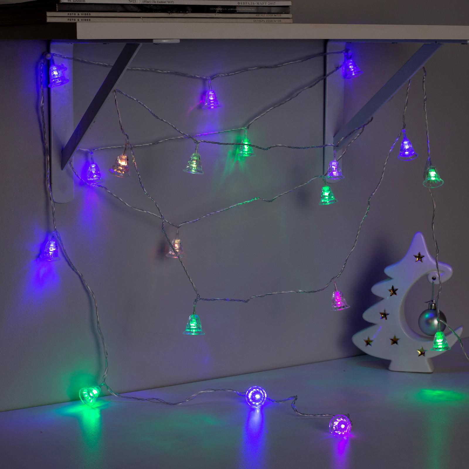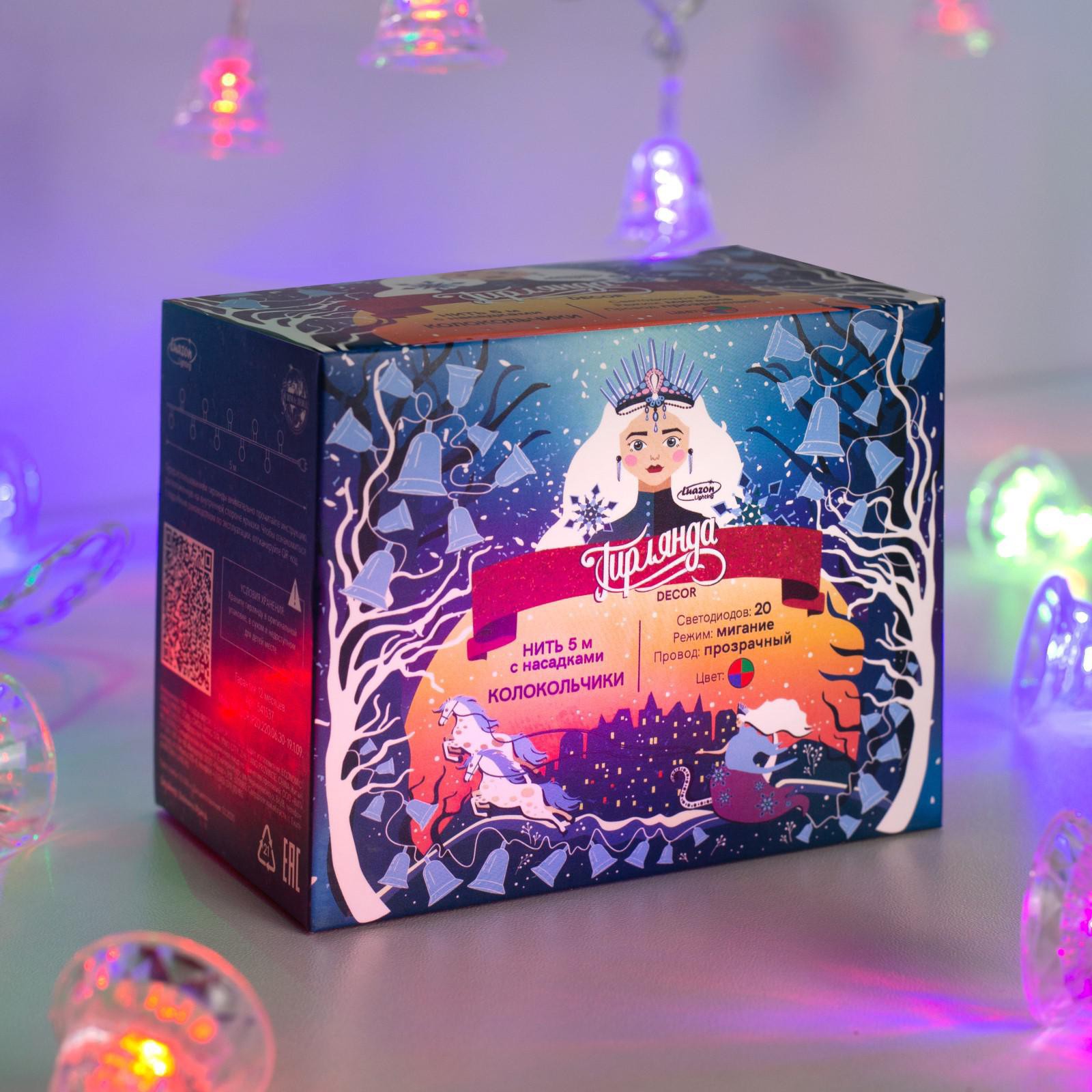 Гирлянда «нить» 5 м с насадками «колокольчики», Ip20, прозрачная нить, 20 Led, свечение мульти (rg/rb), мигание, 220 в