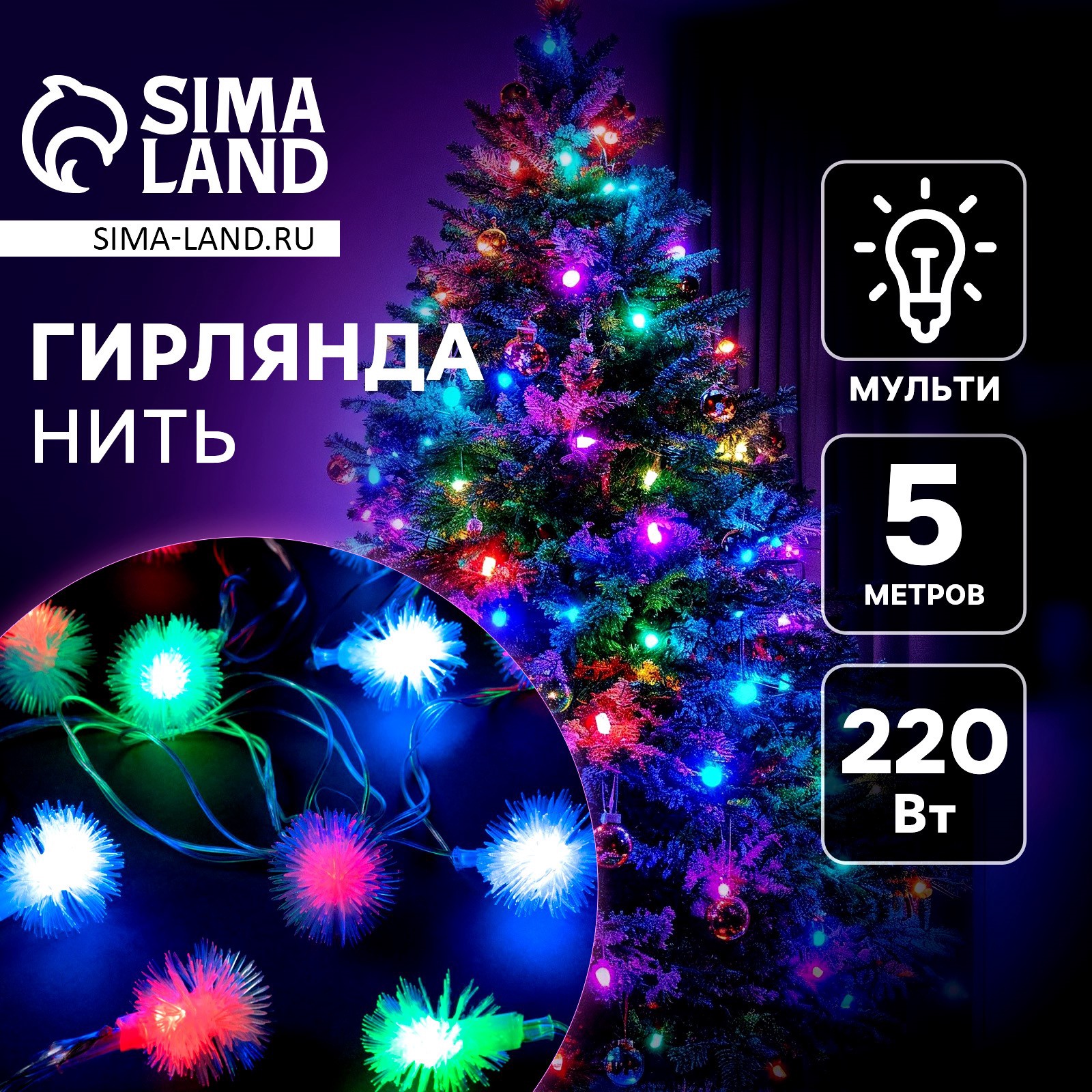Гирлянда «нить» 5 м с насадками «ёжики», Ip20, прозрачная нить, 20 Led, свечение мульти (rg/rb), мигание, 220 в