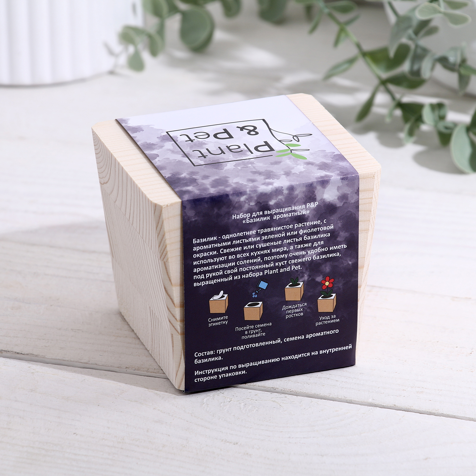 Набор для выращивания p&p «базилик ароматный», в кубе из дерева. Откройте для себя мир свежих ароматов и домашнего уюта с набором для выращивания базилика в стильном деревянном кубе. Этот уникальный комплект позволит вам легко и с удовольствием вырастить душистую траву, которая не только украсит ваш интерьер, но и станет незаменимым ингредиентом в кулинарии. Выращивание базилика — это не просто занятие, а целое искусство, которое приносит радость и удовлетворение. Компактный размер набора идеально подходит для любого уголка вашего дома, будь то кухня или столовая. Кроме того, он станет отличным подарком для любителей кулинарии и садоводства. Простота ухода: базилик легко выращивать, он не требует сложного ухода, что делает его идеальным выбором для начинающих садоводов.Эстетика и стиль: деревянный куб придаёт набору современный и элегантный вид, который гармонично вписывается в любой интерьер.Свежие ароматы: наслаждайтесь свежим базиликом, который вырастили собственноручно — это добавит уникальный вкус вашим блюдам!Создание уюта: живое растение в доме не только улучшает атмосферу, но и приносит радость общения с природой.Развитие интереса к растениям: идеальный способ привить любовь к ботанике и заботе о растениях как взрослым, так и детям.Выбор набора для выращивания базилика — это не просто хобби, это возможность создать свой маленький зеленый уголок и наслаждаться процессом роста и использования свежих трав в кулинарии. Начните своё ароматное приключение и подарите себе и своим близким радость от общения с природой! Вид:В горшке|Тип растения:Душистые травы (пряности)|Страна:Россия  развернуть описание ▼