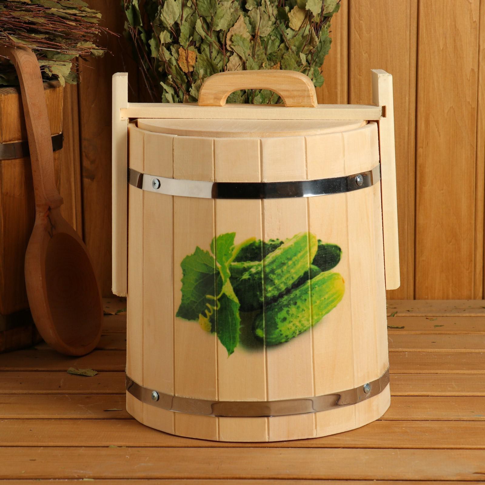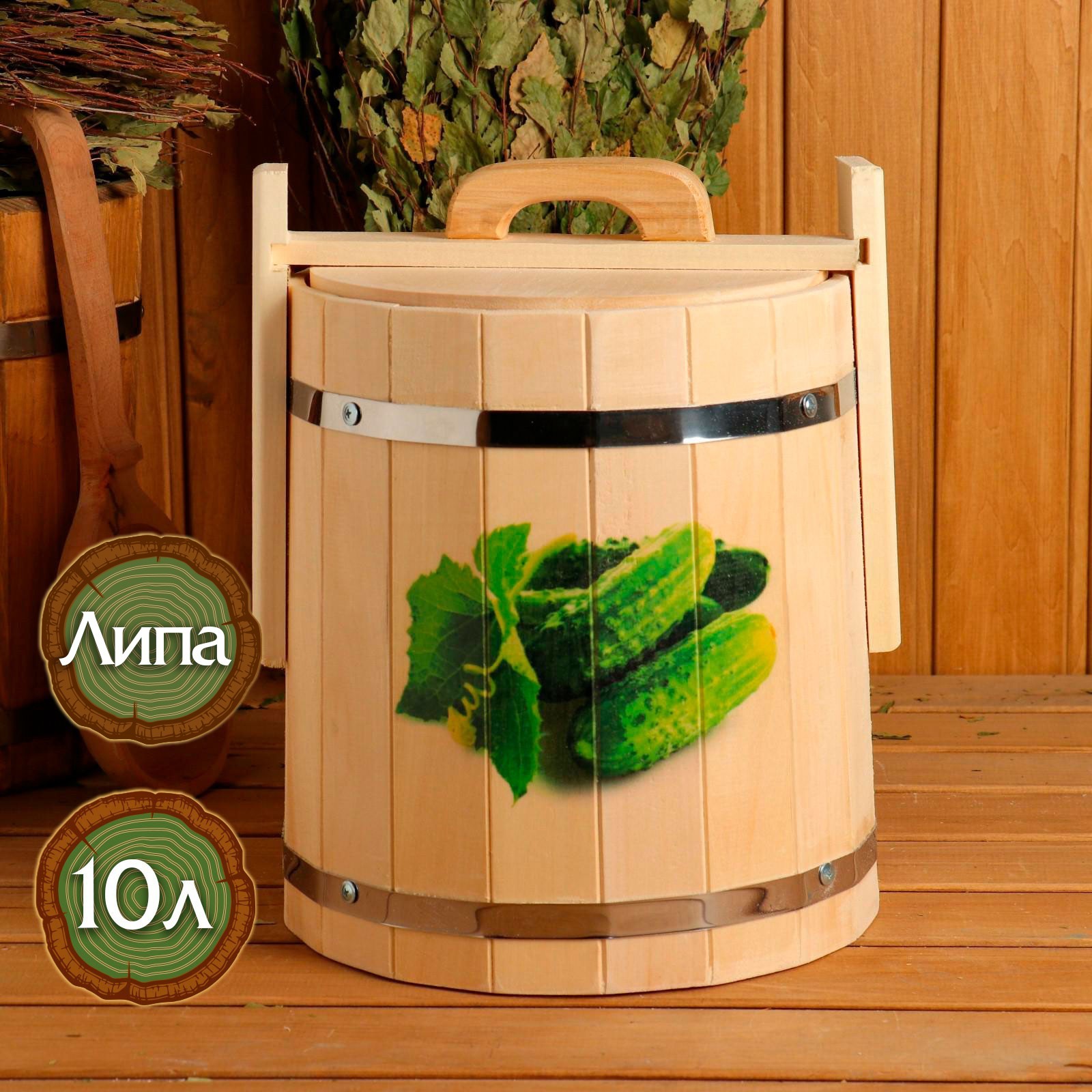 Кадка из липы, 10л, нержавеющий обруч, с крышкой, с уф-печатью "огурчики" "добропаровъ"