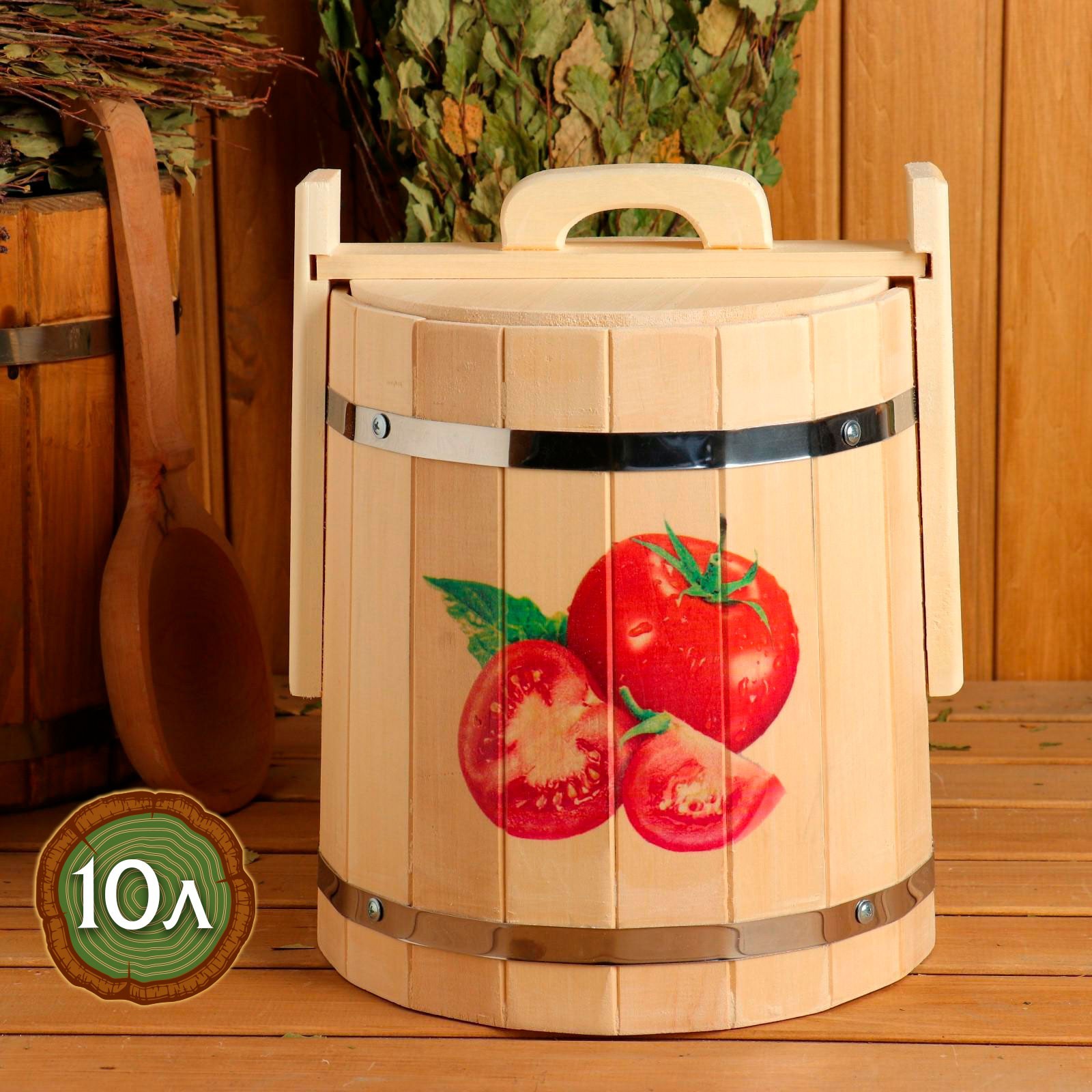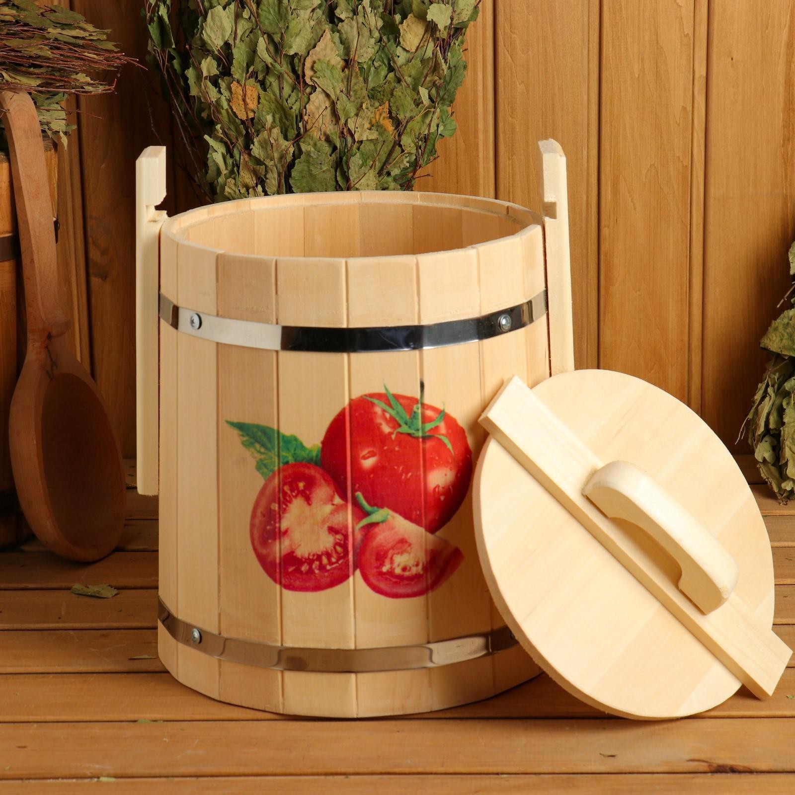 Кадка из липы, 10л, нержавеющий обруч, с крышкой, с уф-печатью "помидорчики" "добропаровъ"