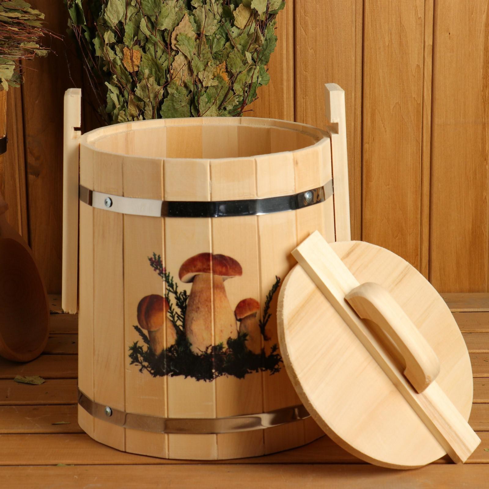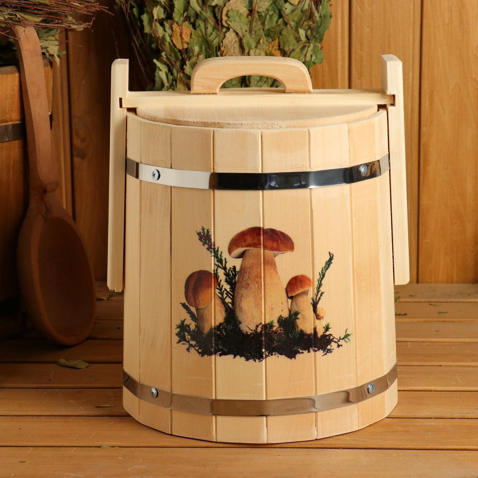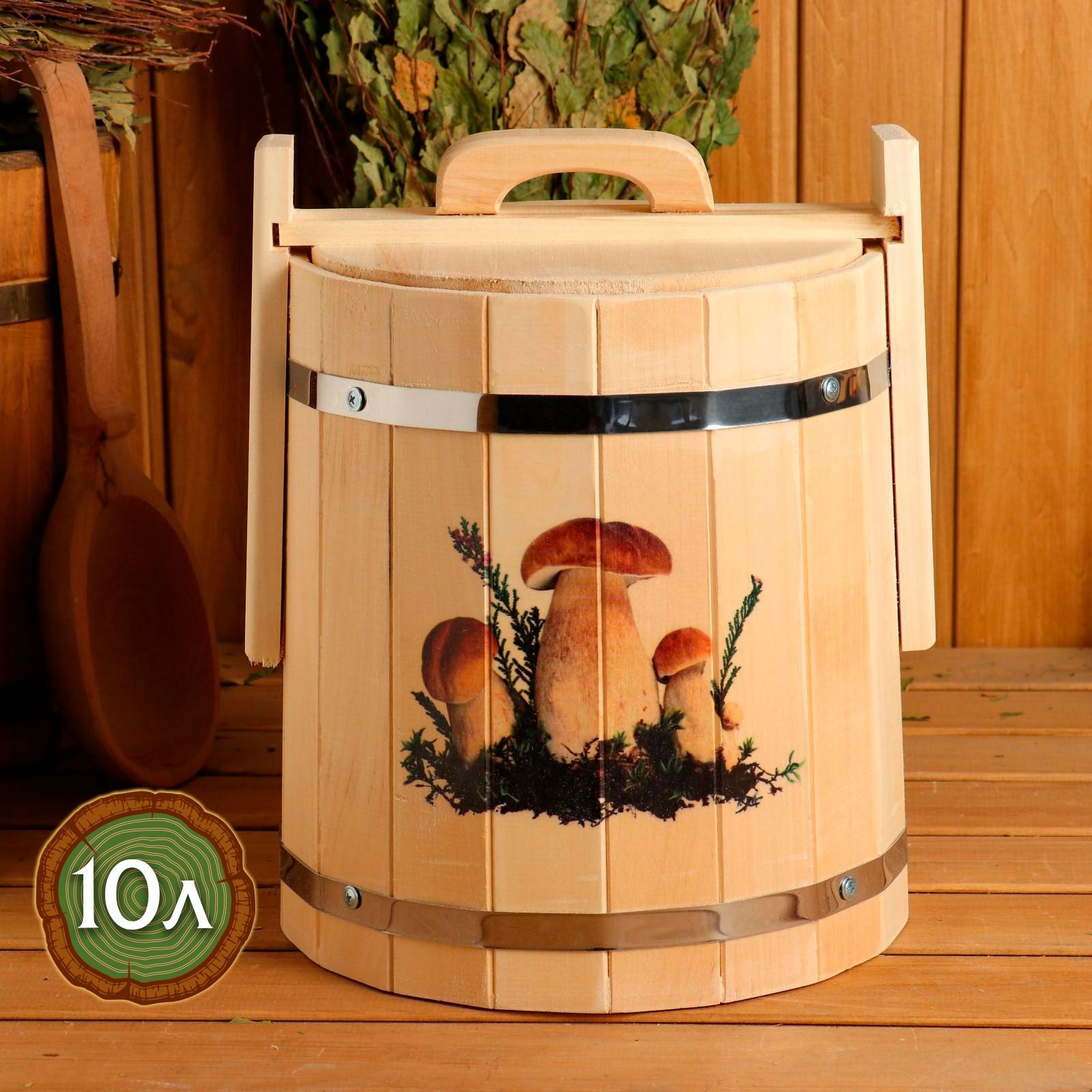 Кадка из липы, 10л, нержавеющий обруч, с крышкой, с уф-печатью "грибочки" "добропаровъ"