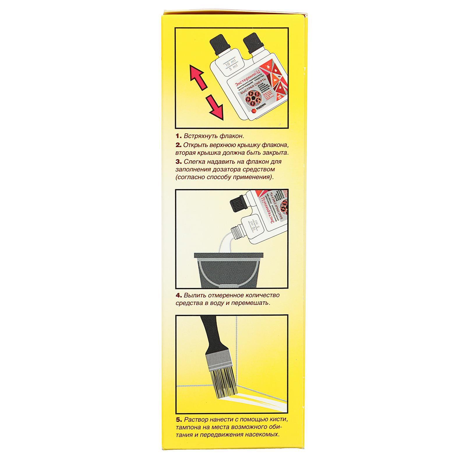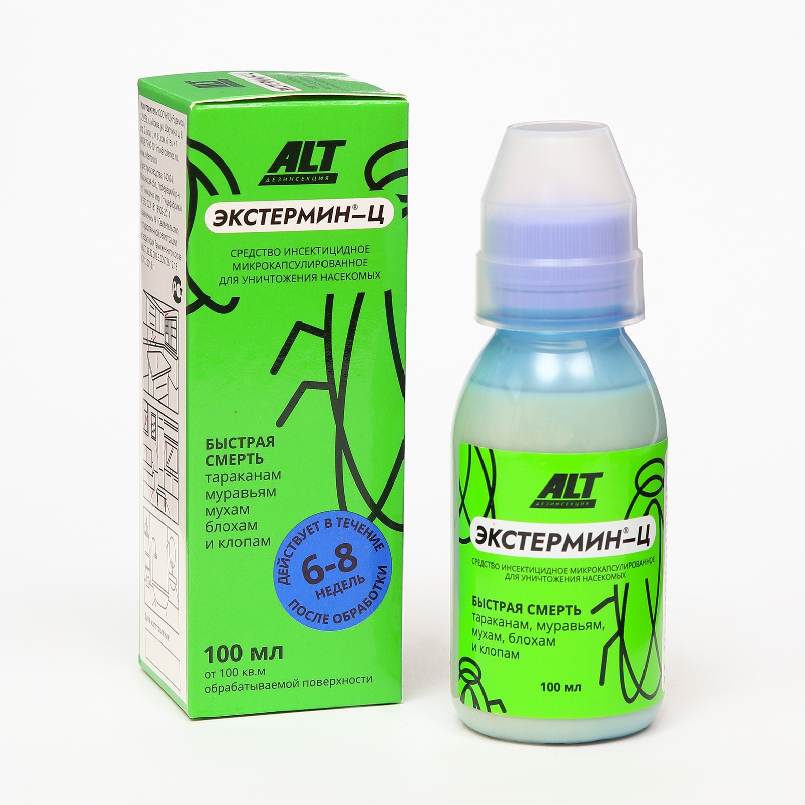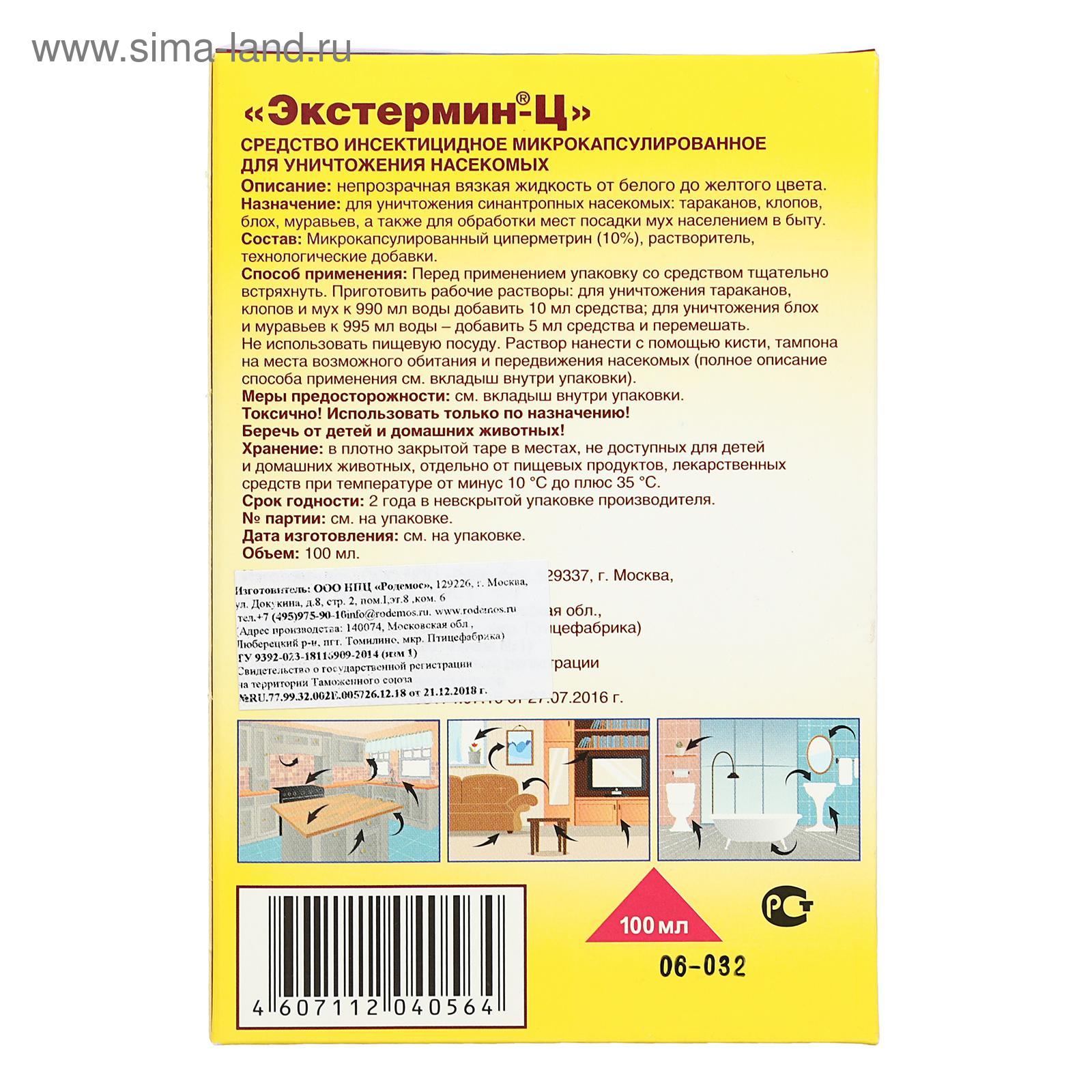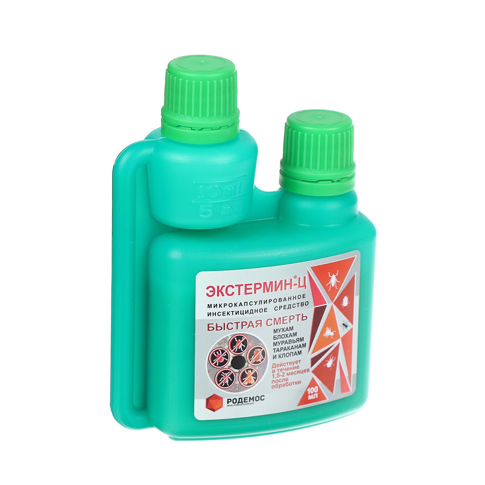 Средство инсектицидное микрокапсулированное"экстермин-ц", без запаха, 100 мл. Экстермин-Ц - микрокапсулированный инсектицидный препарат (без запаха) для полного уничтожения насекомых. Это эффективное профессиональное средство от клопов. Если народные препараты от тараканов не помогают, то Экстермин-Ц приобрести Вам просто необходимо. Если Вы не знаете, как избавиться от муравьев на огороде, садовом участке или в квартире, средство Экстермин-Ц от муравьев поможет Вам. Описание: Вязкая непрозрачная жидкость от белого до желтого цвета Состав: В препарате Экстермин-Ц в 2 раза больше действующего вещества (Циперметрин - 10%), растворитель, технологические добавки. Назначение: Для полного уничтожения синантропных насекомых: клопов, тараканов, блох, муравьев, для обработки мест посадки мух. Применяется населением в быту, а также на других объектах, включая лечебные, детские, пищевые, коммунально-бытовые, а также для медицинской дезинсекции . Обеспечивает полную гибель тараканов разных видов, постельных клопов, блох, рыжих домовых муравьев, а также мух. Обладает остаточным действием в течение 6-8 недель в зависимости от типа обрабатываемой поверхности. Способ применения: Флакон с препаратом тщательно встряхнуть перед применением. Открыть верхнюю крышку флакона (нижняя крышка должна быть закрытой!). Слегка надавить на флакон для заполнения дозатора средством в нужном объеме. Приготовить рабочий раствор (1 литр): для уничтожения клопов, тараканов и мух - 10 мл средства на 990 мл воды комнатной температуры (при высокой численности - 20 мл на 980 мл воды). Для блох и муравьев - 5 мл на 995 мл воды. Тщательно перемешать, затем нанести на места возможного передвижения и обитания насекомых с помощью опрыскивателя, кисти или тампона. Для уничтожения постельных клопов средство следует равномерно нанести в щели в стенах, мебели, кроватях, за плинтусами, обратные стороны ковров, картин, дорожек и т. п. . ВНИМАНИЕ! Беречь от детей и домашних животных! Не использовать пищевую посуду! Хранить (при температуре от минус 10 градусов С до плюс 35 градусов С) в плотно закрытой таре отдельно от пищевых продуктов, лекарственных средств. Действует в течение 6-8 недель после обработки. Удобный флакон 100 мл. Площадь обработки: 100 кв. м поверхности. Срок годности: 2 года в невскрытой упаковке. Вид средства: Жидкость Температурное ограничение: Нет Тип средства: Инсектицид  развернуть описание ▼
