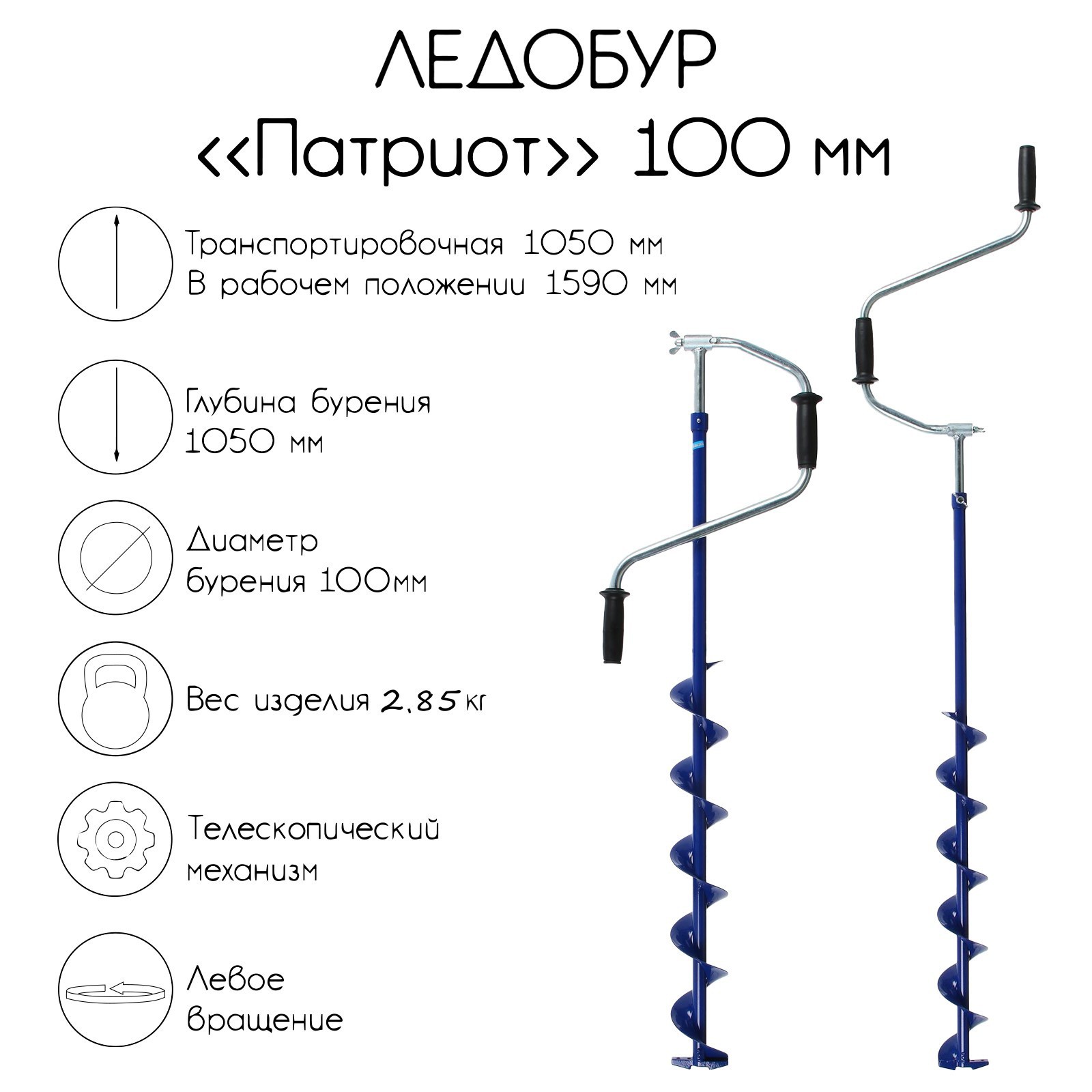Ледобур "патриот", телескопический, 100 мм, лезвие, чехол, молоточек, набор. Ледобуры Патриот левого вращения с цельнонавитым шнеком повышенной прочности. Механизм складывания рукоятки обеспечивает отсутствие люфтов и делает более легким и удобным приведение ледобура в рабочее состояние. Двуручная конструкция рукояти распределяет усилие на обе руки, что значительно сокращает время бурения лунки и экономит силу рыболова. Подходит для любых условий рыбалки. Благодаря небольшому весу и габаритам в сложенном состоянии удобно переносить на плече при длительных переходах по водоему или компактно разместить в рыболовных санях. Свойства: Вес: 3, 1 кг;Высота шнека: 60 см;Диаметр бурения: 100 мм;Длина в рабочем положении: 159 см;Длина в собранном виде: 105 см. Комплектация: ЛедобурНожи - 2штБолтики - 4штЧехол для ножейМолоточек Диаметр, мм: 100 Глубина бурения, м: 1.05 Вес, кг: 2.85 Транспортная длина, см: 113 Температурное ограничение: Нет Тип: Ледобур Вид ледобура: Телескопический Вид ледобура: Двуручный Направление вращения: Левое (против часовой стрелки)  развернуть описание ▼