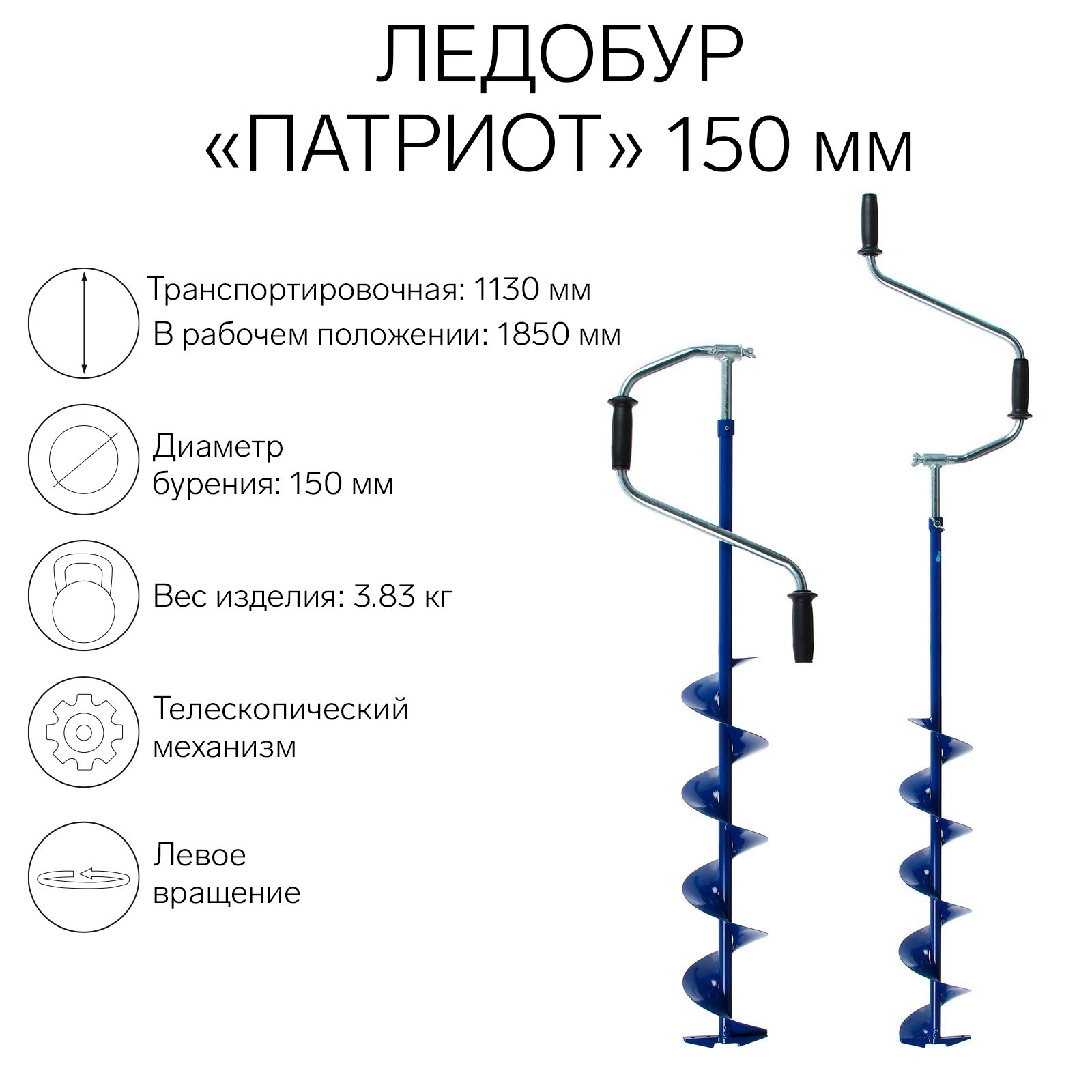 Ледобур "патриот" телескопический 150 мм. Ледобур «Патриот» — это инструмент, предназначенный для создания отверстий во льду для зимней рыбалки. Он изготовлен из высококачественной стали, что обеспечивает его прочность и долговечность. Ледобур оснащен острыми ножами, которые легко справляются с любым типом льда. Благодаря компактным размерам и малому весу, его удобно транспортировать и хранить. Особенности: Цельнонавитый шнек повышенной прочности. Надёжное соединение рукоятки с буром, не имеющее люфта при работе. Складывается/раскладывается без усилий, а надежности соединения не имеет аналогов. Бур укомплектован стандартными, недорогими ножами с винтами и чехлом. Удобные ручки (прочный каркас из пластмассы покрыт мягким чехлом из пвх), которые выдерживают низкие температуры. Бур укомплектован резиновым молоточком, который обеспечивает эффективное очищение от льда. Характеристики: сложенный: 1130 ммразложенный: 1850мм Диаметр, мм: 150 Вес, кг: 3.83 Транспортная длина, см: 113 Температурное ограничение: Нет Тип: Ледобур Вид ледобура: Двуручный Вид ледобура: Телескопический Направление вращения: Левое (против часовой стрелки)  развернуть описание ▼
