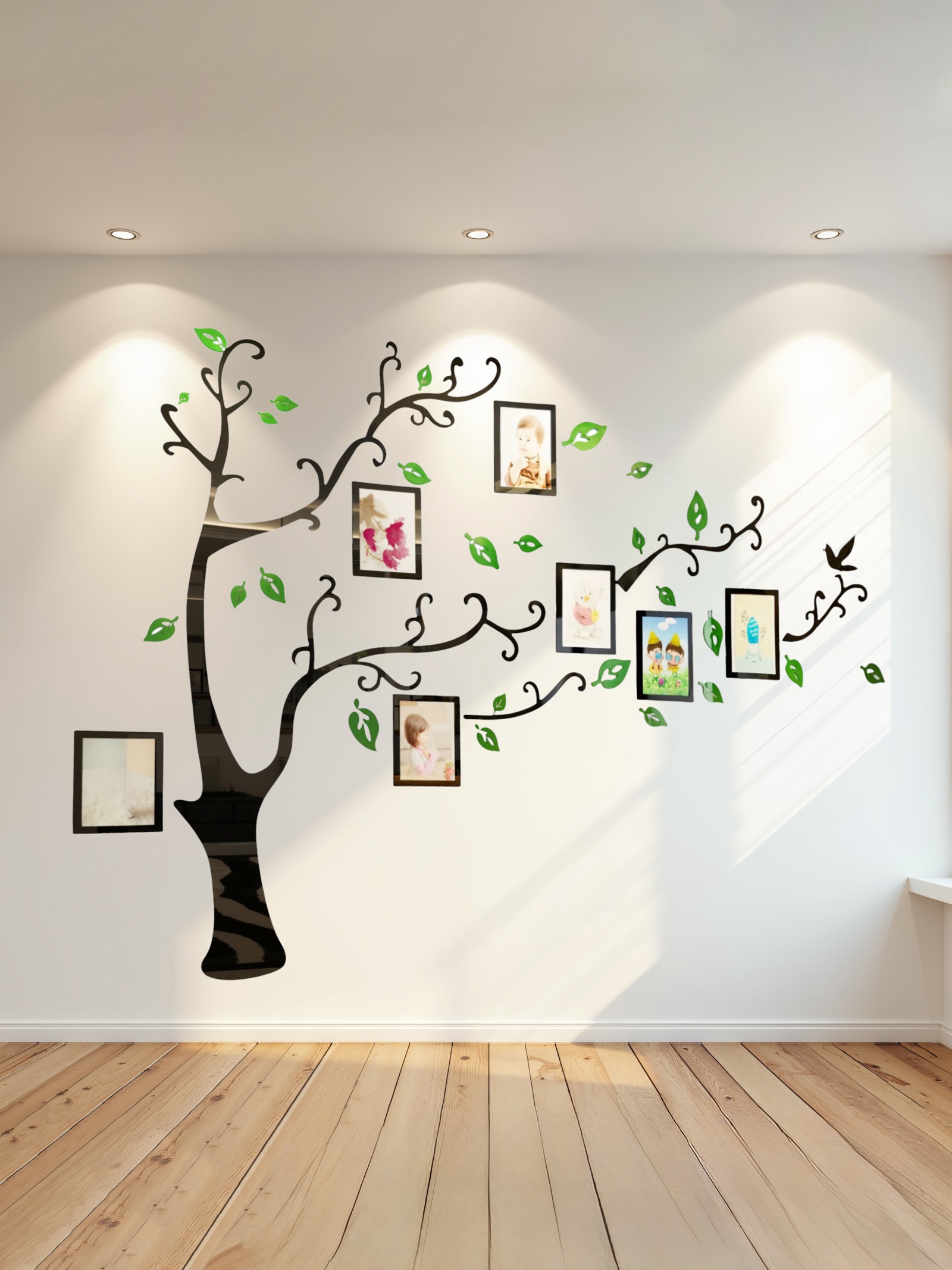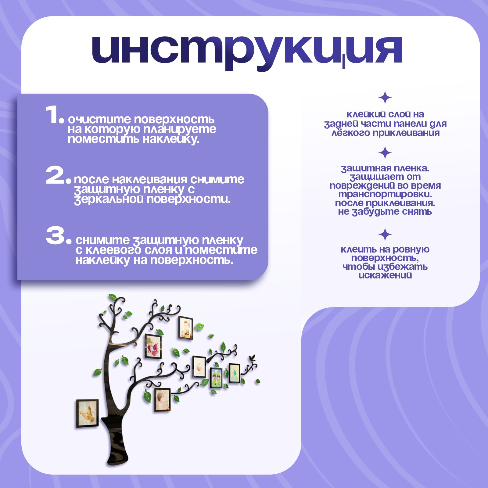 Наклейка интерьерная с фоторамками take it easy «семейное дерево», декор на стену, панно 110 140 см. Настенные наклейки изготовлены из высококачественного акрила. Это долговечный, безопасный, влагостойкий и неприхотливый в уходе материал. Наклейки подходят для декора интерьера дома, офиса, магазина. Их используют, чтобы освежить или дополнить интерьер, скрыть дефекты на стене, в качестве безопасной и оригинальной альтернативы зеркалу. Изделие легко крепится на любой чистой, сухой, гладкой поверхности. Например, на окрашенной или оклеенной обоями стене, стекле, керамической плитке, металле, пластике. Наклейки легко снимаются и не оставляют следов, поэтому их удобно часто менять или использовать в съёмной квартире. Нанесение на поверхность Наклейка состоит их трёх слоев — виниловой основы с клеевым слоем, защитной подложки снизу и прозрачной плёнки сверху. Не снимайте защитную плёнку с глянцевой части изделия, пока не закончите работы. Подготовьте поверхность, на которую будете крепить наклейку. Выровняйте, очистите от пыли, при необходимости обезжирьте спиртовым раствором или специальной жидкостью. Приложите наклейку к стене, наметьте место, куда вы хотите её приклеить. При необходимости закрепите её малярным скотчем, чтобы посмотреть издалека, как она будет выглядеть. Если устраивает — начинайте клеить. Маленькие стикеры клеить просто: полностью отделите нижнюю подложку, аккуратно приложите наклейку к поверхности и прижмите, разглаживая ракелем или мягкой тряпочкой от центра к краям. Большую наклейку приложите подложкой к стене и аккуратно отделите небольшую её часть. Приклейте этот край, прижмите и аккуратно вытягивайте подложку, одновременно прижимая освободившиеся части наклейки. Разглаживайте изделие от центра к краям. Если нужно состыковать элементы наклейки, начинайте с самого крупного. Например, если наклейка в виде дерева — приклейте сначала ствол, а потом ветви. Когда работы с наклейкой закончены, аккуратно удалите защитную плёнку. Стягивайте её так же, как удаляли подложку, оттягивая вниз или в сторону. Цвет:Зелёный|Цвет:Чёрный|Ширина, см:140|Высота, см:110|Количество фотографий:7|Тематика:Дерево|Тематика праздника:День семьи|Материал:EVA|Материал:Акрил|Вид крепежа:Двусторонняя клейкая лента|Вид наклейки:Интерьерная|Вид наклейки:С фоторамкой|Форма под фото:Прямоугольник|Страна:Китай  развернуть описание ▼
