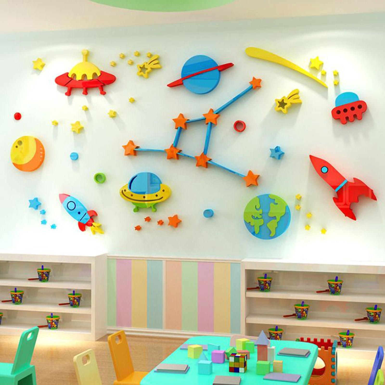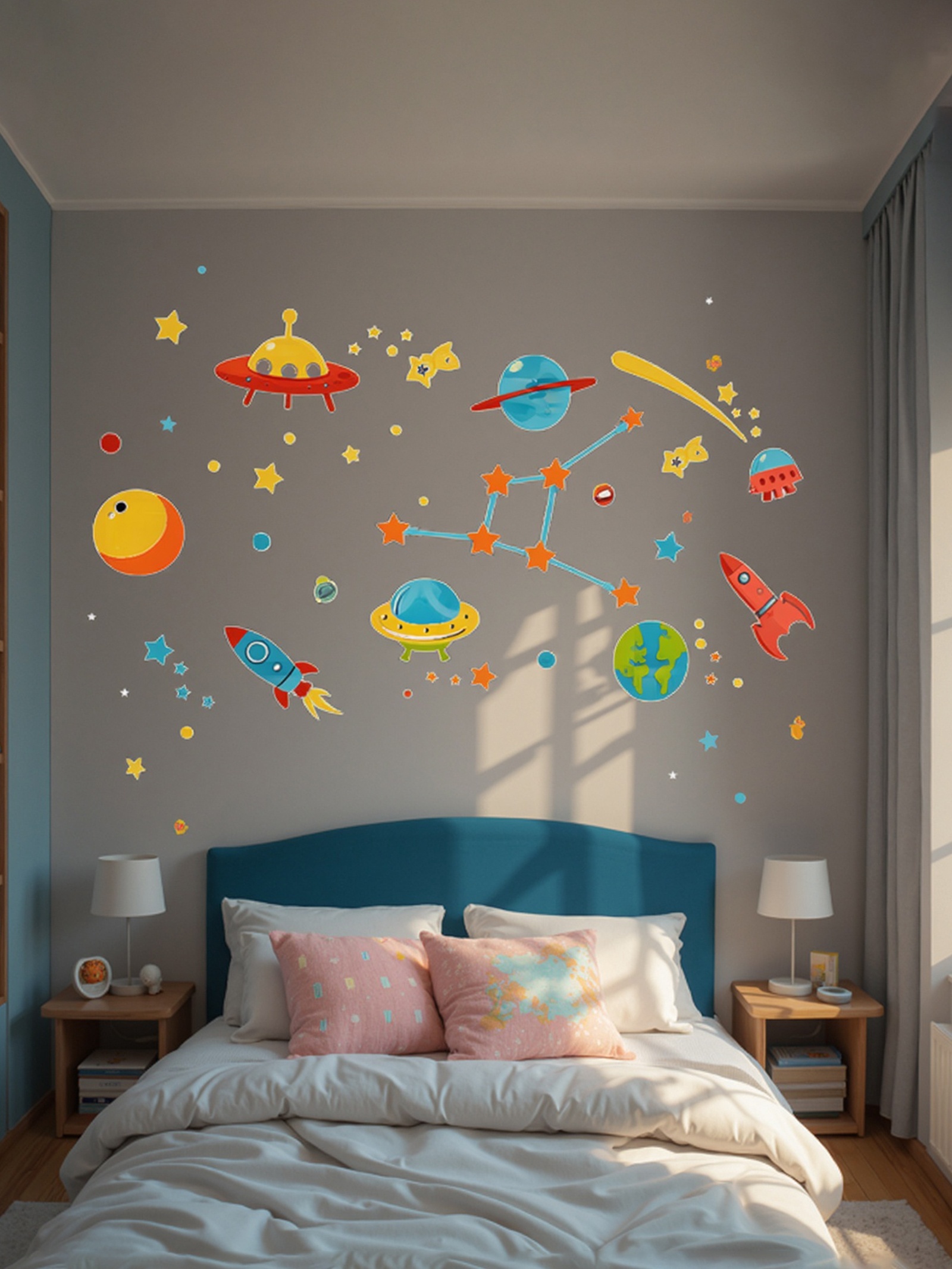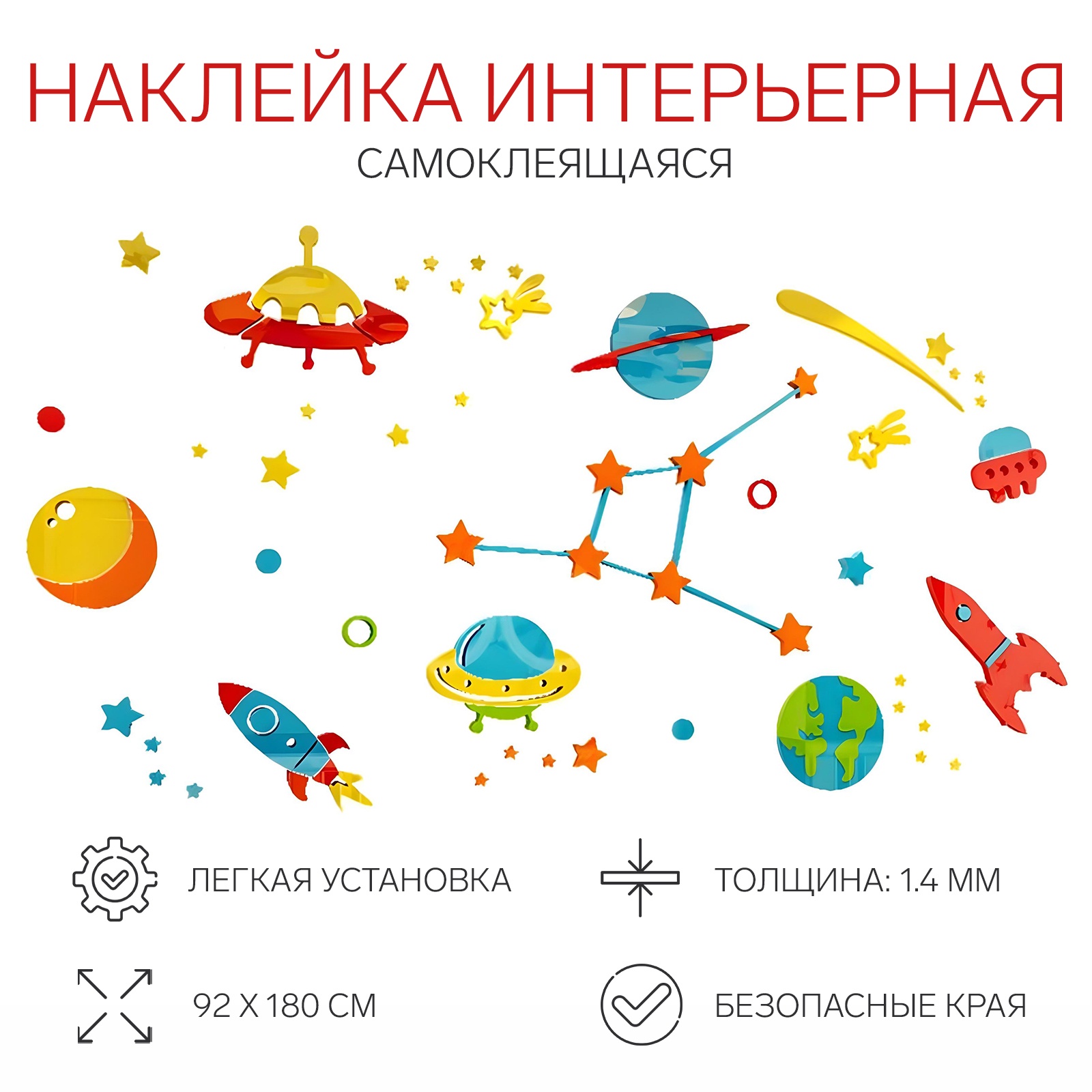 Набор наклеек интерьерных take it easy «космический мир», детские, декор на стену, панно, 92 180 см. Настенные наклейки изготовлены из высококачественного акрила. Это долговечный, безопасный, влагостойкий и неприхотливый в уходе материал. Наклейки подходят для декора интерьера дома, офиса, магазина. Их используют, чтобы освежить или дополнить интерьер, скрыть дефекты на стене, в качестве безопасной и оригинальной альтернативы зеркалу. Изделие легко крепится на любой чистой, сухой, гладкой поверхности. Например, на окрашенной или оклеенной обоями стене, стекле, керамической плитке, металле, пластике. Наклейки легко снимаются и не оставляют следов, поэтому их удобно часто менять или использовать в съёмной квартире. Нанесение на поверхность Наклейка состоит их трёх слоев — виниловой основы с клеевым слоем, защитной подложки снизу и прозрачной плёнки сверху. Не снимайте защитную плёнку с глянцевой части изделия, пока не закончите работы. Подготовьте поверхность, на которую будете крепить наклейку. Выровняйте, очистите от пыли, при необходимости обезжирьте спиртовым раствором или специальной жидкостью. Приложите наклейку к стене, наметьте место, куда вы хотите её приклеить. При необходимости закрепите её малярным скотчем, чтобы посмотреть издалека, как она будет выглядеть. Если устраивает — начинайте клеить. Маленькие стикеры клеить просто: полностью отделите нижнюю подложку, аккуратно приложите наклейку к поверхности и прижмите, разглаживая ракелем или мягкой тряпочкой от центра к краям. Большую наклейку приложите подложкой к стене и аккуратно отделите небольшую её часть. Приклейте этот край, прижмите и аккуратно вытягивайте подложку, одновременно прижимая освободившиеся части наклейки. Разглаживайте изделие от центра к краям. Если нужно состыковать элементы наклейки, начинайте с самого крупного. Например, если наклейка в виде дерева — приклейте сначала ствол, а потом ветви. Когда работы с наклейкой закончены, аккуратно удалите защитную плёнку. Стягивайте её так же, как удаляли подложку, оттягивая вниз или в сторону. Цвет:Разноцветный|Для кого:Унисекс|Ширина, см:180|Высота, см:92|Тематика:Космос|Материал:Акрил|Вид наклейки:Интерьерная|Страна:Китай  развернуть описание ▼