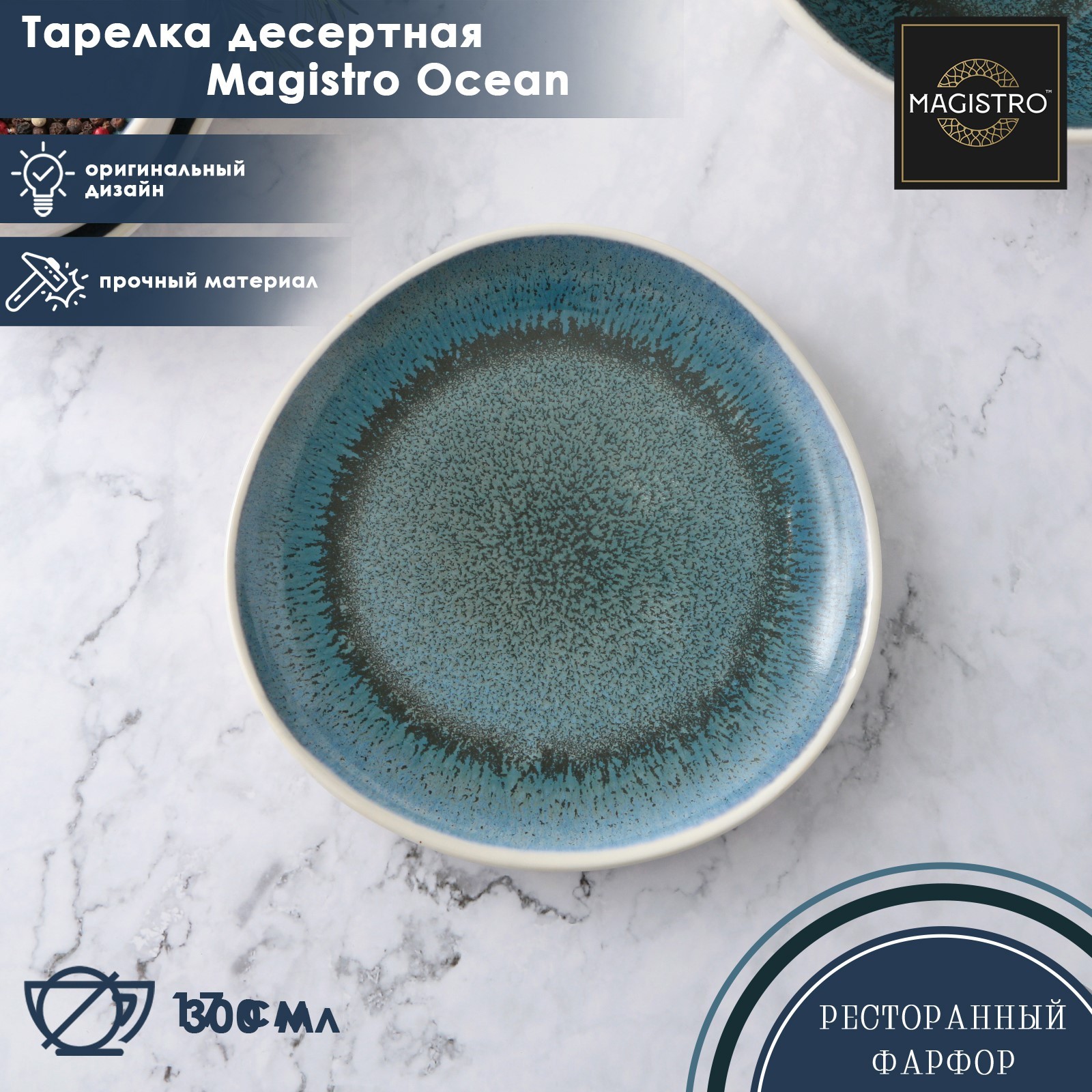 Тарелка фарфоровая десертная Magistro Ocean, D=17 см, цвет синий