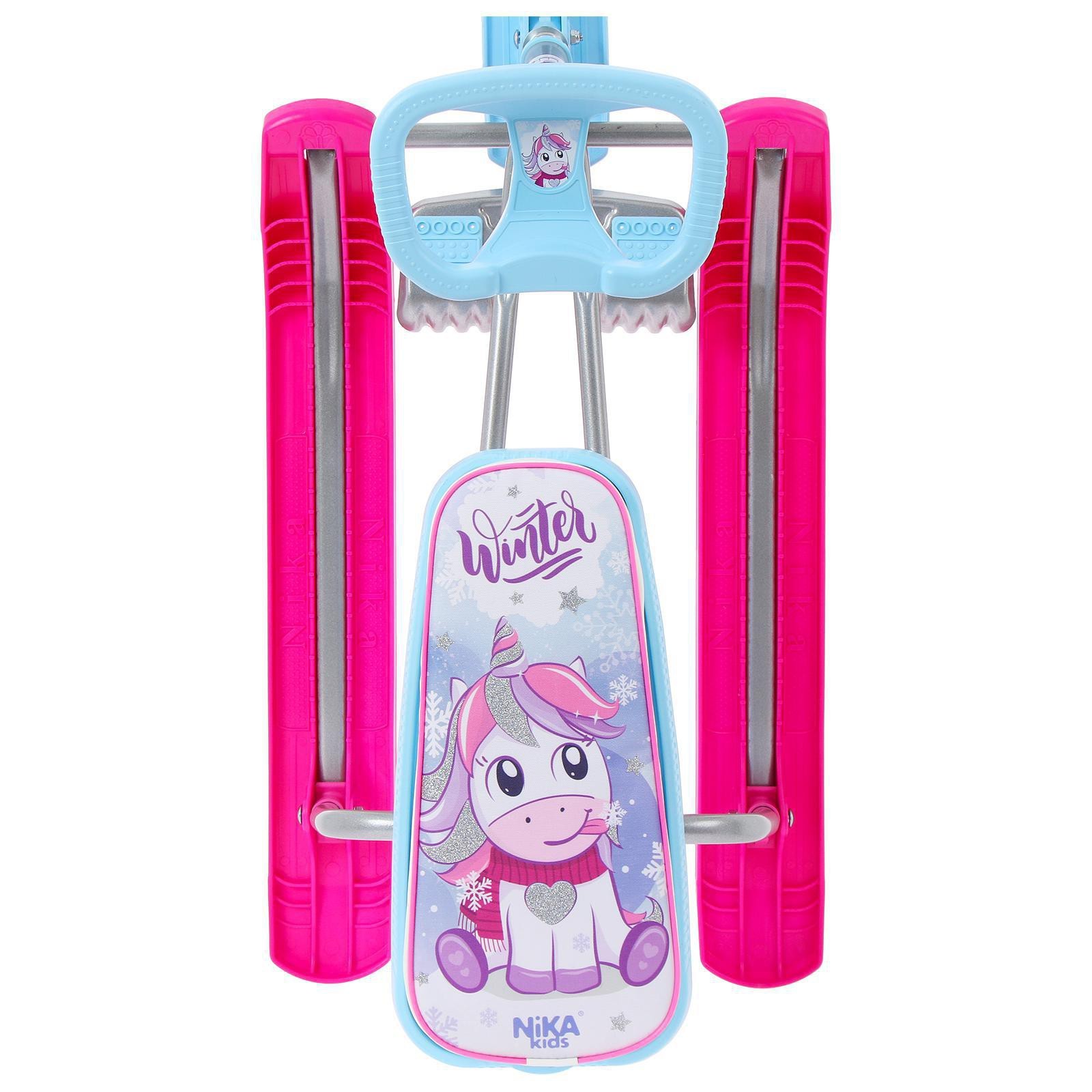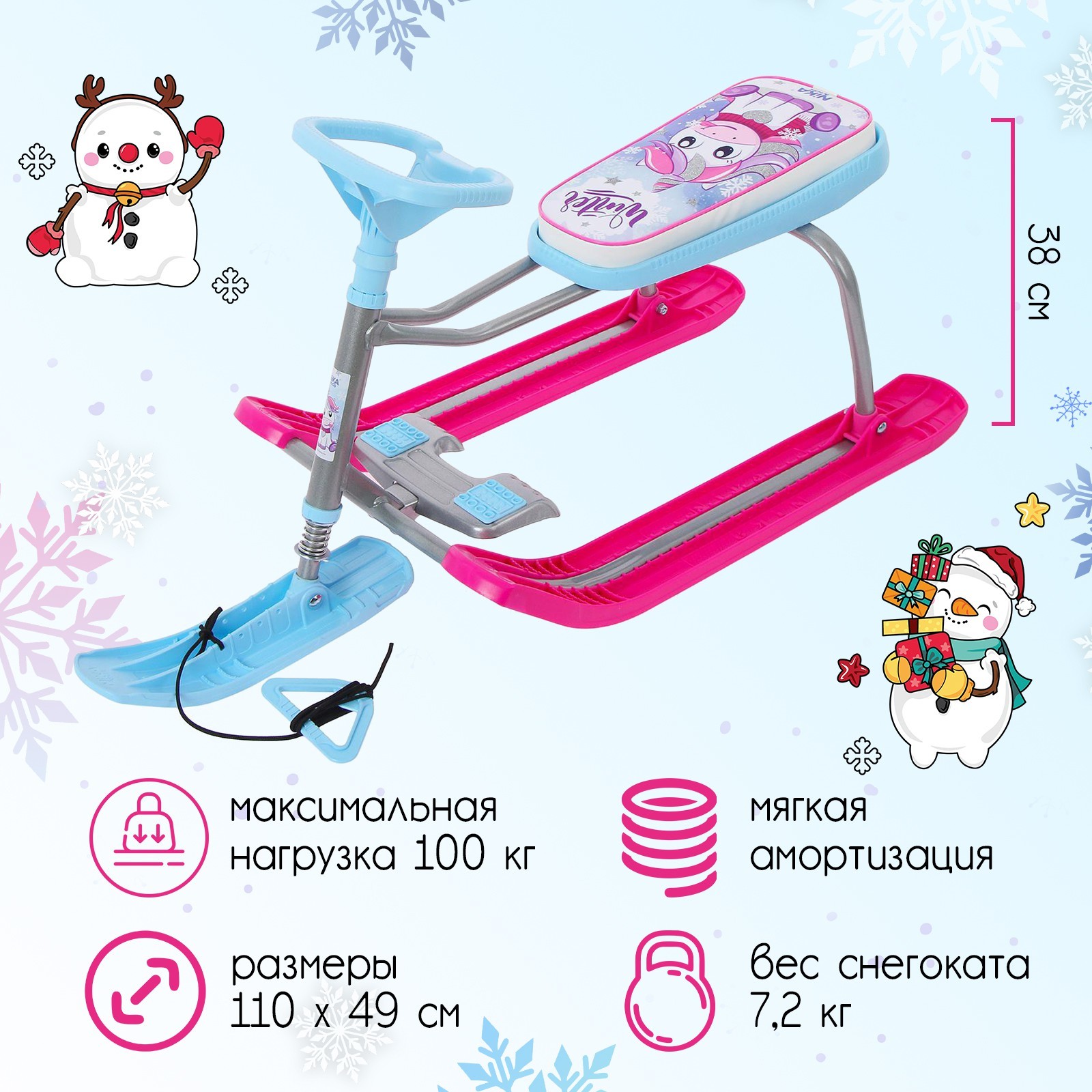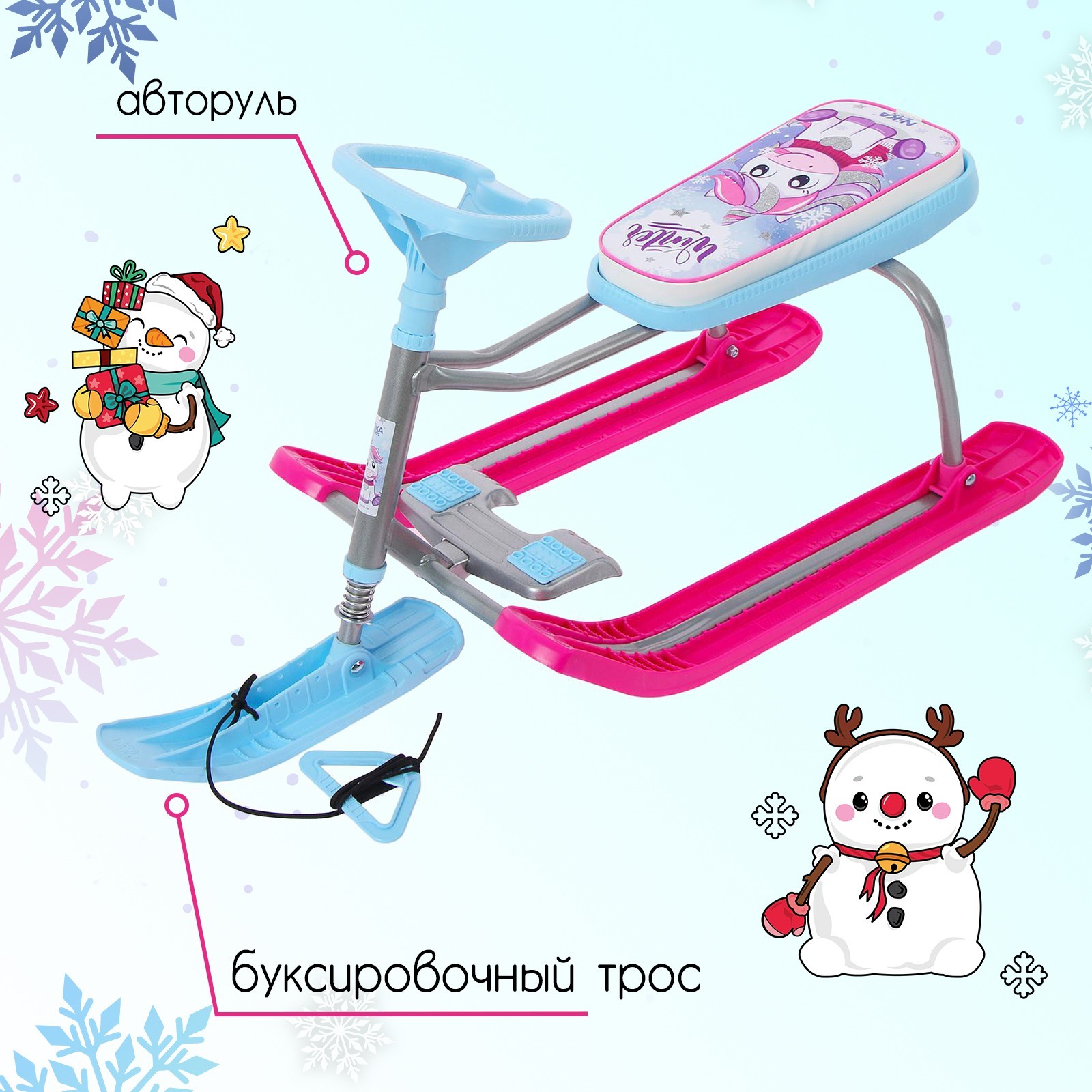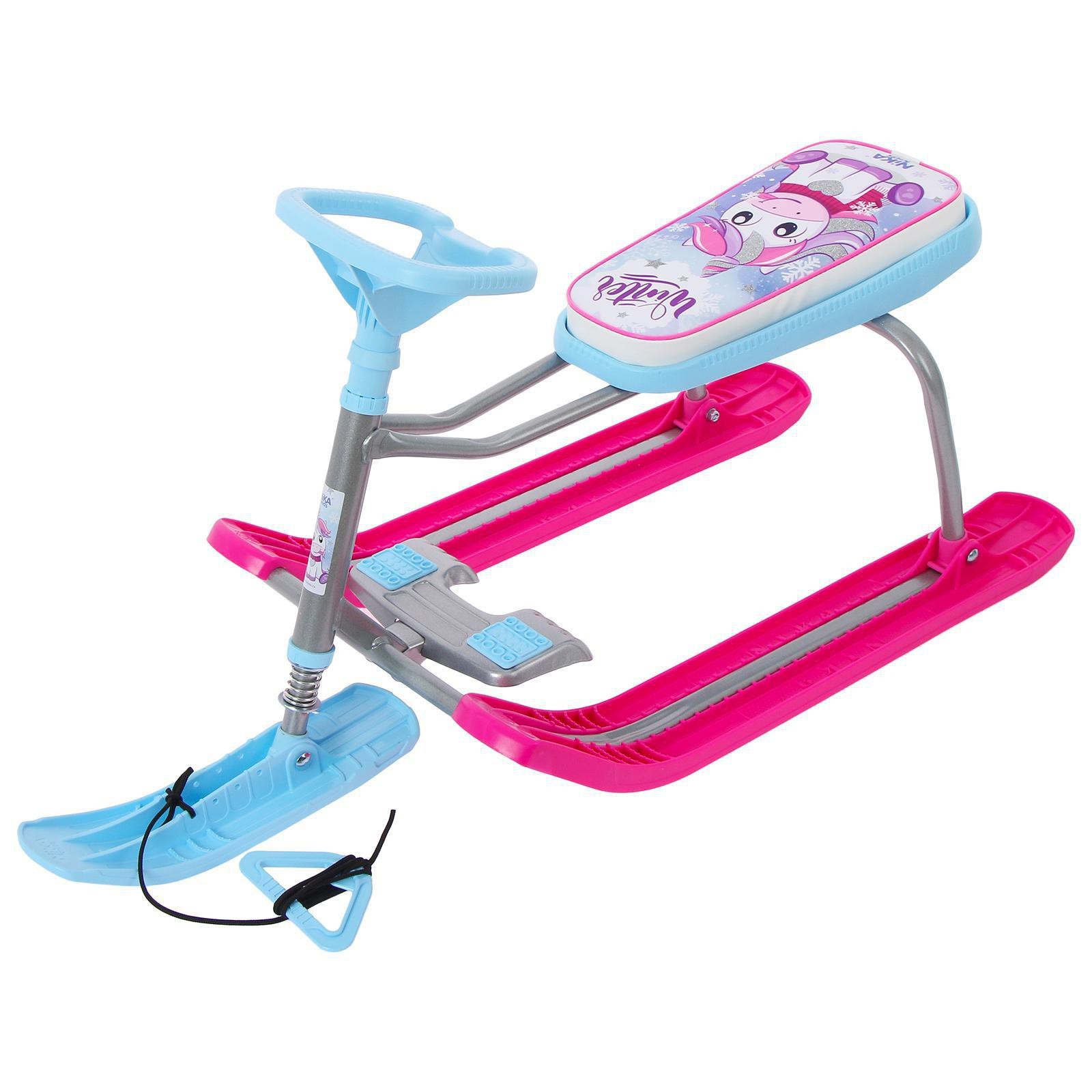 Снегокат «тимка спорт 1 единорог», тс1-м/ер, цвет голубой/серый/розовый. Снегокат предназначен для перевозки детей по плотному снегу или льду, катанию с горок. Имеет сварную конструкцию из стальных труб, пластиковых элементов и мягкое сиденье, обтянутое искусственной кожей с рисунком. Оснащён буксировочным тросом и системой амортизации, которая обеспечивает комфортную поездку по крутым горкам и неровным поверхностям. Усиленный тормоз эффективен на обледенелой поверхности. В комплект входит набор наклеек на снегокат. Характеристики АвторульБуксировочный тросШирина сиденья: 20 смДлина сиденья: 44, 5 смВысота по руль: 54 смВысота по сиденью: 38 смМаксимальная нагрузка: 100 кгМасса: 7, 2 кг Цвет: Голубой Цвет: Серый Возраст: От 7 лет Высота до сиденья, см: 38 Maксимальная нагрузка, кг: 100 Ручка для родителей: Нет Ремень безопасности: Нет Наличие спинки: Нет Тип руля: Велоруль Буксировочный трос: Веревка Регулировка посадочных мест: Нет Температурное ограничение: Нет Амортизатор: Да  развернуть описание ▼