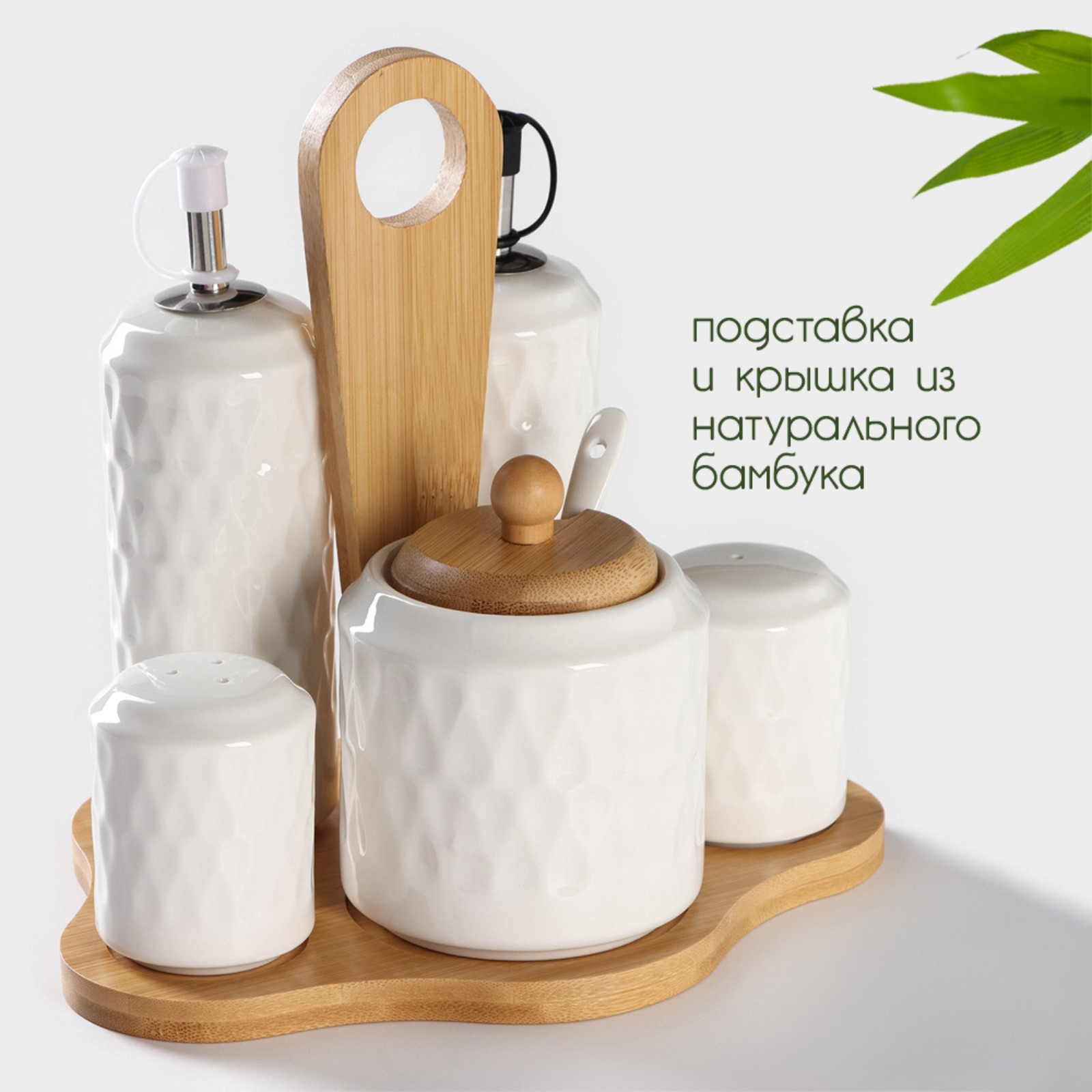 Набор керамический для специй и соусов на бамбуковой подставке Bellatenero, 5 предметов: 2 соусника 200 мл, сахарница 360 мл, со