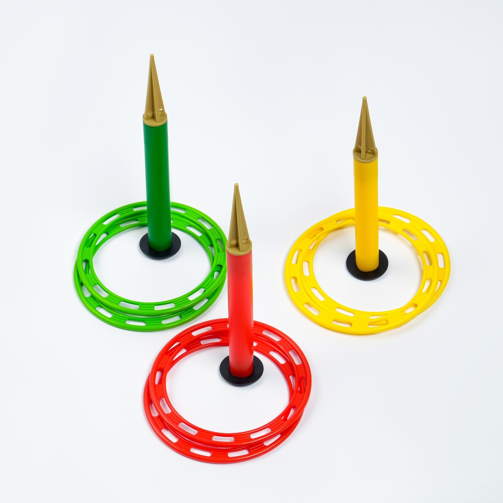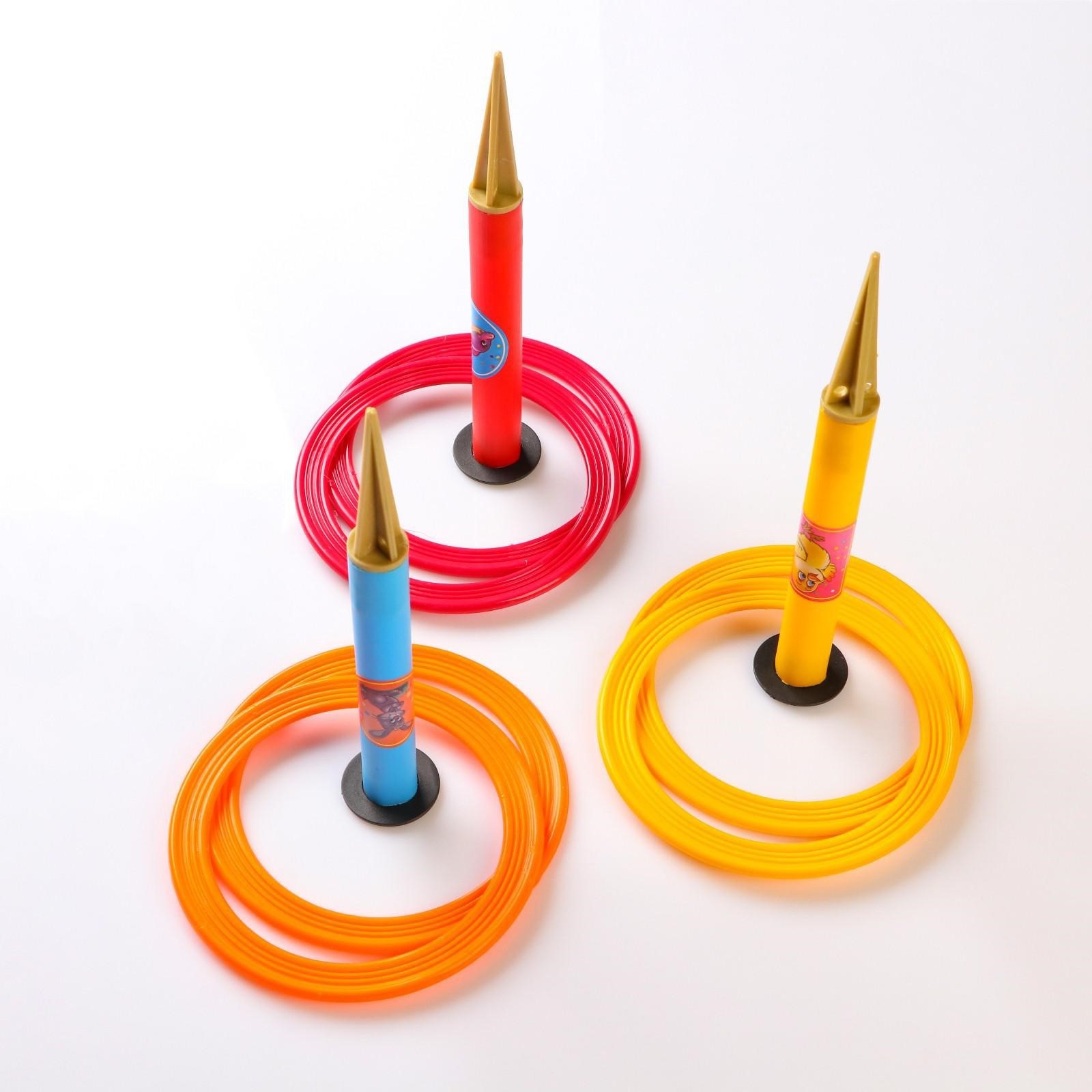 Кольцеброс уличный, 3 стойки, 6 колец. Кольцеброс отлично развивает меткость и ловкость, координацию движений и сноровку, развивает моторику рук. Ребёнку необходимо не только определить траекторию броска, но и решить, с какой силой его нужно совершить, чтобы кольцо попало в цель. Игра отлично подходит для детских праздников и развлечений на даче! Правила игры: Установите стойки. Договоритесь, с какого расстояния будете бросать кольца, какие и по сколько штук. Сначала покажите ребенку, как это делается, начав с небольшого расстояния, а затем постепенно увеличивайте дальность броска. В наборе: 3 стойки и 6 разноцветных колецУвлекательная игра станет отличным подарком малышам и более взрослым детям на день рождения, новый год или другой праздник. Играть можно в помещении или на улице, игру легко взять с собой на прогулку, пляж, на дачу, в загородный дом, на природу или пикник. Яркий тренажер ловкости, меткости, координации движений, концентрации внимания можно установить в детском саду, школе, в детском лагере, на уличной площадке. Возраст: От 3 лет Материал: Пластик Количество игроков: 1 игрок Количество игроков: 2 игрока Вид: Кольцеброс Температурное ограничение: Нет Назначение: Для улицы Вид игры: Кольцеброс Вид: Кольцеброс  развернуть описание ▼
