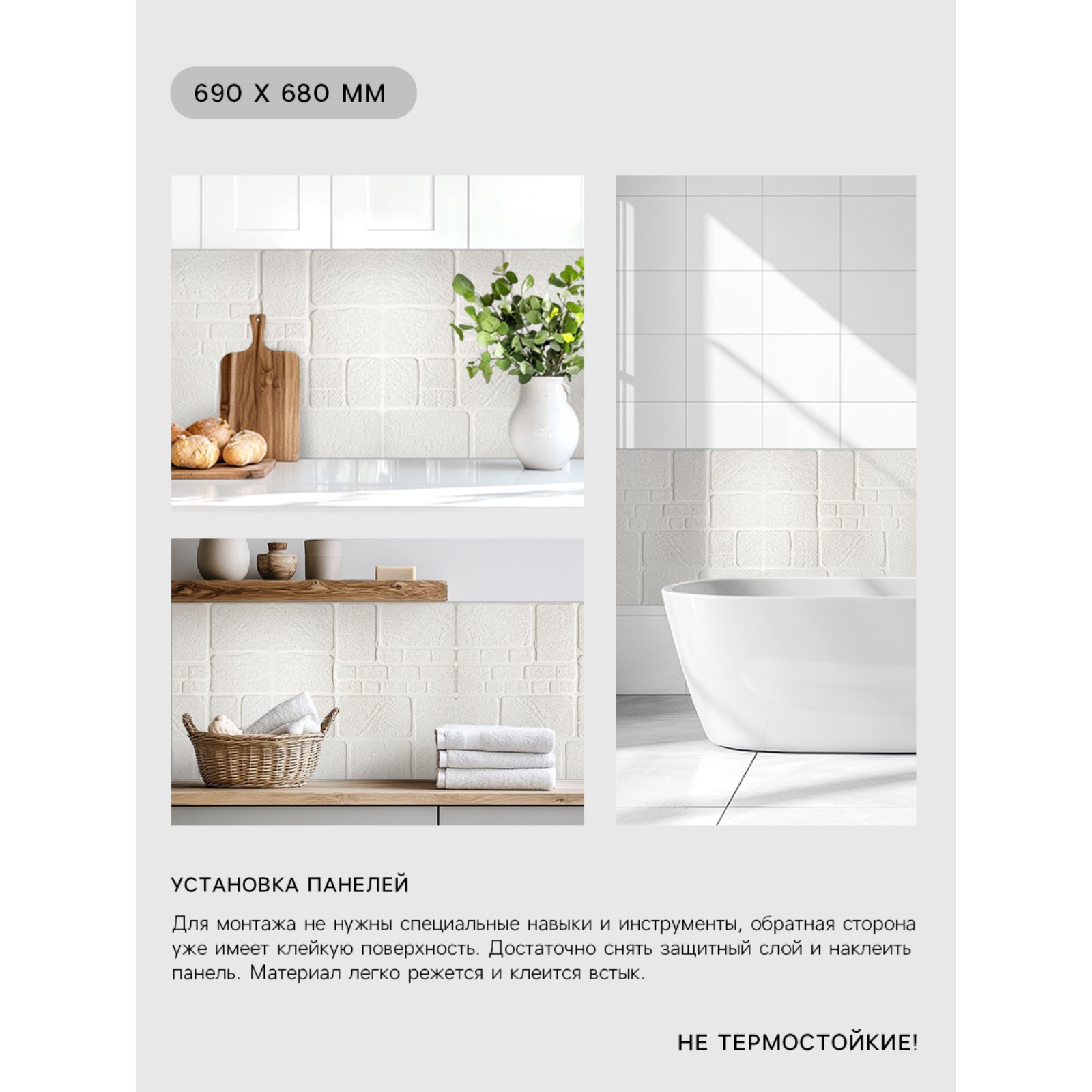 Панель пвх самоклеящаяся take it easy «плитка», 690 680 мм, цвет белый. Самоклеющиеся ПВХ - панели: решение для быстрого ремонта Представляют собой простой и удобный материал для быстрой отделки помещений. Используют для обновления интерьера квартир, офисов и коммерческих объектов. Данный облицовочный материал позволяет быстро преобразить пространство, создать уют и освежить отделку стен. Преимущества самоклеющихся панелей Простота установки: монтаж панелей не требует специальных инструментов и опыта, так как одна сторона покрыта клеевым слоем.Влагостойкость: панели устойчивы к воздействию влаги, их можно успешно применять в кухнях и ванных комнатах.Легкий уход: поверхность панелей легко очищается мягкой губкой с нейтральными моющими средствами.Экономия времени: благодаря простоте наклеивания монтаж занимает минимум времени, позволяя быстро завершить ремонтные работы.ПрименениеРекомендации по установке и эксплуатации Не применяйте панели в местах с прямым контактом воды, таких как пол или зона готовки на кухне.Перед укладкой очистите стену от пыли и грязи, обработав спиртосодержащим раствором для удаления жирных пятен.Используйте дополнительный клей для ПВХ для усиления фиксации, особенно на сложных поверхностях.Избегайте чрезмерного натяжения при наклейке, иначе возможны деформации.Цвет:Белый|Длина, см:69|Ширина, см:68|Высота, см:69|Тематика:Камень|Одноцветный:Да|Подходит для ванной комнаты:Да|Страна:Китай  развернуть описание ▼