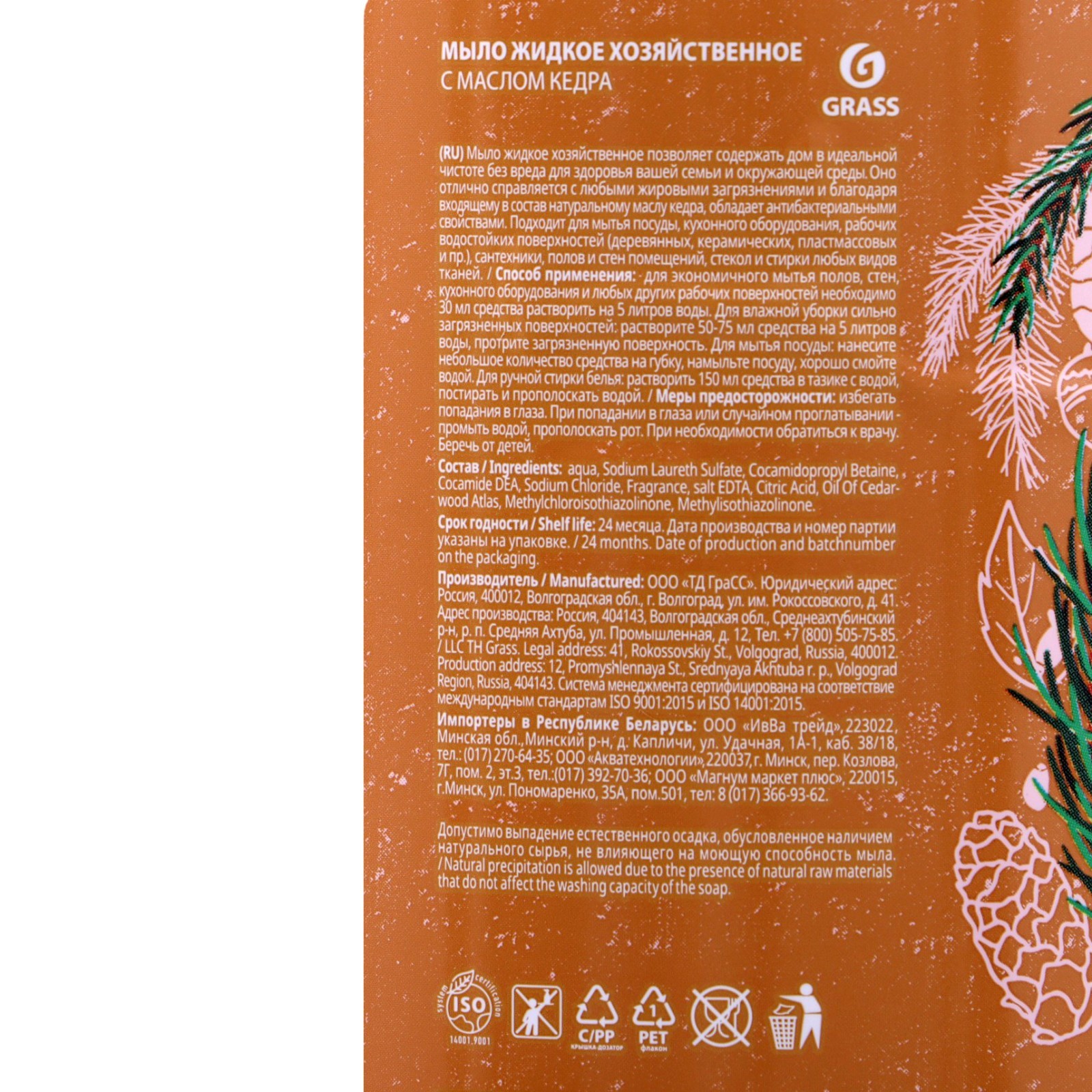 Мыло жидкое хозяйственное с маслом кедра, 1л. Мыло жидкое хозяйственное позволяет содержать дом в идеальной чистоте без вреда для здоровья вашей семьи и окружающей среде. Оно отлично справляется с любыми жировыми загрязнениями и благодаря входящему в состав натуральному маслу кедра, обладает антибактериальными свойствами. Подходит для мытья посуды, кухонного оборудования, рабочих водостойких поверхностей (деревянных, керамических, пластмассовых и пр. ), сантехники, полов и стен помещений, стекол и стирки любых видов тканей. Способ применения: для экономичного мытья полов, стен, кухонного оборудования и любых других рабочих поверхностей. Состав: aqua, Sodium Laureth Sulfate, Cocamidopropyl Betaine, Cocamide DEA, Sodium Chloride, Fragrance, salt EDTA, Citric Acid, Oil Of Cedarwood Atlas, Methylchloroisothiazolinone, Methylisothiazolinone. Цвет: Коричневый parts count: 0 Вес, г/Объём, мл: 1000 Вес, г: 1000 Аромат: Кедр Тип: Жидкое Вид мыла: Хозяйственное Температурное ограничение: Нет Товар 18+: Нет  развернуть описание ▼