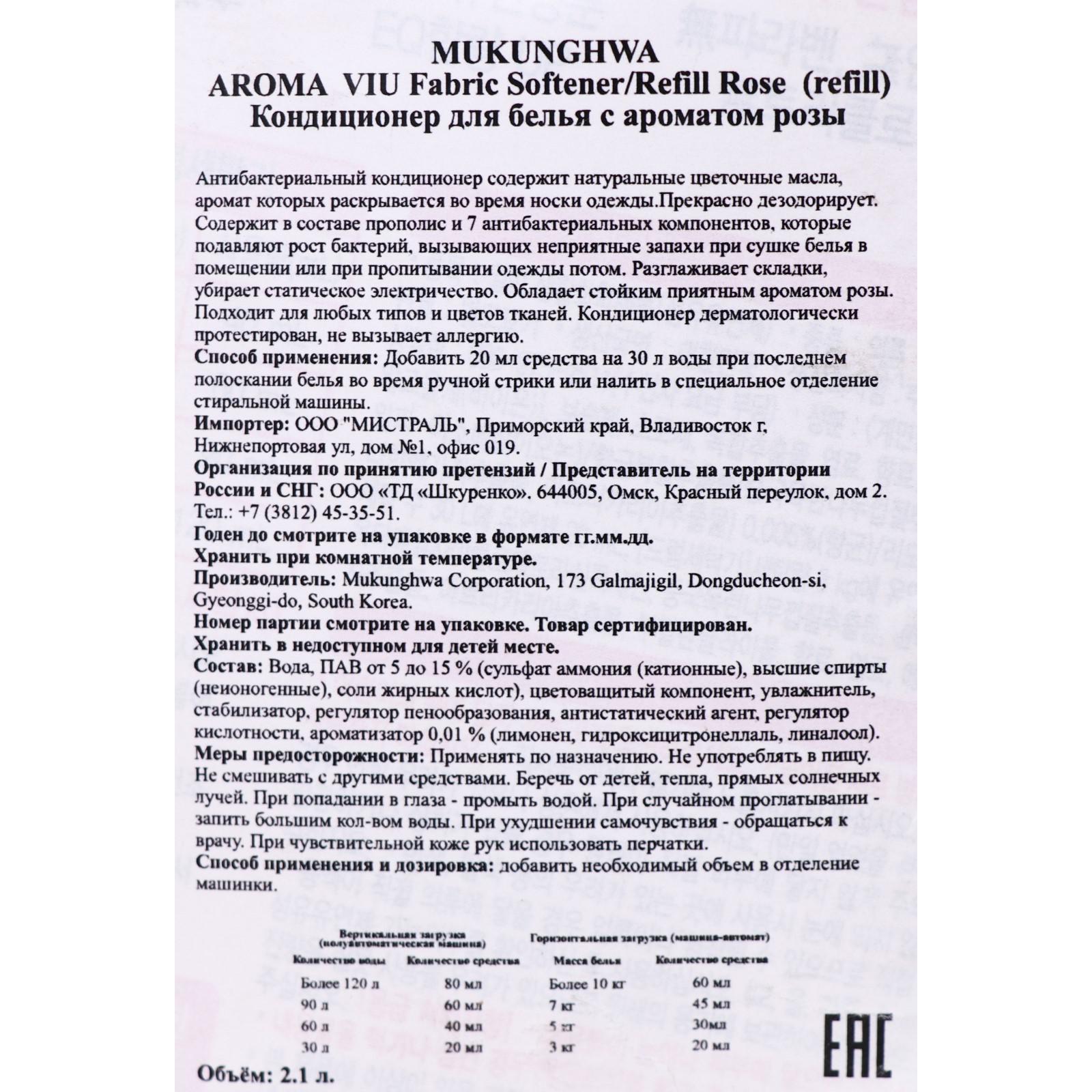 Кондиционер для белья mukunghwa aroma viu "роза", 2.1 л. Антибактериальный ароматизирующий кондиционер с ароматом букета роз. Не содержит консервантов, искусственных красителей. Обладает стойким приятным ароматом розы, натуральные цветочные масла раскрываются на тканях во время носки. Подходит для любых типов и цветов тканей. Смягчающий, разглаживающий, антистатический, улучшает свойства тканей, прекрасно дезодорирует. Содержит в составе прополис и 7 антибактериальных компонентов, которые подавляют рост бактерий, вызывающих неприятные запахи при сушке белья в помещении или при пропитывании одежды потом. Кондиционер дерматологически протестирован, не вызывает аллергии, раздражений. Объём, л: 2.1 Температурное ограничение: Нет  развернуть описание ▼