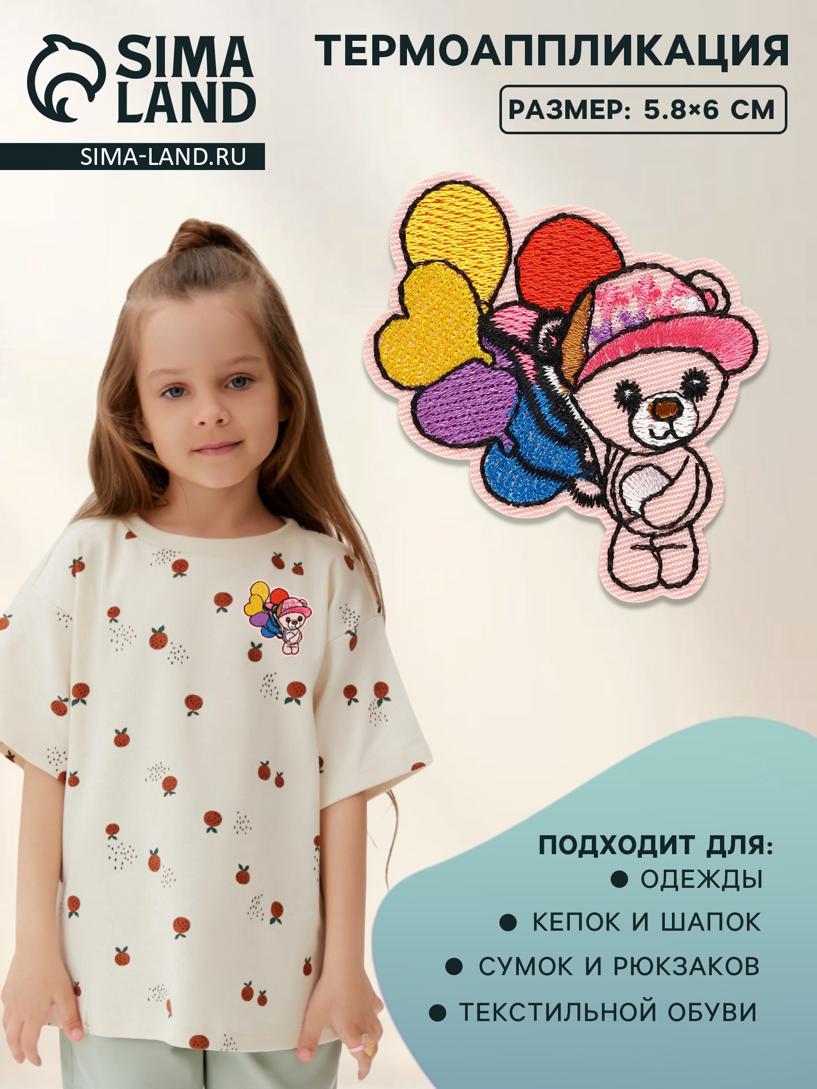 Термоаппликация «мишка с шариками», 5.8 6 см, разноцветная. Создайте праздник на детской одежде за минуты! Красочный медвежонок с воздушными шарами превращает обычные вещи в праздничные. Почему мамы выбирают эти аппликации Яркий разноцветный дизайн нравится детям и подходит для любой детской одеждыБезопасный полиэстер фиксируется за 30 секунд утюгом — не нужно шить или клеитьОптимальный размер 5,8 6 см хорошо смотрится на кармашках, рукавах и спинке футболокДобавьте немного праздника в повседневность — украсьте вещи весёлым мишкой! Набор:Нет|Цвет:Разноцветный|Для кого:Для девочки|Длина, см:5.8|Ширина, см:6|Фасовка, шт.:10|Тематика:Детская|Тематика праздника:Универсальная тематика|Материал:Нетканый материал|Материал:Полиэстер|Двусторонний:Нет|Вид наклейки:Термонаклейка|Вид:Текстильные |Особенности :Без особенностей|Страна:Китай  развернуть описание ▼