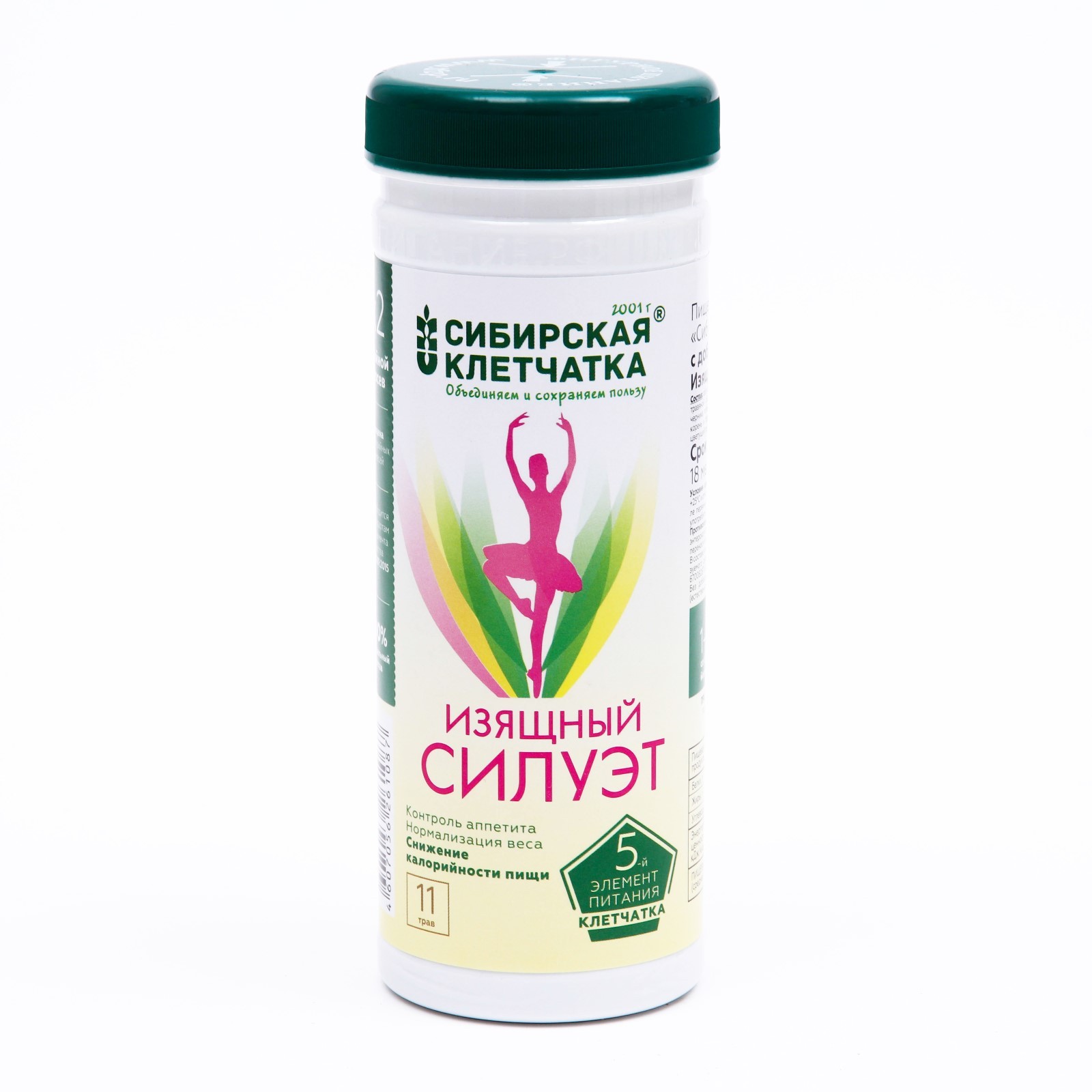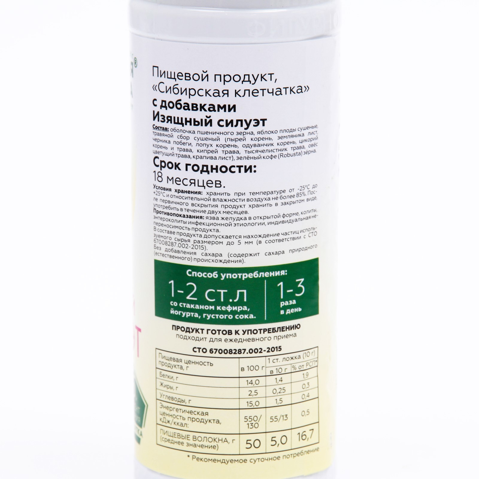 Сибирская клетчатка «изящный силуэт», 170 г. Если вам некогда заниматься спортивными упражнениями, соблюдать диету, поступайте просто - добавляйте в пищу Сибирскую клетчатку «Изящный силуэт» и положительные результаты не заставят себя долго ждать. Способ применения: клетчатка готова к употреблению, не требует заваривания: 2 ст. ложки клетчатки на 250 мл воды комнатной температуры или кефира/йогурта/других густых жидкостей. Настоять 1 минуту. Выпивать за 10-15 минут до еды 1-3 раза в день. Состав: оболочка пшеничного зерна, яблоко плоды, травяной сбор (пырей корень, земляника лист, черника побеги, лопух корень, одуванчик корень, цикорий корень и трава, кипрей трава, тысячелистник трава, овёс цветущий трава, крапива лист), зелёный кофе (Robusta). Жиры, г: 2.5 Белки, г: 14 Углеводы, г: 15 Энергетическая ценность, ккал: 130 Вес нетто, г: 170 Вид упаковки: Банка Температурное ограничение: Нет Назначение: Для похудения Назначение: Для желудка и кишечника Форма выпуска: Порошок  развернуть описание ▼