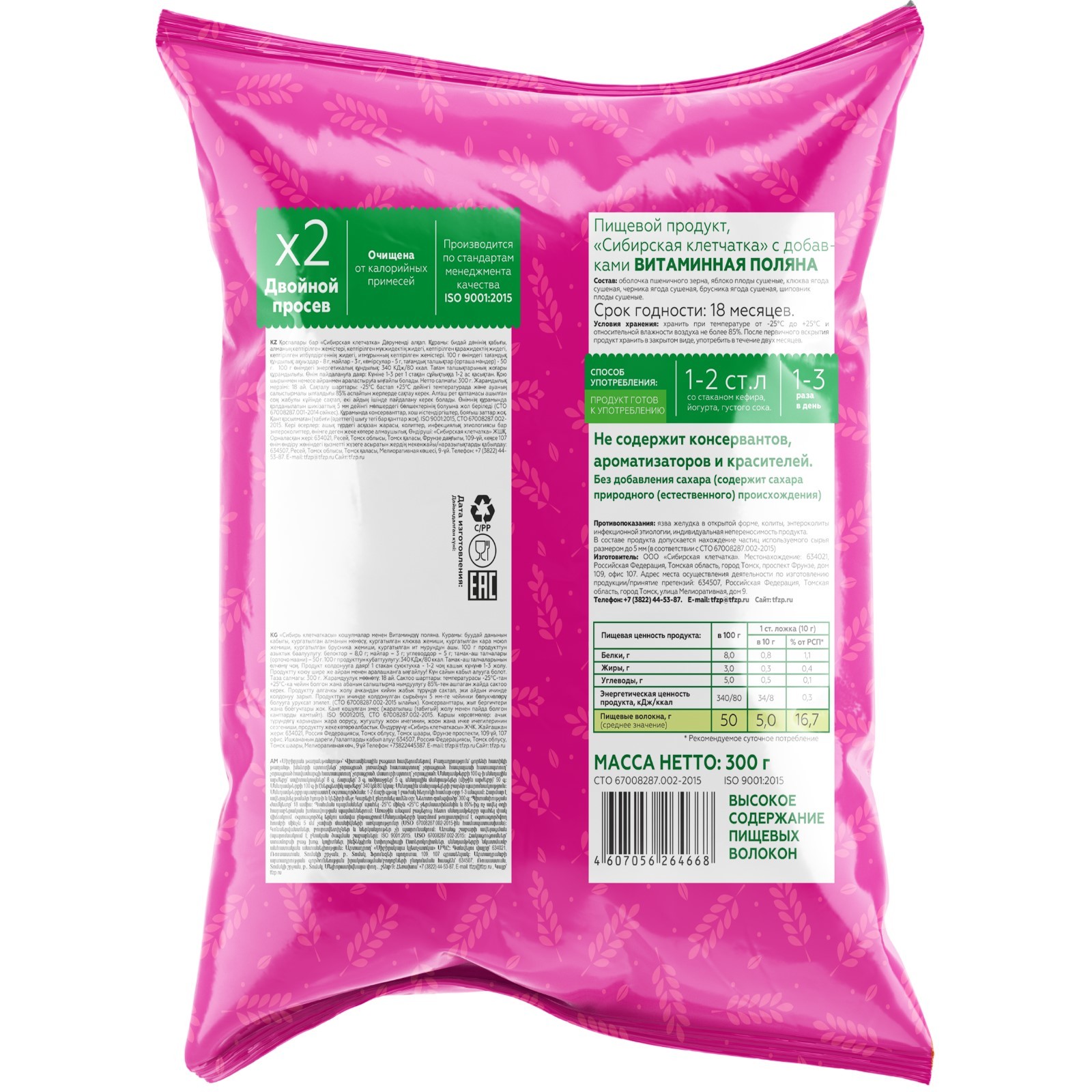 Сибирская клетчатка «витаминная поляна», 300 г. Наш самый любимый продукт, который более 17 лет помогает людям эффективно и быстро восполнить дефицит пищевых волокон (клетчатки) в рационе питания, избежать многих болезней, связанных с дисбалансом питания и недостатком движений. Назначение: улучшение работы кишечника;природная поддержка органов пищеварения;для баланса рациона питания. Способ употребления: продукт готов к употреблению! 1-2 ст. л. на 1 стакан жидкости (кефир, йогурт, густой сок), 1-3 раза в день. Не требует запаривания. Подходят для ежедневного приема пакетика в день до еды или вместо перекуса. Противопоказания: язва желудка в открытой форме, колиты, энтероколиты инфекционной этиологии, индивидуальная непереносимость продукта. Состав: оболочка пшеничного зерна, яблоко плоды, клюква ягода, черника ягода, брусника ягода, шиповник плоды. Жиры, г: 3 Углеводы, г: 5 Белки, г: 8 Энергетическая ценность, ккал: 80 Вес нетто, г: 300 Вид упаковки: Банка Температурное ограничение: Нет Назначение: Для похудения Назначение: Для желудка и кишечника Форма выпуска: Порошок  развернуть описание ▼