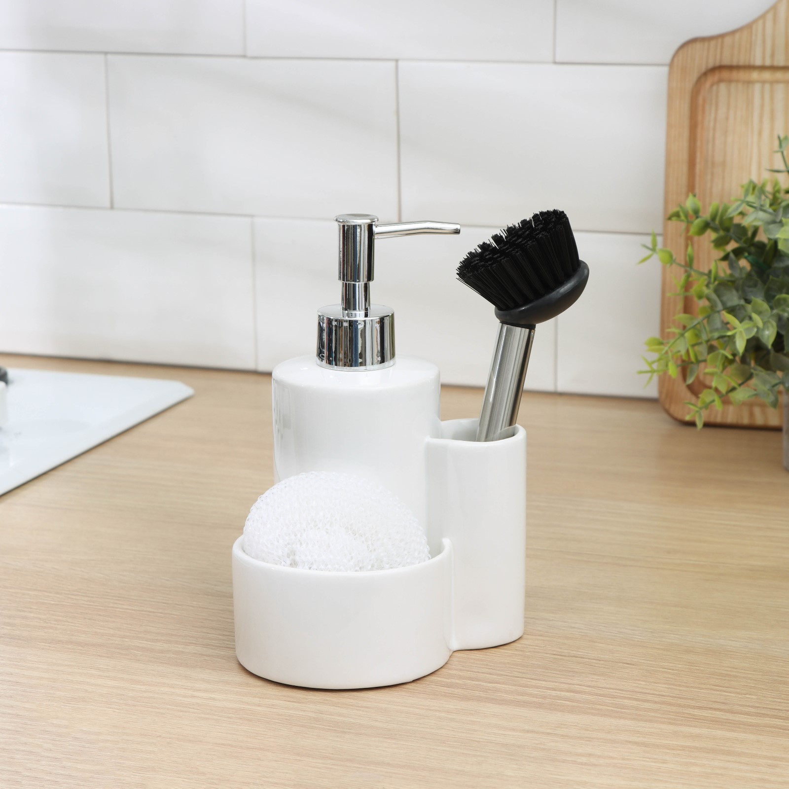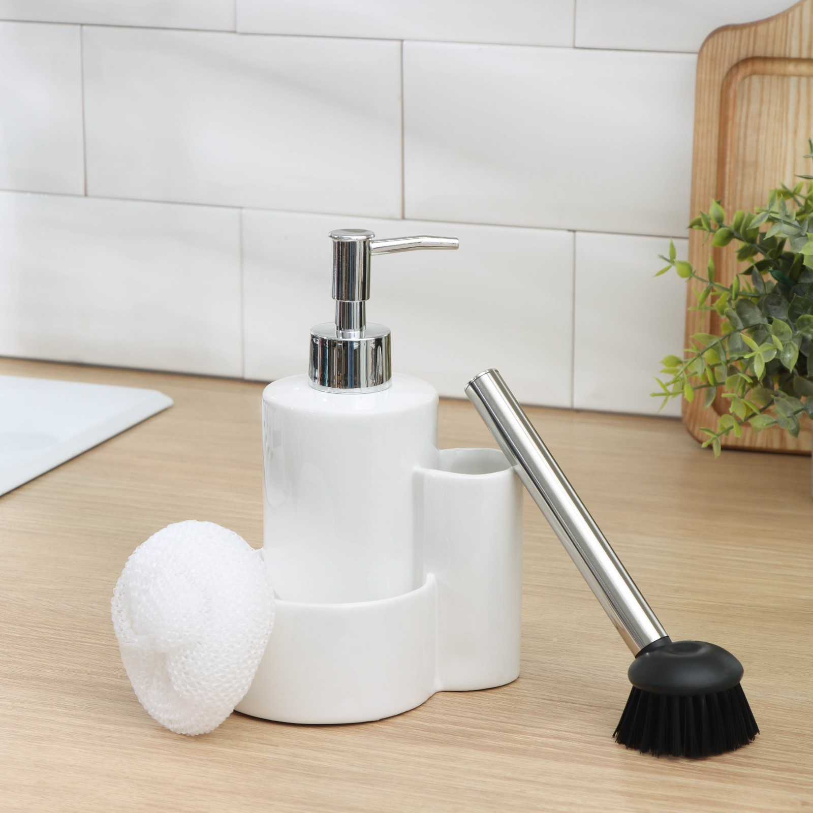 Дозатор для моющего средства доляна «милитари», 370 мл, с губкой и щёткой, цвет белый. Цвет: Белый Объём, мл: 370 Тематика: Однотонная Материал: Керамика Наличие губки/щётки: Да Настенные: Нет Запрет реализации по сегментам: 00000000485  развернуть описание ▼