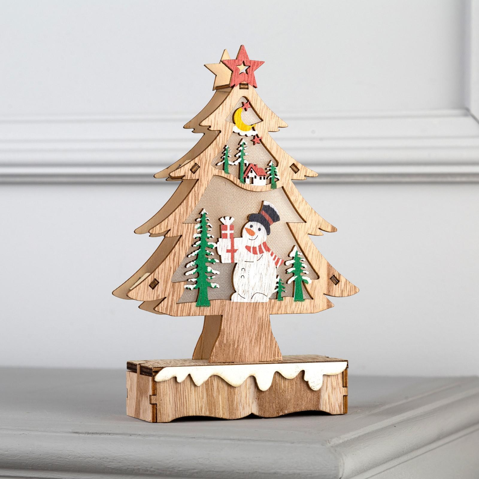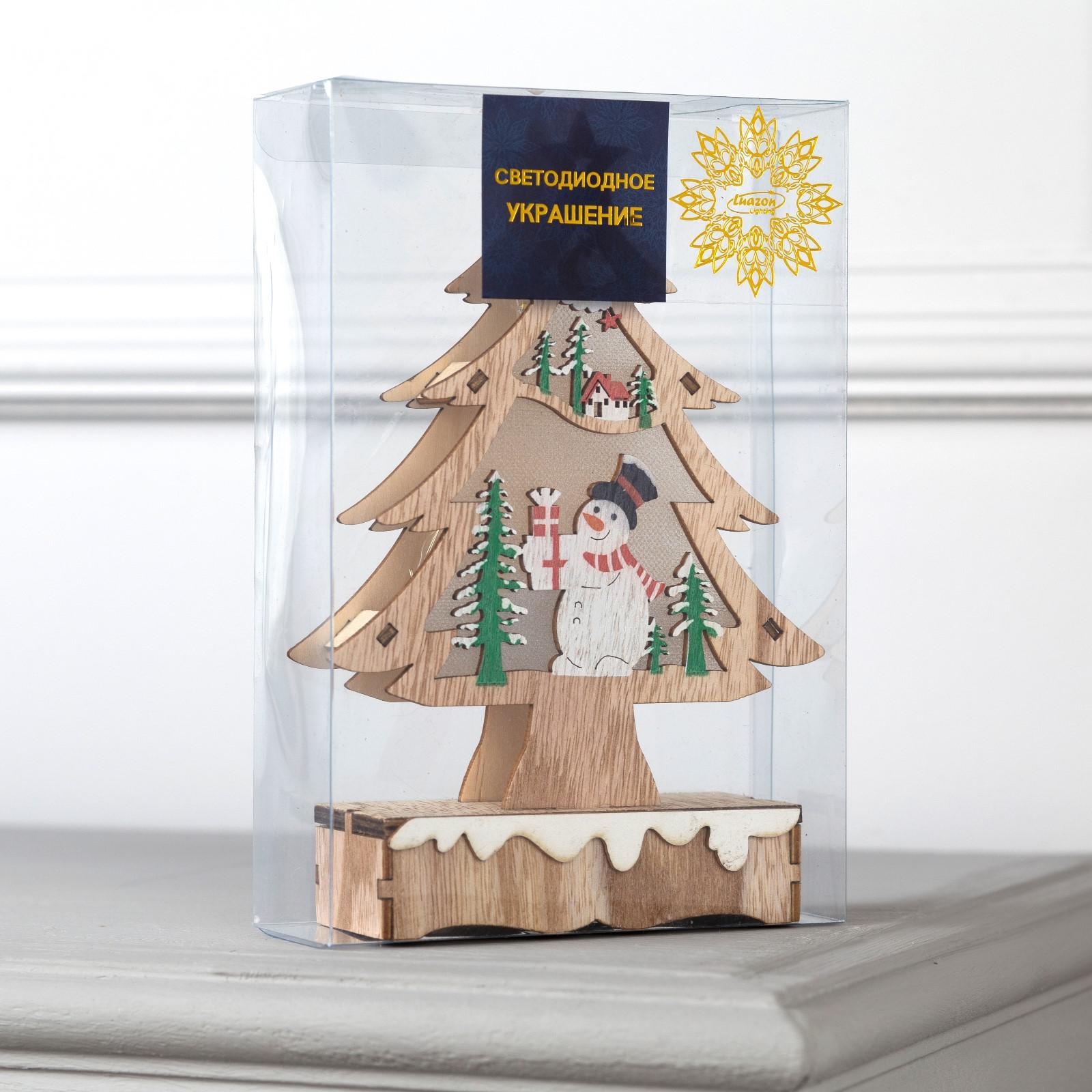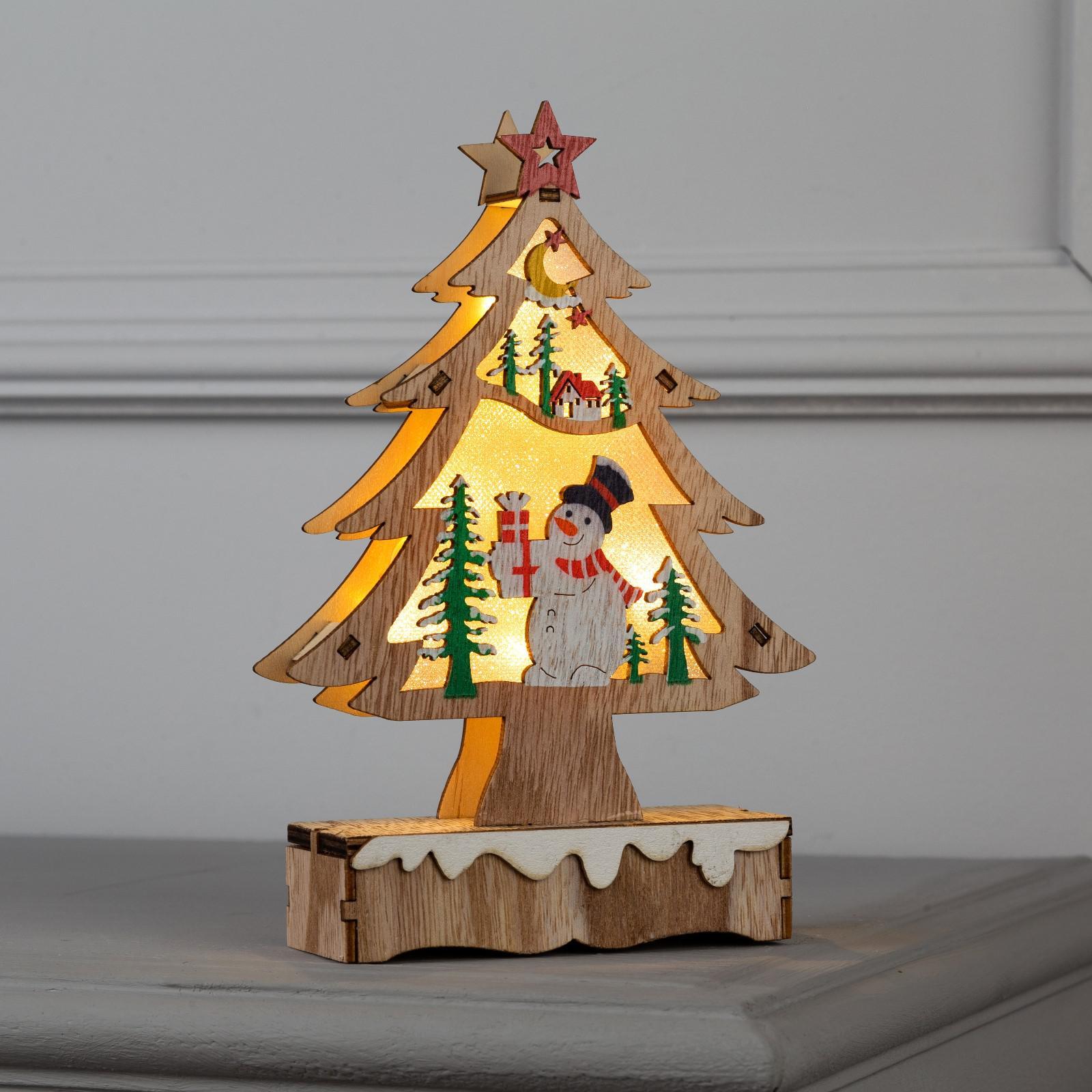 Светодиодная фигура «ёлка со снеговиком» 12 20 5 см, дерево, батарейки ааах2 (не в комплекте), свечение тёплое белое. Разнообразные новогодние световые фигуры – это прекрасный вариант оформления к Новому Году и любому другому торжеству, а также отличное дополнение интерьера. Такие фигуры довольно активно используются в качестве светового оформления различных кафе, торговых центров, магазинов и ночных клубов, для создания новогоднего оформления в доме, офисе, и даже на улице. Насыщенные цвета и экологическая безопасность обеспечивает их высокую популярность как среди профессионалов, так и у бытовых потребителей. Преимущества: Продуманный ассортимент, отвечающий современным тенденциям рынка и любым, самым требовательным, запросам наших клиентов;Высокое качество сборки и многоступенчатый контроль качества на всех этапах производства;Неповторимая праздничная упаковка Luazon Lighting, доставляет радость и атмосферу праздника каждому покупателю;Возможность с помощью освещения создать собственную неповторимую атмосферу;Комфортная для глаз цветопередача.Цвет свечения:Тёплый белый|Режим работы:Постоянное свечение|Цвет:Бежевый|Высота, см:20|Гарантийный срок, мес.:6|Количество светодиодов:6|Тематика праздника:Новый год|Материал:Дерево|Материал:Дерево|Тип питания:От батареек|Эффект снежного вихря:Нет|Стиль:Датский|Страна:Китай  развернуть описание ▼