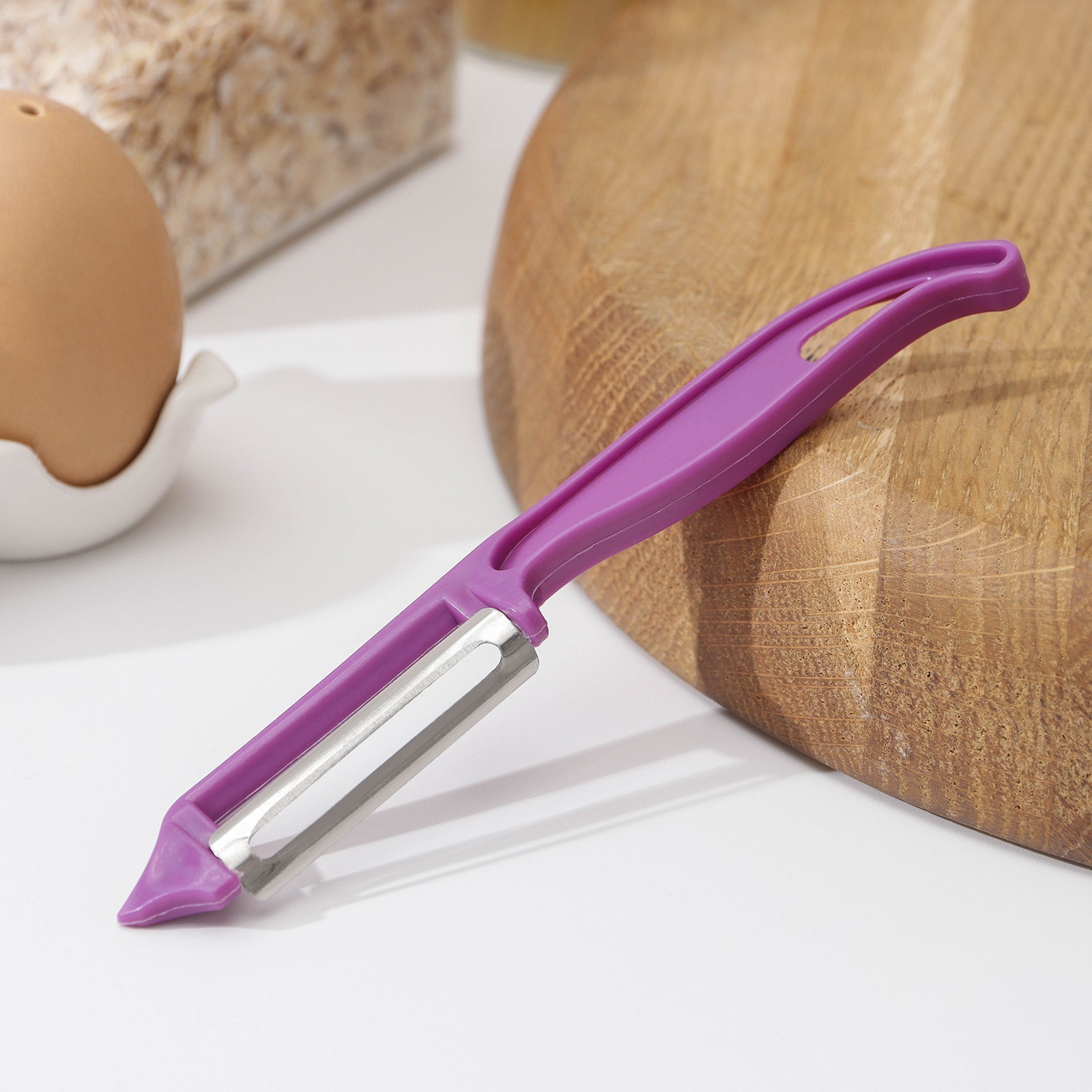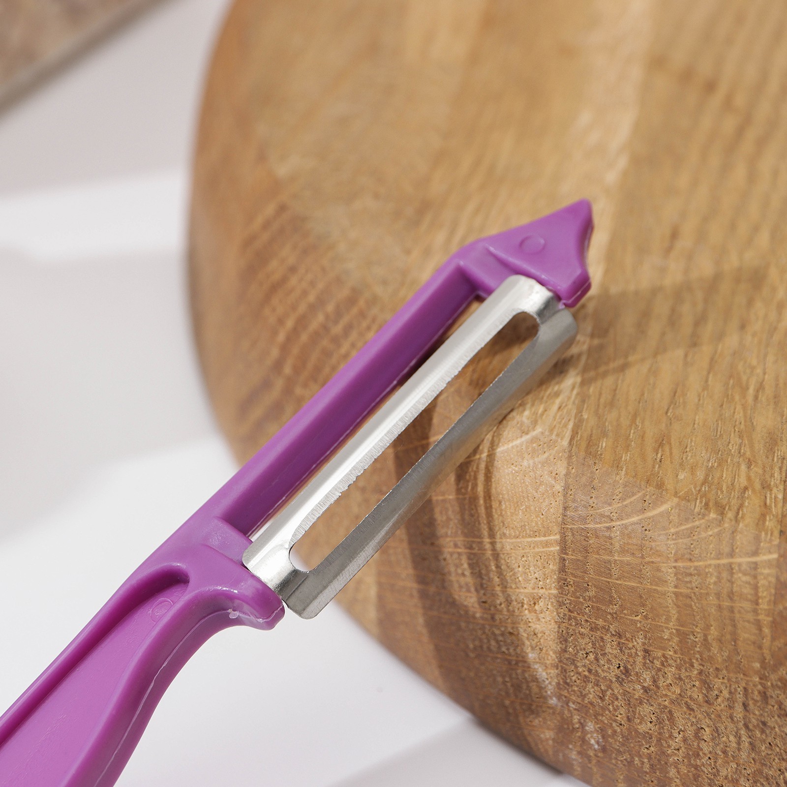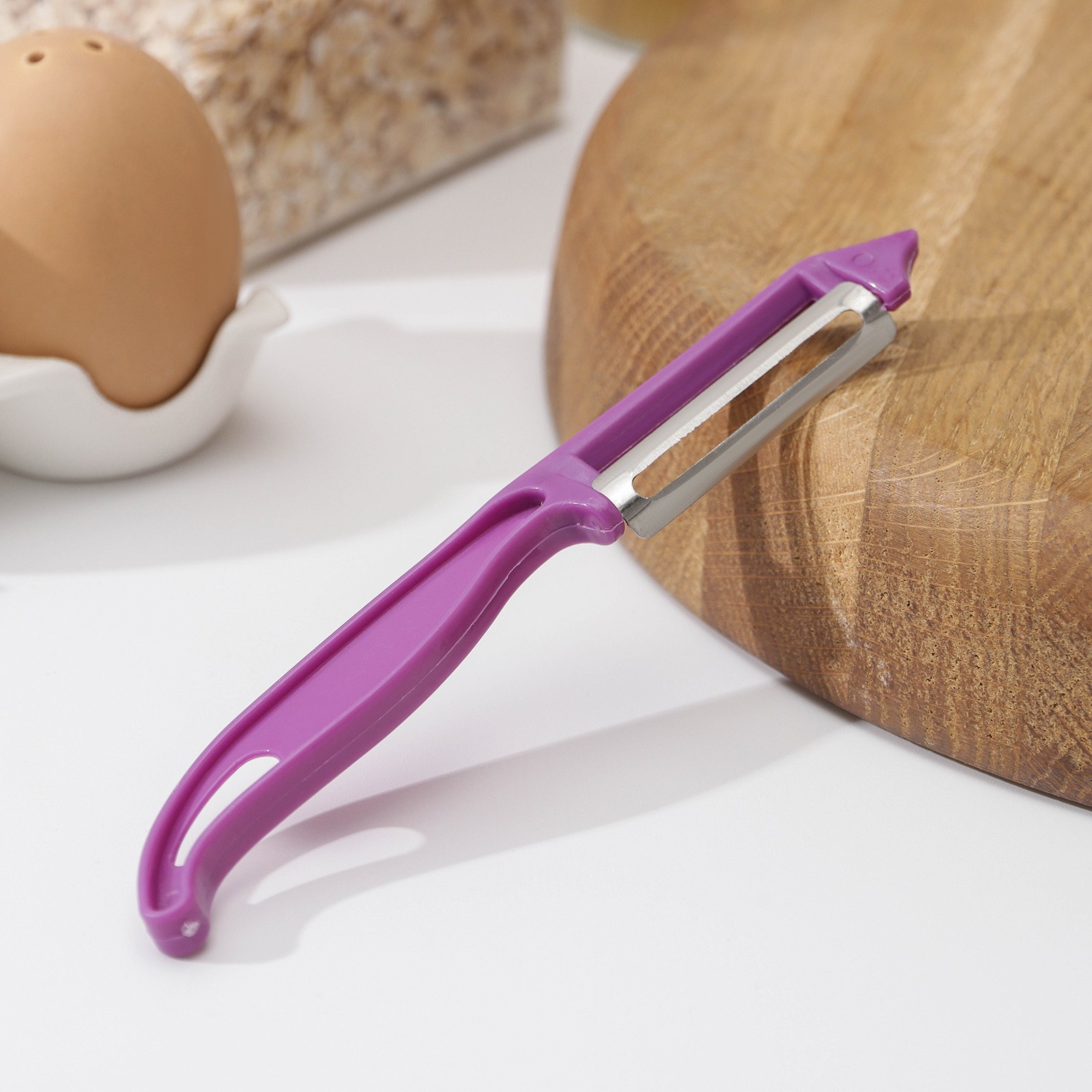 Овощечистка доляна «волна», 14 см, цвет фиолетовый. Кухня современной хозяйки наполнена различными приборами, облегчающими процесс приготовления пищи. Один из них – ручная овощечистка. Овощечистка подходит для снятия кожуры с фруктов, овощей, корнеплодов, а также для нарезки продуктов на тонкие слайсы. Овощечистка проста в применении, не требует много места для хранения, легко моется, долговечна. Рекомендации по использованию: Пиллер (вертикальная овощечистка) имеет сходство со столовым ножом, но рабочей поверхностью в этом случае выступает не всё металлическое полотно, а только встроенное в него лезвие. Положение овощечистки в pуке схоже с хватом кухонного ножа. После надреза и зацепления пиллера за кожуру, вы можете двигать овощерезку вдоль плода, медленно поворачивая овощ, или очистить продукт несколькими отрывистыми движениями. Цвет: Фиолетовый Материал ручки: Пластик Контейнер: Нет Можно мыть в посудомоечной машине: Нет Материал лезвия: Нержавеющая сталь Тип: Вертикальная  развернуть описание ▼