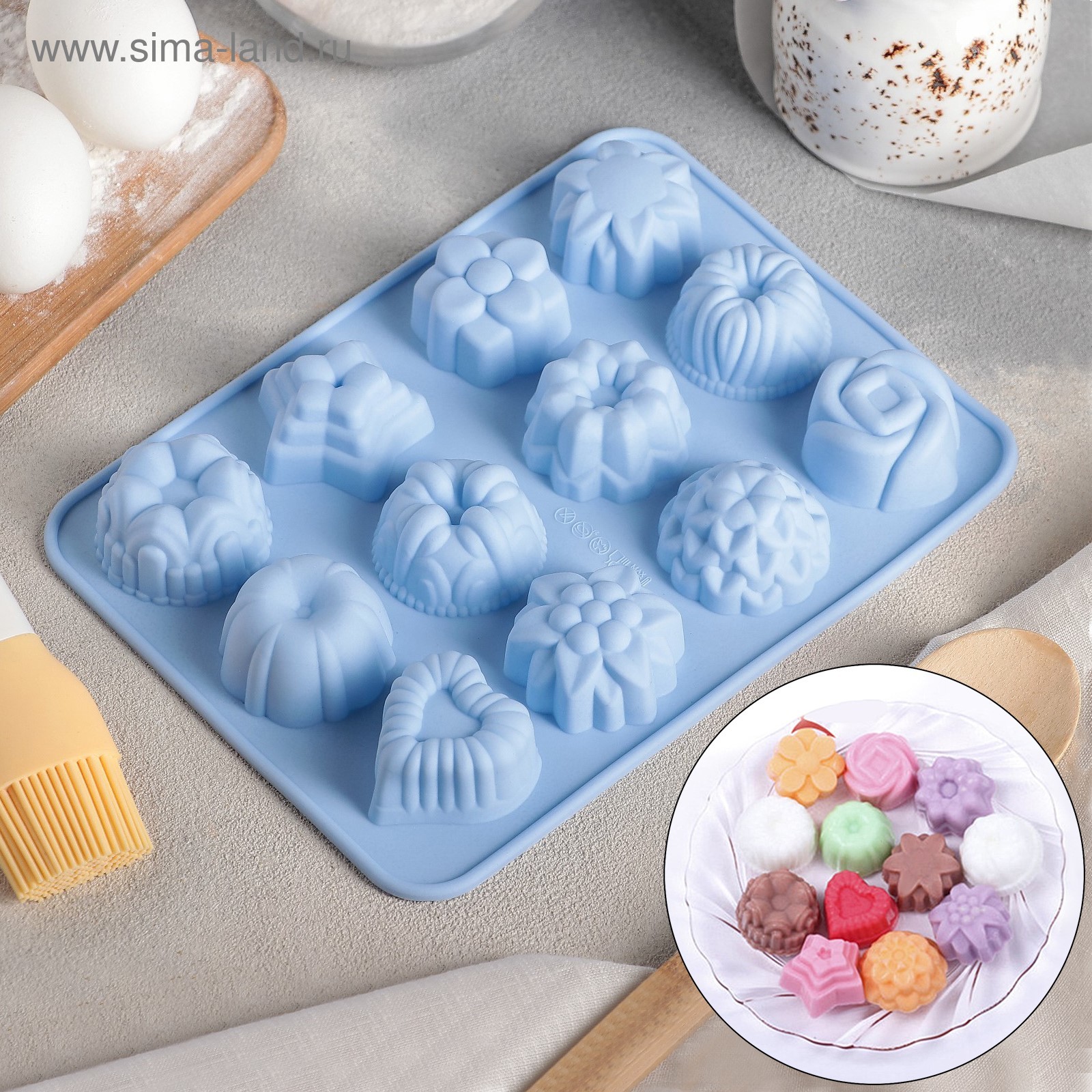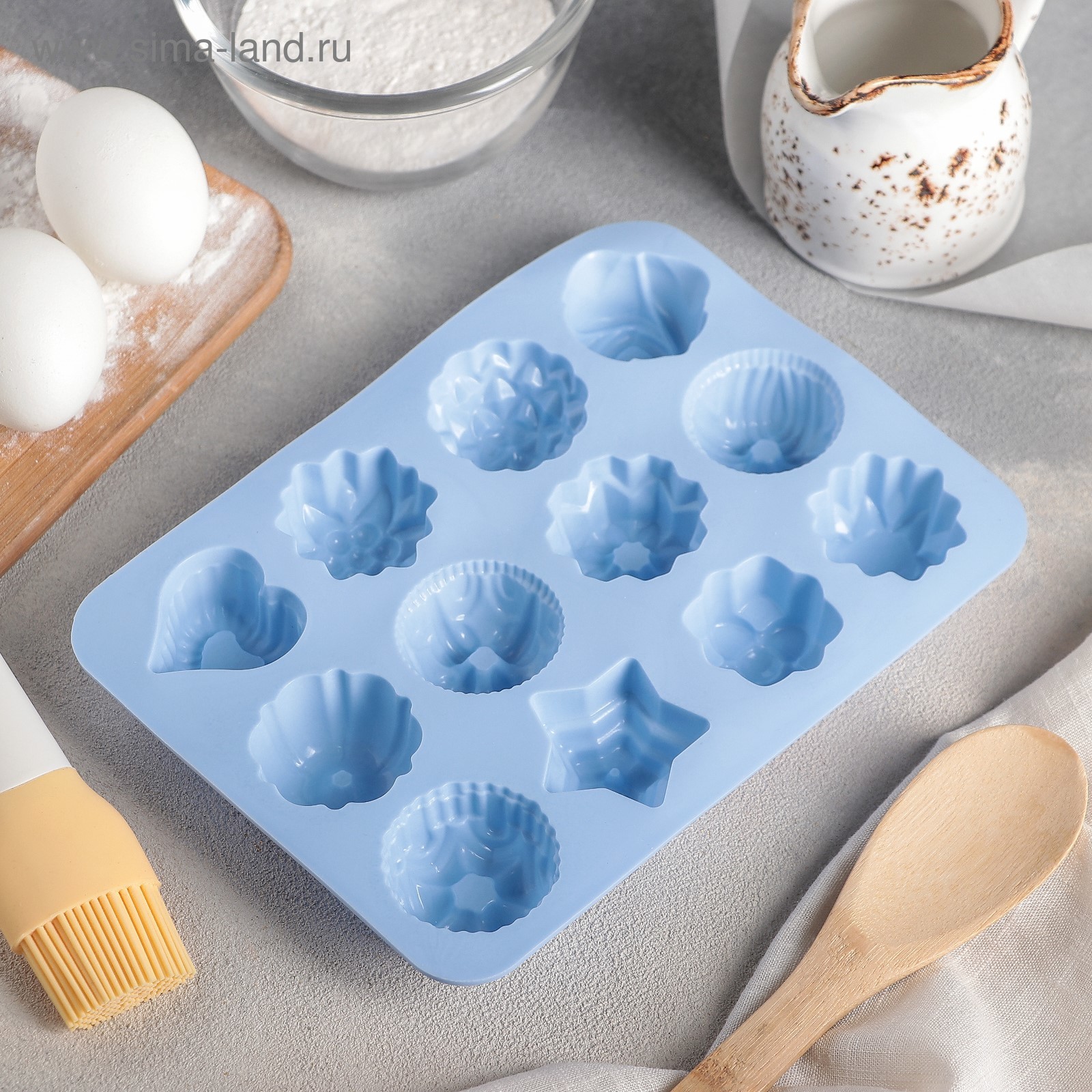Форма силиконовая для выпечки доляна «немецкий кекс, роза», 16x21 см, 12 ячеек, цвет голубой. Цвет: Голубой Форма: Фигурная Фасовка, шт.: 1 Количество ячеек: 12 Крышка: Нет Материал: Силикон Тип покрытия: Без покрытия Ячейки: Да Наличие палочек для форм: Нет Тип формы: Для печенья и пирожных Разъёмная форма: Нет Съёмное дно: Нет Можно мыть в посудомоечной машине: Да  развернуть описание ▼