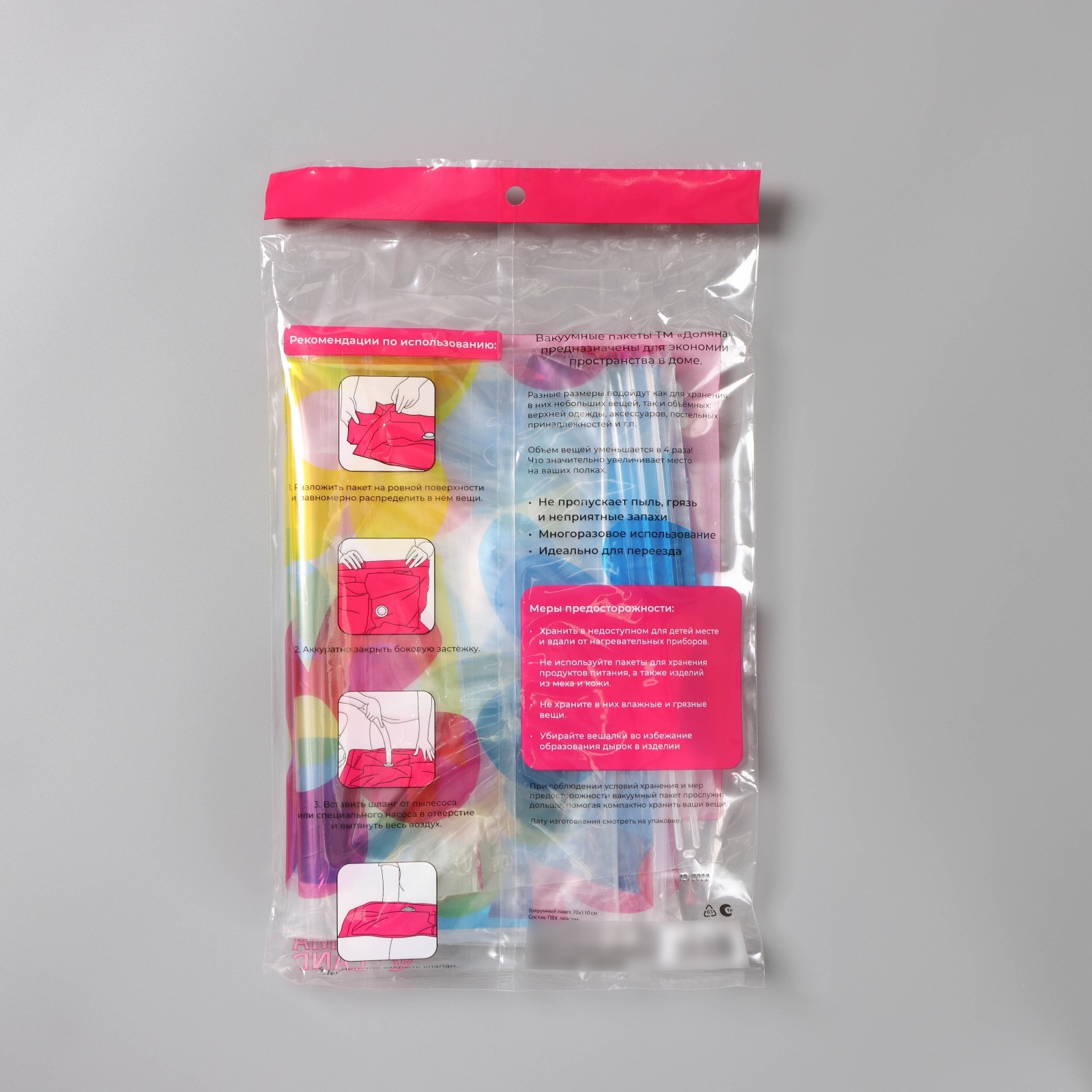 Вакуумные пакеты защитят ваши вещи от влаги, плесени и моли. Прекрасно сэкономят место в чемодане. Вакуумные пакеты можно использовать многократно. Полностью герметичны. Правила по эксплуатации: