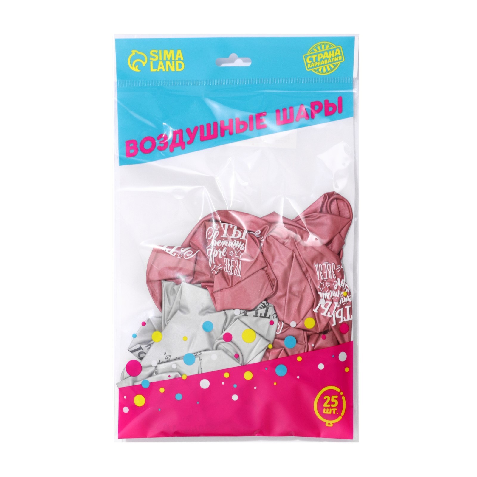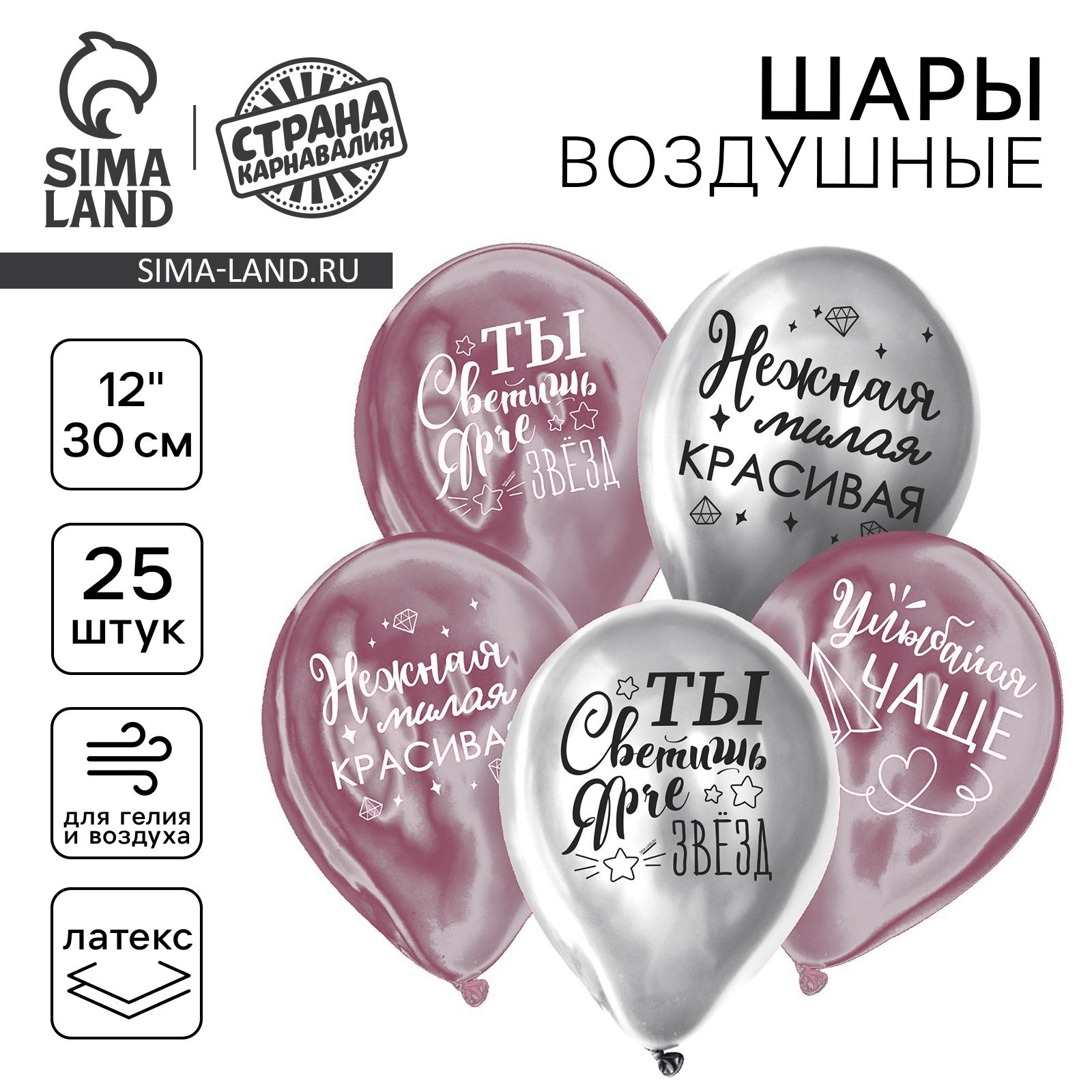 Набор:Да|Цвет:Серебристый|Цвет:Розовый|Диаметр, дюйм:12|В наборе, шт.:25|Рисунок:Да|Тематика праздника:Универсальная тематика|Адресат:Женщине|Материал:Латекс|Тематика рисунка:Комплименты|Вид шара:Классический|Надувка шара:Гелием|Надувка шара:Воздухом|Язык надписи:Русский|Оттенок:Хром|Страна:Россия