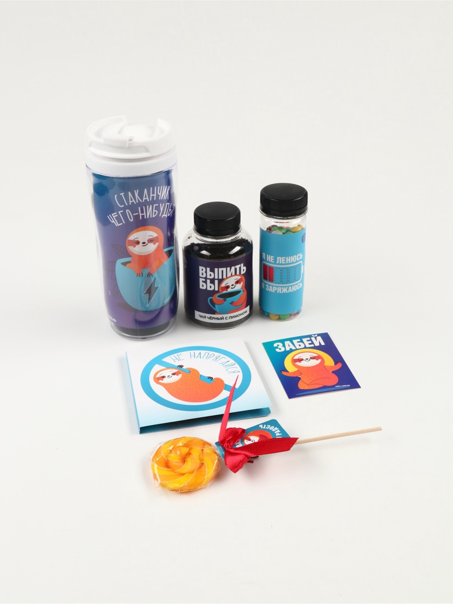 Набор «пофигин»: чай, драже, шоколад, термостакан,леденец.