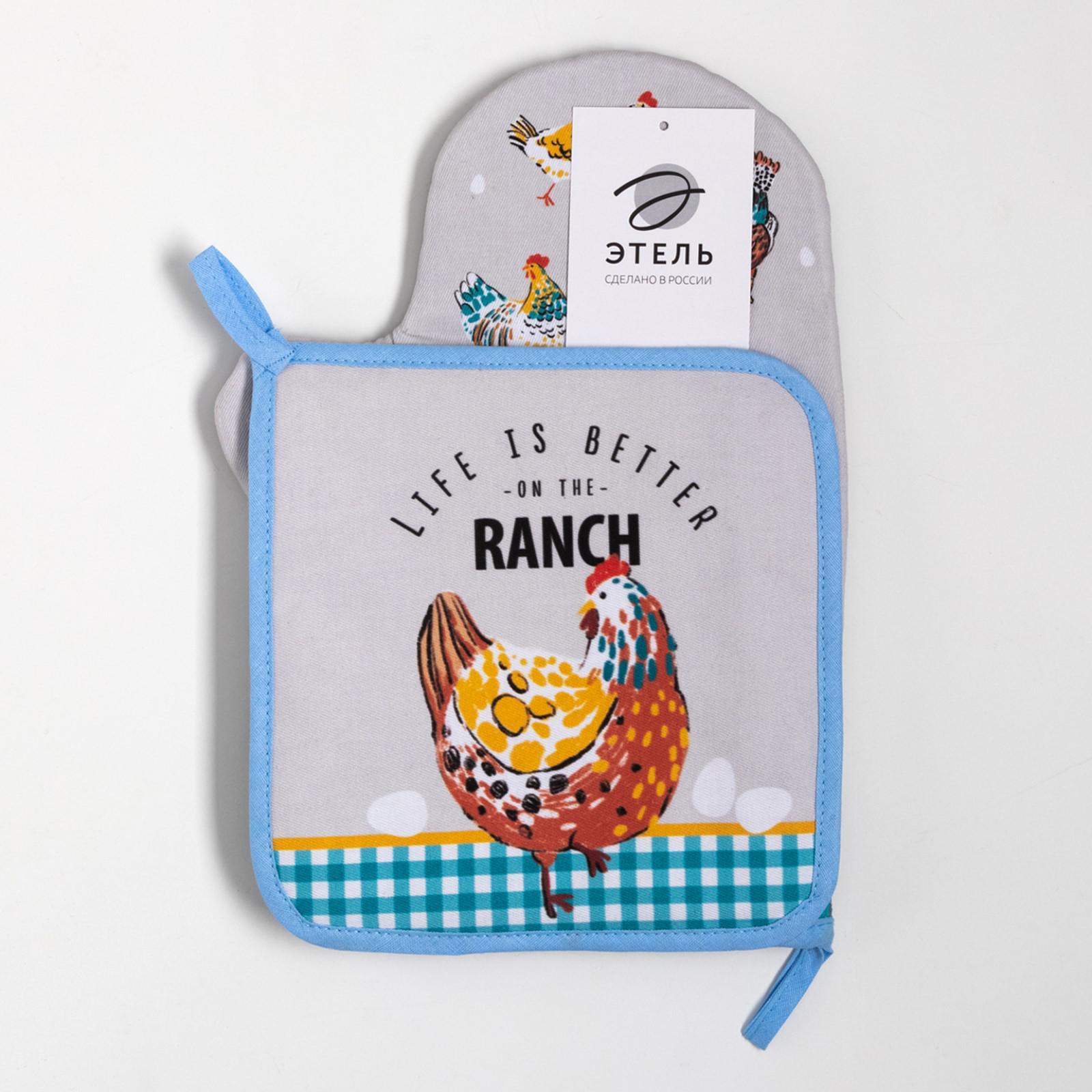 Кухонный набор этель "Chicken Ranch": варежка-прихватка 20х28 см, прихватка 19х19 см, 100% хлопок