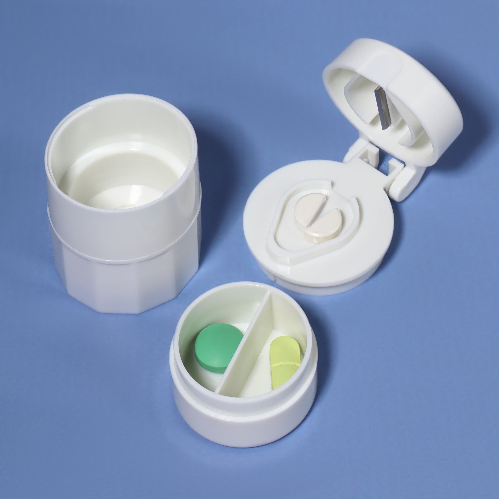 Таблетница с таблеторезкой, размельчителем и мензуркой, D = 4 X 6,5 см, цвет белый