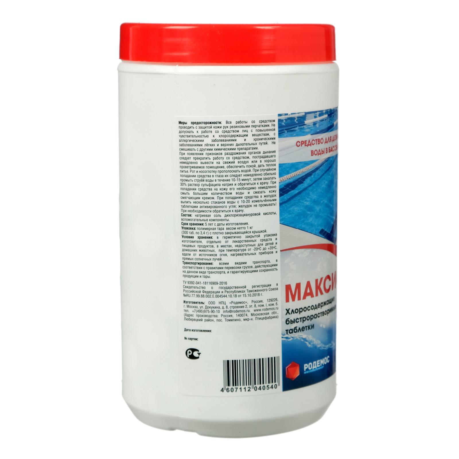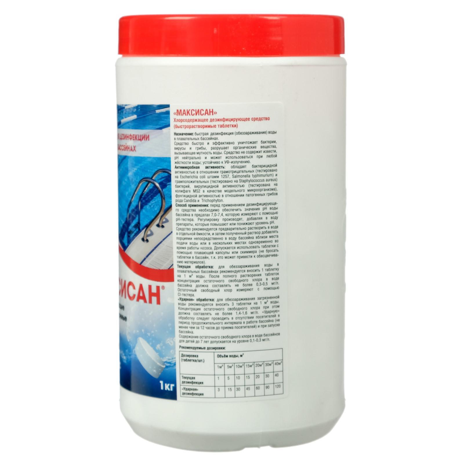 Хлорная таблетка "максисан" быстрорастворимая туба, 1 кг. Описание: дезинфицирующее средство, представляет собой хлорсодержащие быстрорастворимые таблетки. Назначение: предназначено для обеззараживания воды в системах хозяйственно-питьевого водоснабжения при централизованном водоснабжении; обеззараживания групповых запасов воды при нецентрализованном водоснабжении, а также емкостей для хранения воды, дезинфекции шахтных колодцев и обеззараживанию воды в них, обеззараживания воды плавательных бассейнов, дезинфекции различных объектов в помещениях бассейна (поверхности ванны бассейна, раздевальнях, душевых, резиновых ковриков, уборочного инвентаря и т. д. ). Средство предназначено для применения специалистами предприятий, организаций, учреждений, деятельность которых связана с эксплуатацией плавательных бассейнов, а также работников дезинфекционных станций, других учреждений, имеющих право заниматься дезинфекционной деятельностью, населением в быту в соответствии с этикеткой для быта. Применение: обеззараживание воды в системах хозяйственно-питьевоrо водоснабжения при централизованном водоснабжении. Для обеззараживания воды в системах хозяйственно-питьевого водоснабжения при централизованном водоснабжении рекомендуется применять средство в виде таблеток или гранул. В целях установления рабочей дозы средства для хлорирования опытным путем проводиться определение количества остаточного активного хлора, которое зависит от величины хлорпоглащаемости воды. Содержание остаточного хлора при этом должно быть не менее 0, 3 и не более О, 5мг/л при времени контакта воды с хлором в течение 30 мин; обеззараживание групповых запасов воды при нецентрализованном водоснабжении. Обеззараживание воды из нецентрализованных источников, в полевых и экстремальных условиях, непосредственно из источника (колодцы, родники, артезианские скважины, речная, озерная, прудовая и т. п. ), требующей обеззараживания в отношении бактерий и вирусов (в том числе по эпидпоказаниям) производится в чистых емкостях -резервуарах, автоцистернах, бочках, баках или другой специальной таре; при обеззараживании мутной и высокоцветной воды рекомендуется ее предварительная фильтрация через мелкотканевый фильтр; при обеззараживании воды, не требующей очистки (водопроводной, колодезной, артезианской), концентрация остаточного свободного хлора должна составлять не менее 0, 3-0, 5 мг/л через 30 мин после распада таблетки; рабочая доза средства определяется опытным путем из расчета постоянного подержания концентрации остаточного свободного хлора 0, 3-0, 5 мг/л. Значение рН обрабатываемой воды при этом должно постоянно поддерживаться в пределах 7, 0-7, 4. Состав: натриевая соль дихлоризационуровой кислоты, вспомогательные компоненты. Вес, кг/Объём, л: 1 Вид средства: Хлорсодержащие Форма выпуска: Таблетки Температурное ограничение: Нет  развернуть описание ▼