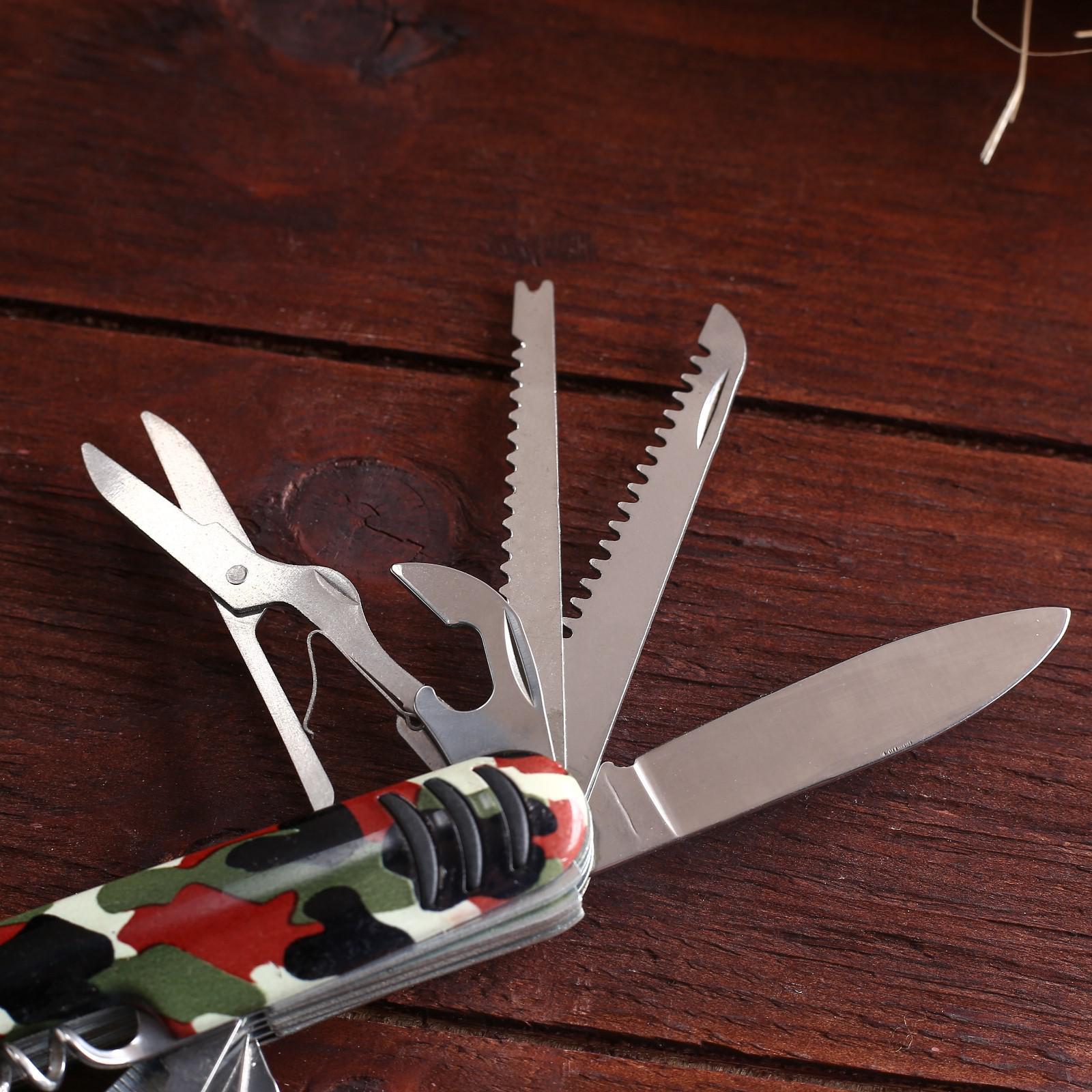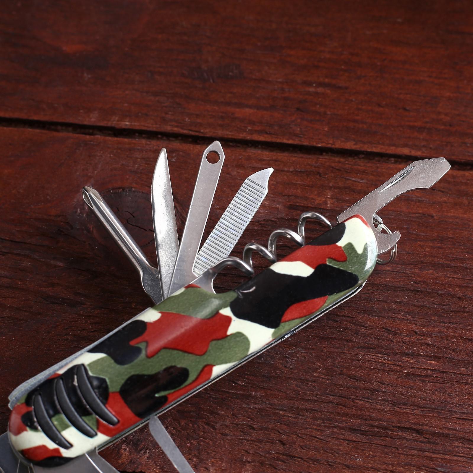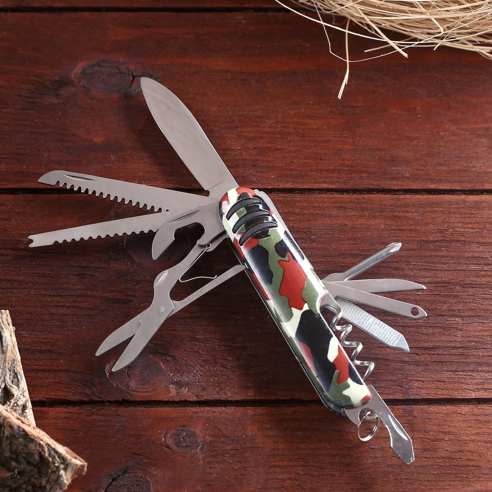 Нож швейцарский камуфляж 12в1. Нож швейцарский Камуфляж 12в1 можно охарактеризовать двумя словами – удобный и функциональный. Такой перочинный нож станет для вас незаменимым помощником, например, дома, в паходе или на пикнике. Потому что вы будете обладать арсеналом самых необходимых инструментов. С их помощью непростая ситуация разрешится в два счета. Нож швейцарский Камуфляж 12в1 включает в себя: ножницы; консервный нож; два лезвия (ножи); открывалка для бутылок с отверткой;отвертка; две пилы по дереву; пилочка; шило; штопор. Цвет: Камуфляж Количество функций: 11 Материал ручки: Металл  развернуть описание ▼