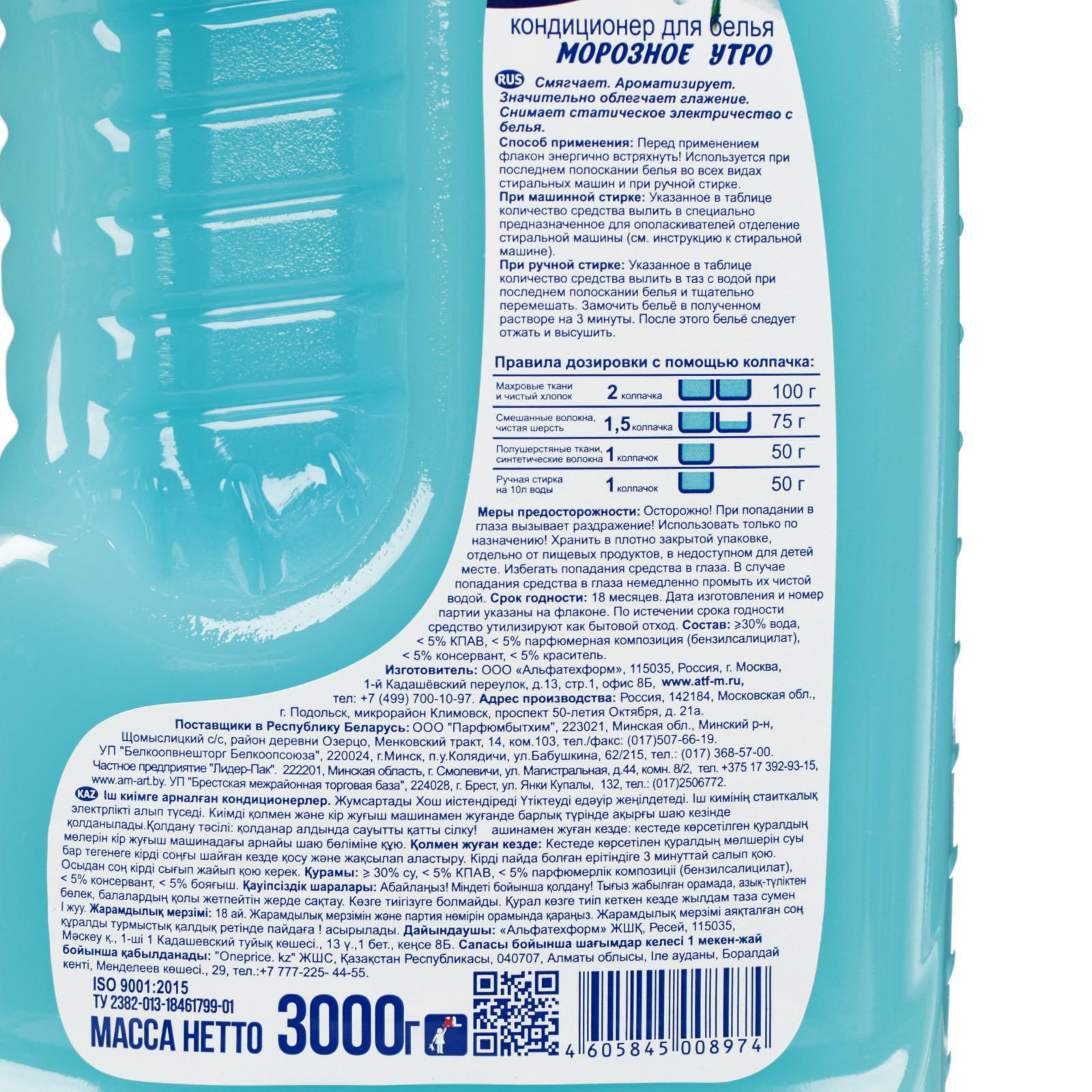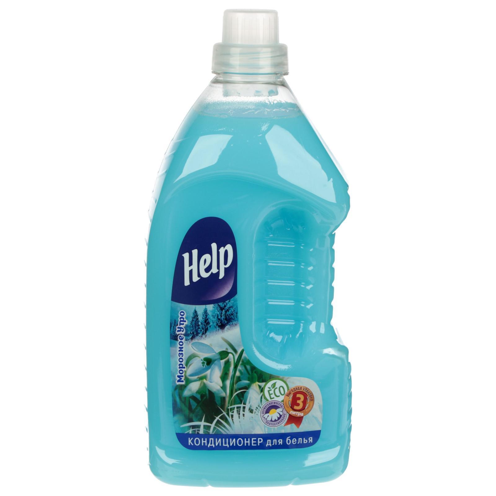 Кондиционер для белья help "морозное утро", 3 л. Кондиционер для белья, смягчает и ароматизирует. Значительно облегчает глажение. Снимает статическое электричество с белья. Способ применения: перед применением флакон энергично встряхнуть! Использовать при последнем полоскании. Указанное в таблице количество средства вылить в специально предназначенное для ополаскивателей отделение стиральной машины. (60 г-120 г в зависимости от типа материала). При ручном способе: указанное в таблице количество средства вылить в таз с водой при последнем полоскании и тщательно перемешать. Замочить белье на 3 минуты, затем отжать и высушить. (60 г на 10 л воды). Меры предосторожности: осторожно! При попадании в глаза вызывает раздражение. Использовать только по назначению. Избегать попадания средства в глаза Состав: 30% и более вода, менее 5%: КПАВ, отдушка, консервант, краситель. Объём, л: 3 Аромат: Морозная свежесть Назначение: Для всех видов тканей Температурное ограничение: Нет Особенности средства: Антистатический эффект  развернуть описание ▼
