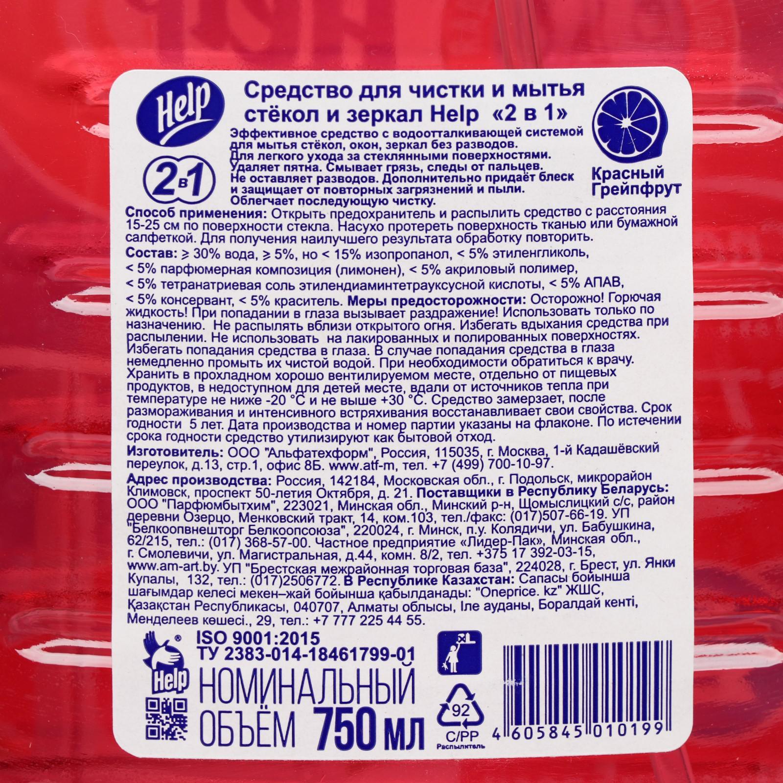 Средство для мытья стёкол Help "2 в 1", красный грейпфрут, 750 мл