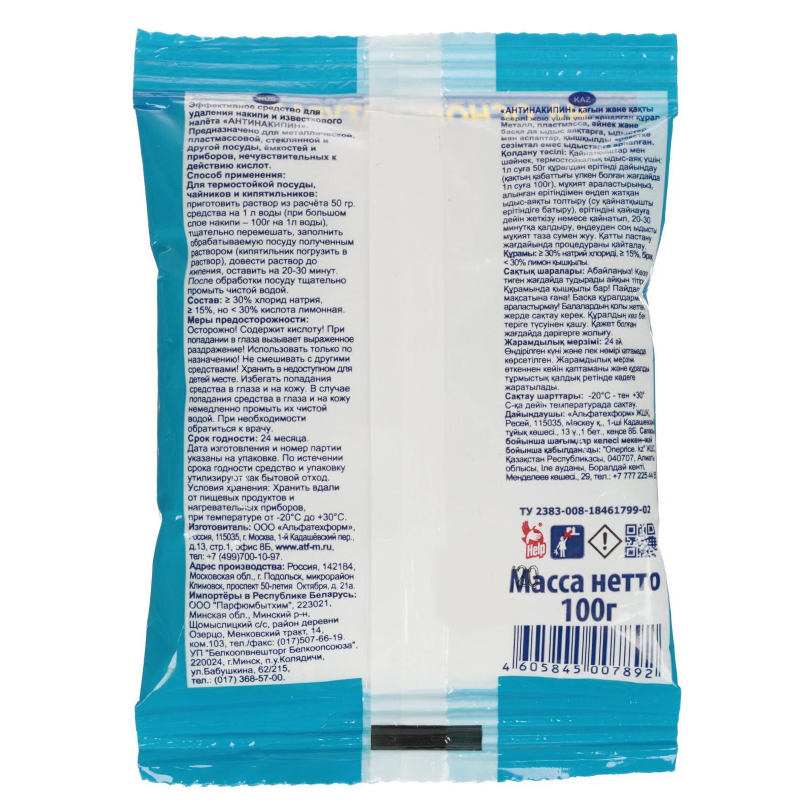 Чистящее средство "help" антинакипин 100 г. Чистящее средство "Help" Антинакипин - эффективное средство для удаления накипи с металлических, пластмассовых, стеклянных поверхностей. Регулярная очистка Антинакипином поможет содержать Вашу посуду и технику в чистоте и исправности. Препарат эффективно работает в воде любой жесткости и температуры. Состав: 30% хлорид натрия, 30% лимонная кислота. Форма выпуска: пакет 100 г Срок годности 24 мес. Назначение: Для кухонной техники Температурное ограничение: Нет  развернуть описание ▼